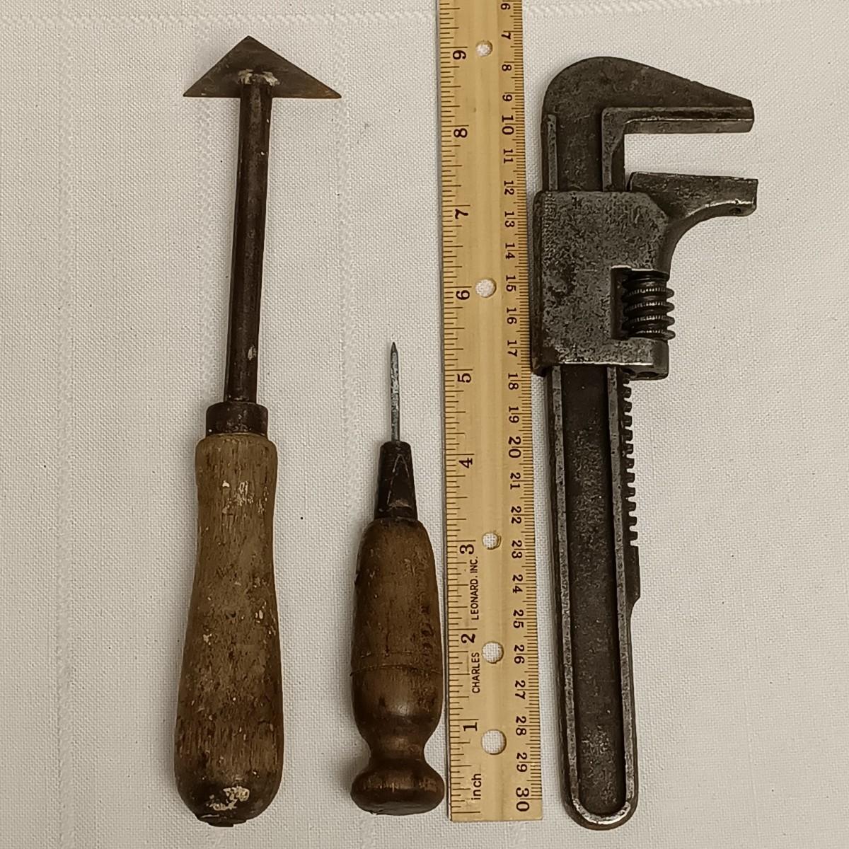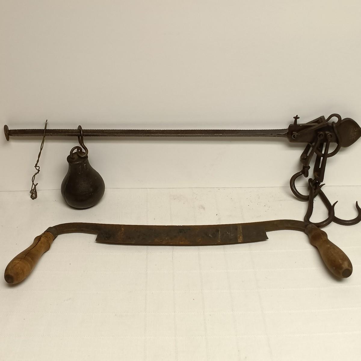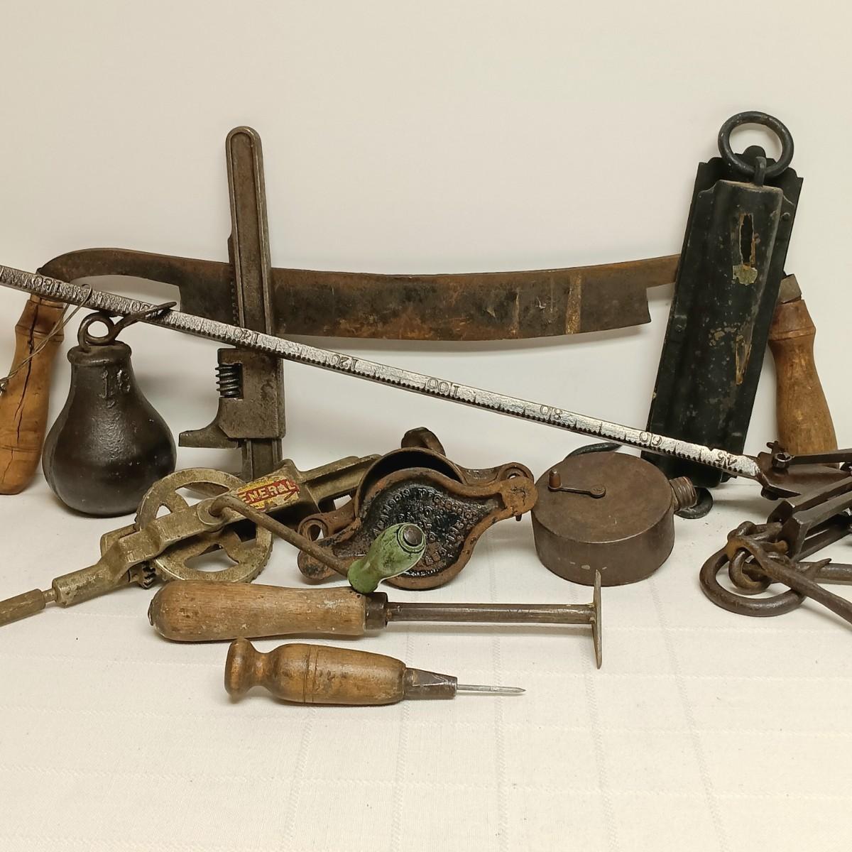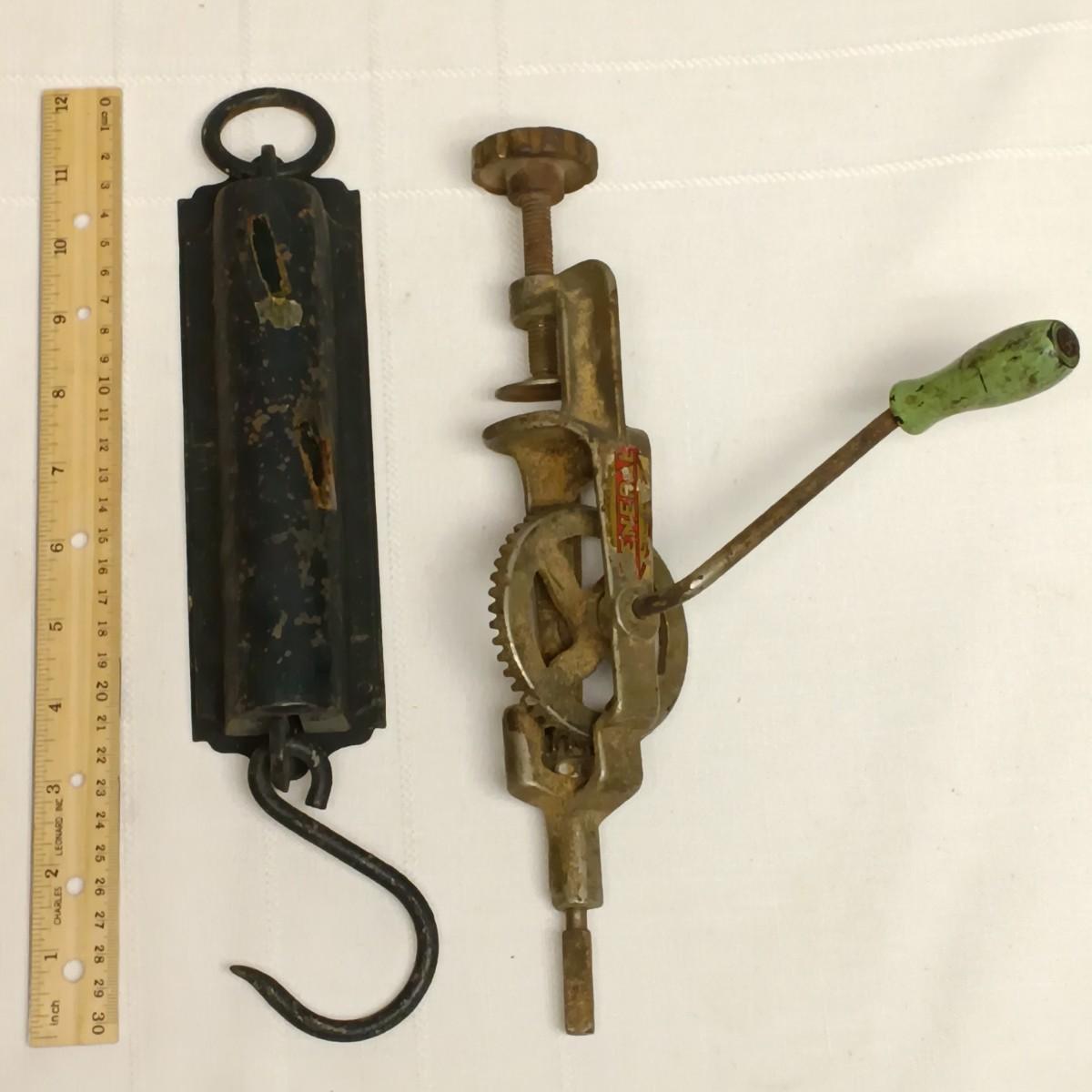 LOT 97B: Vintage Tool Collection- General Hand Drill, Balance Scale, Roman Scale, Draw Knife & More