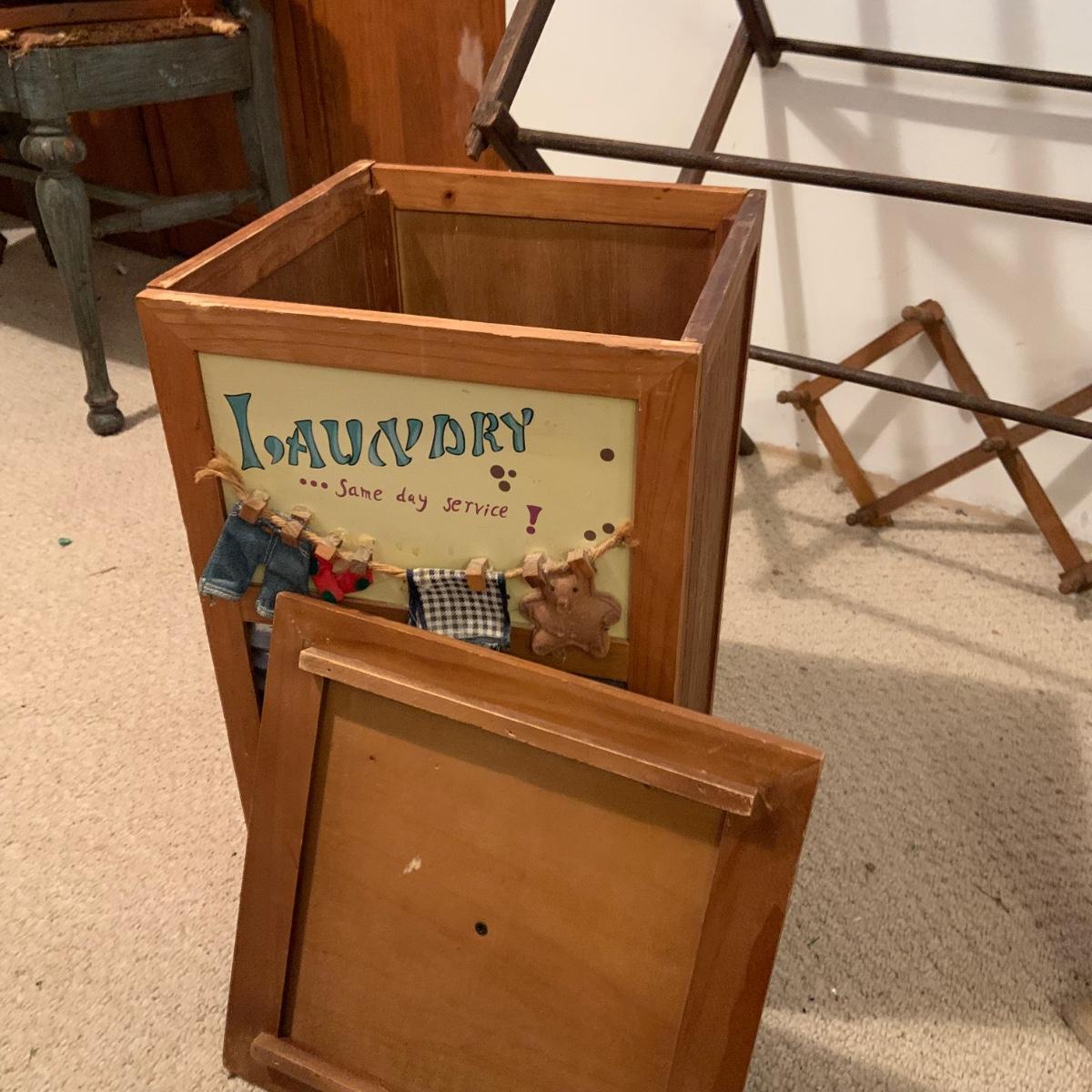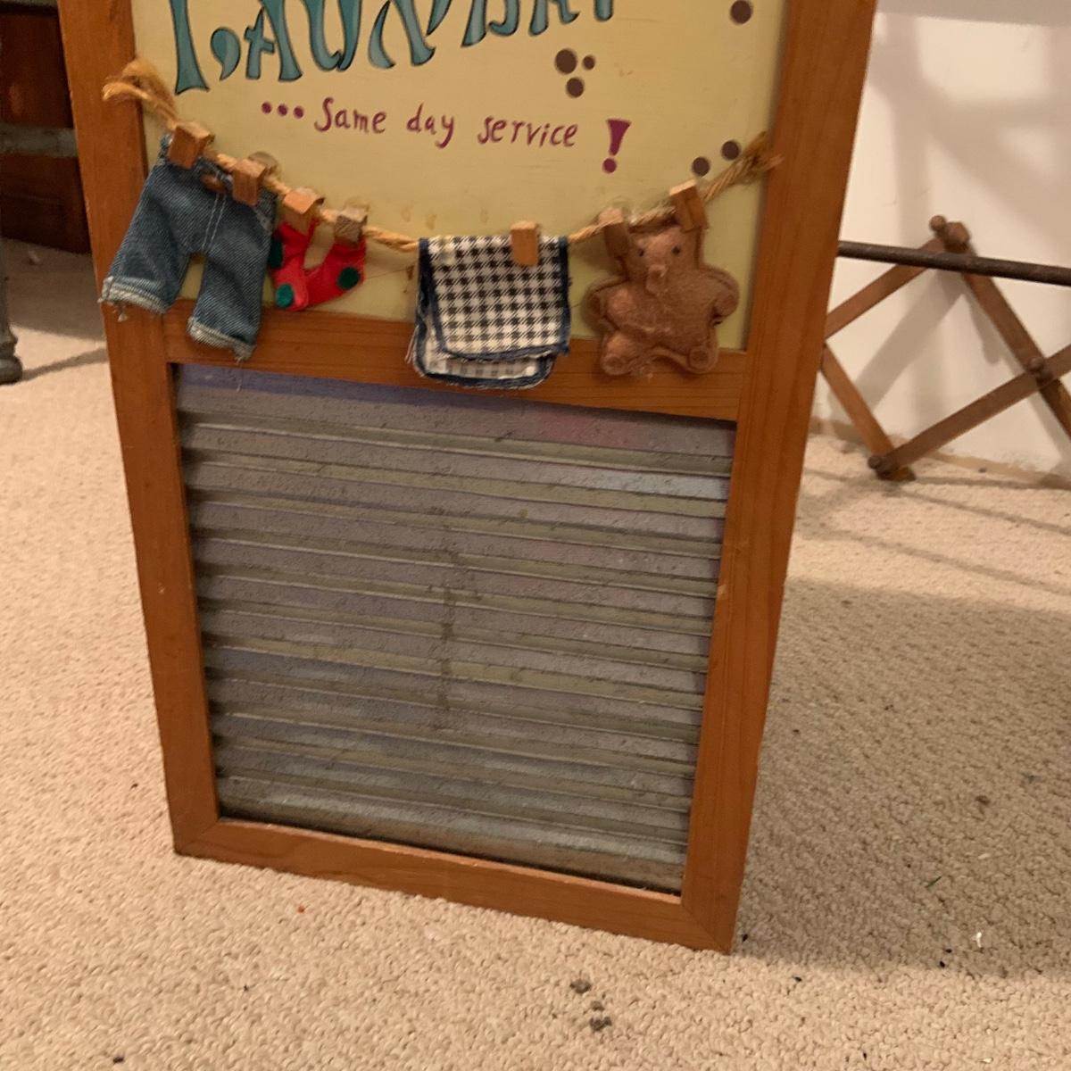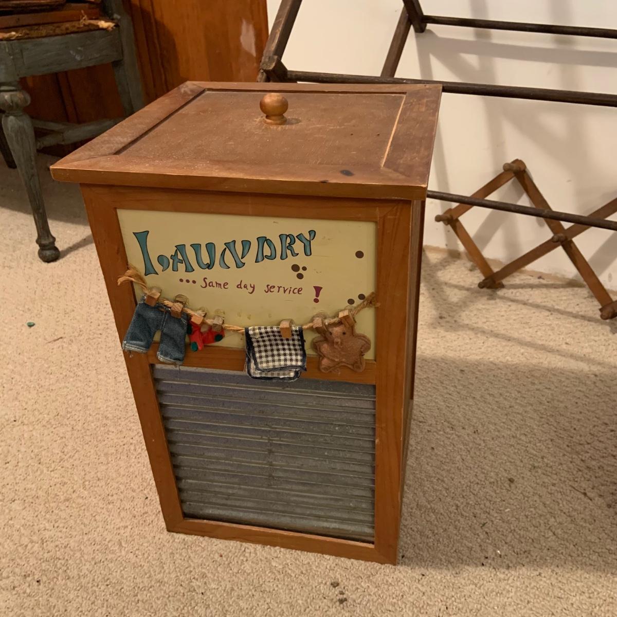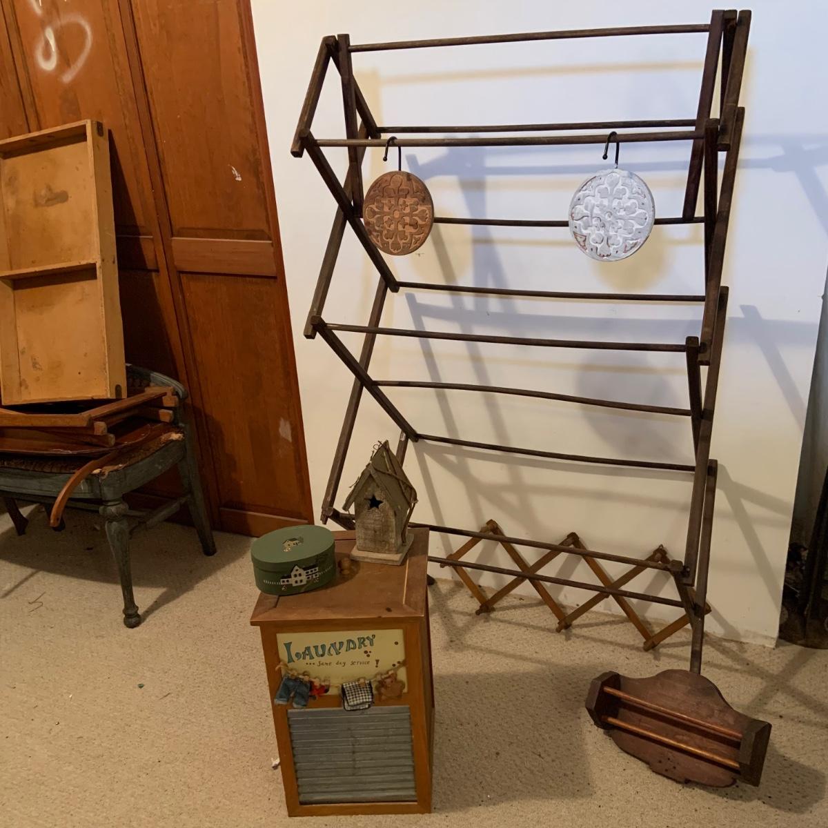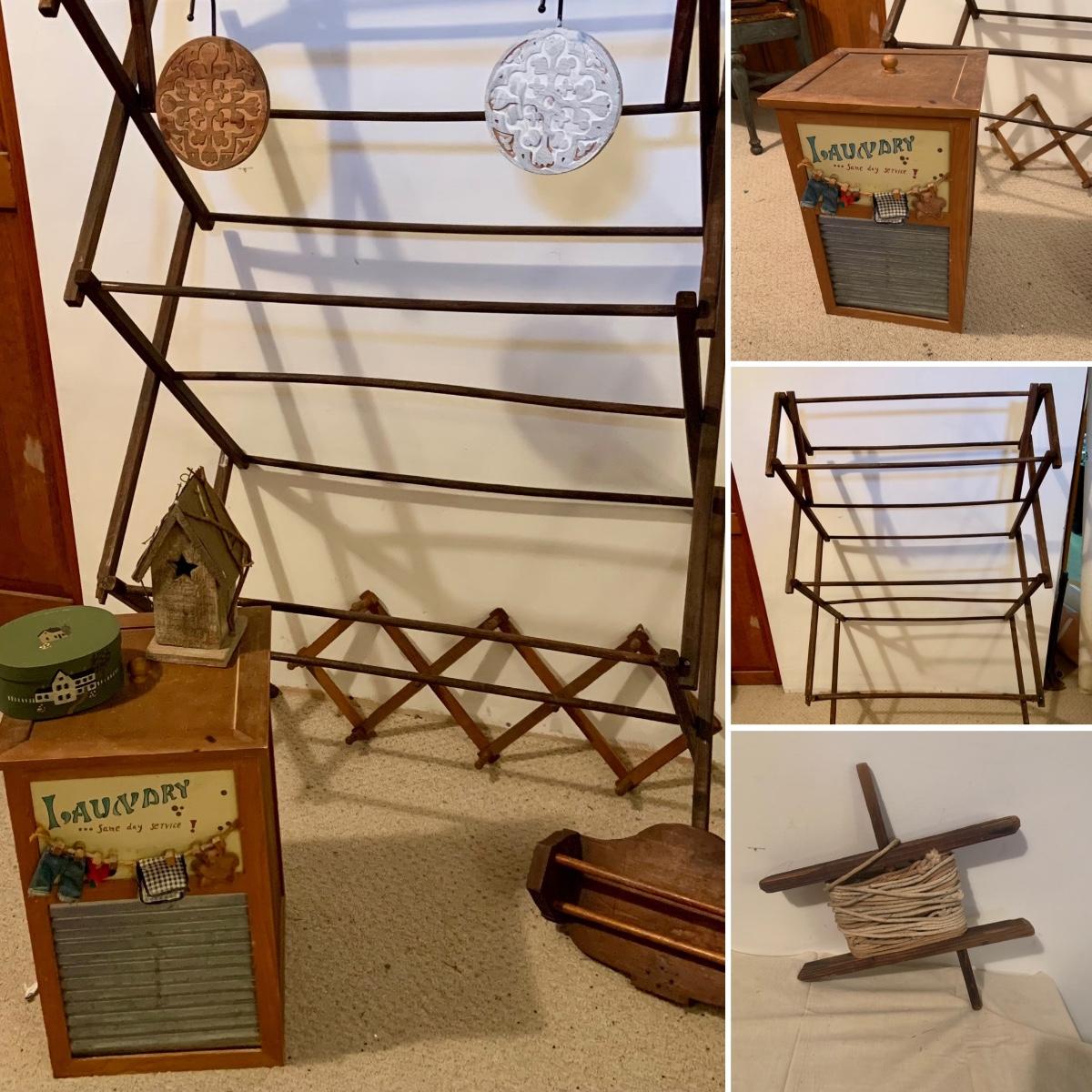LOT:114: Wash Day Necessities Including a Vintage Wood Drying Rack, Vintage Wooden Laundry Line Reel, Washboard Sqare Trashcan, Primitage Decor and More