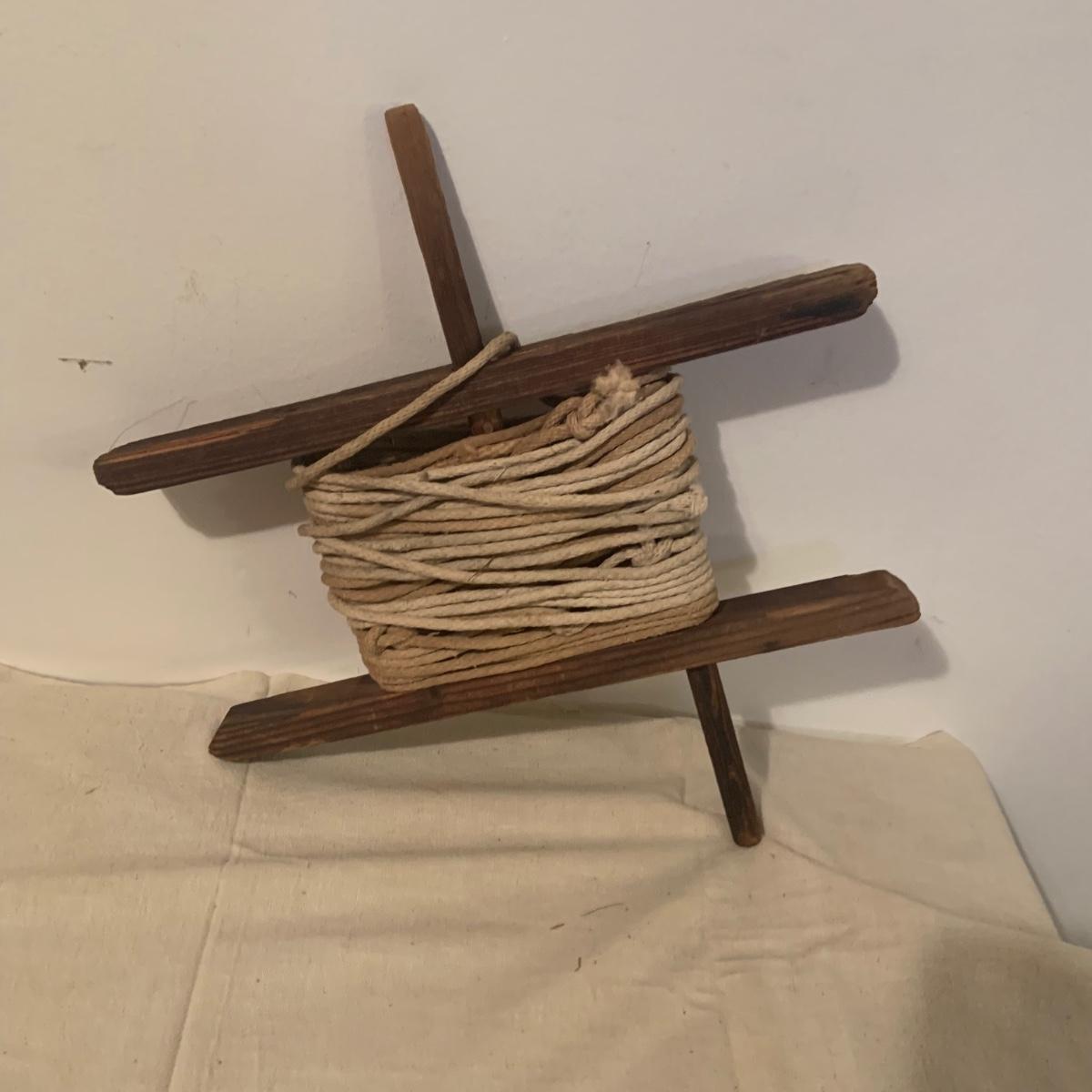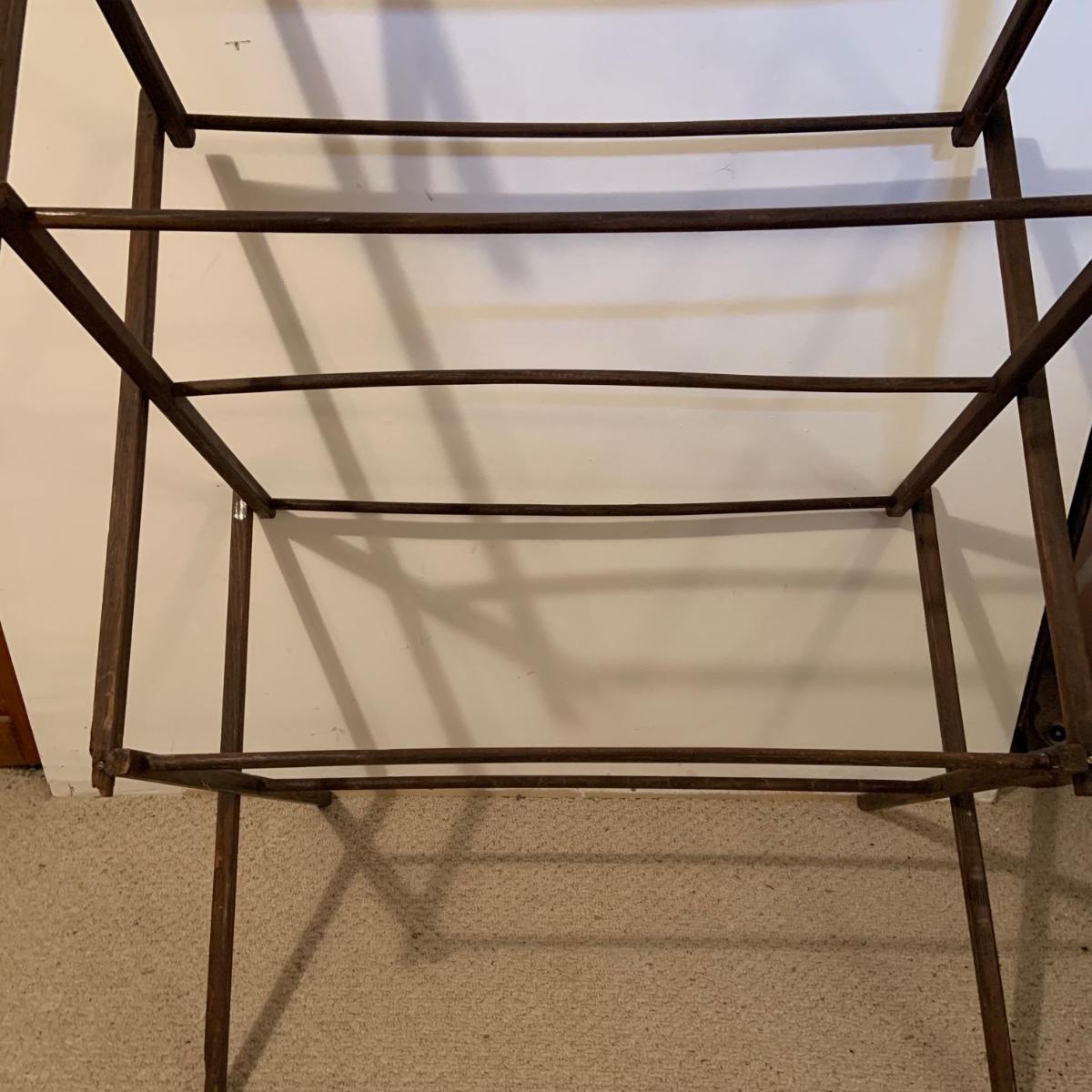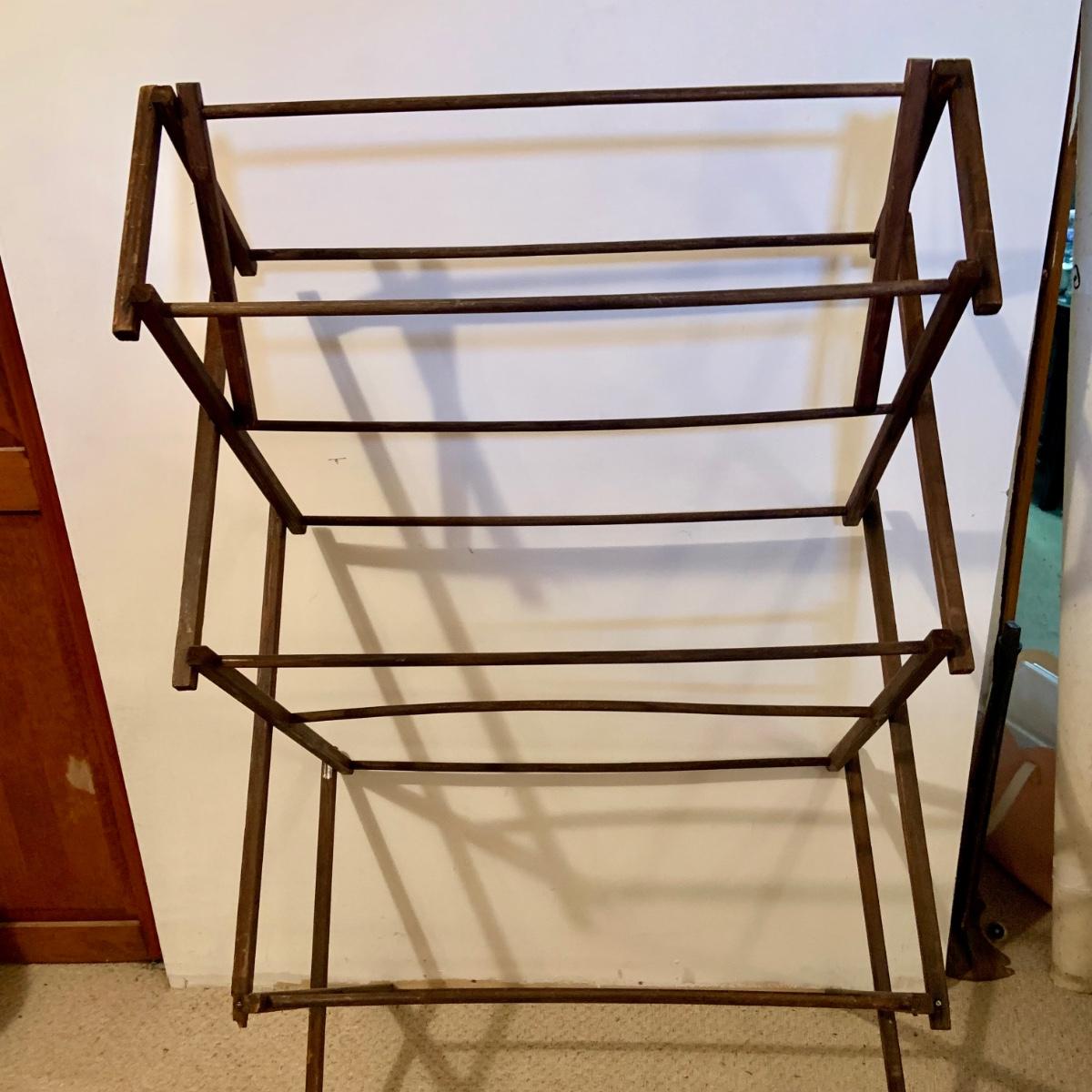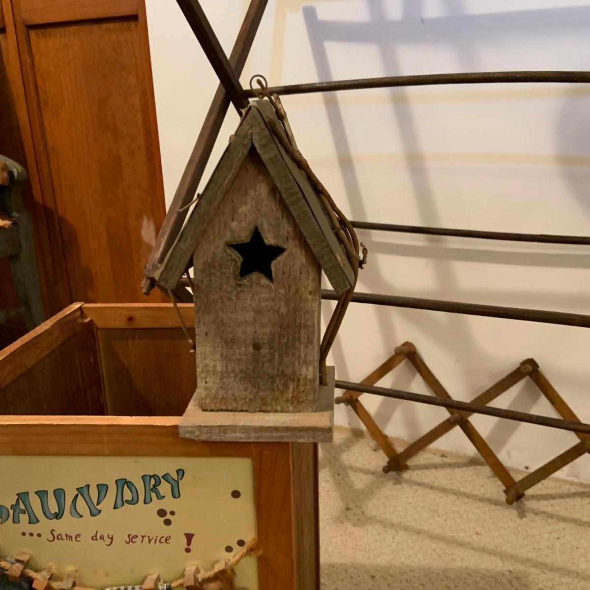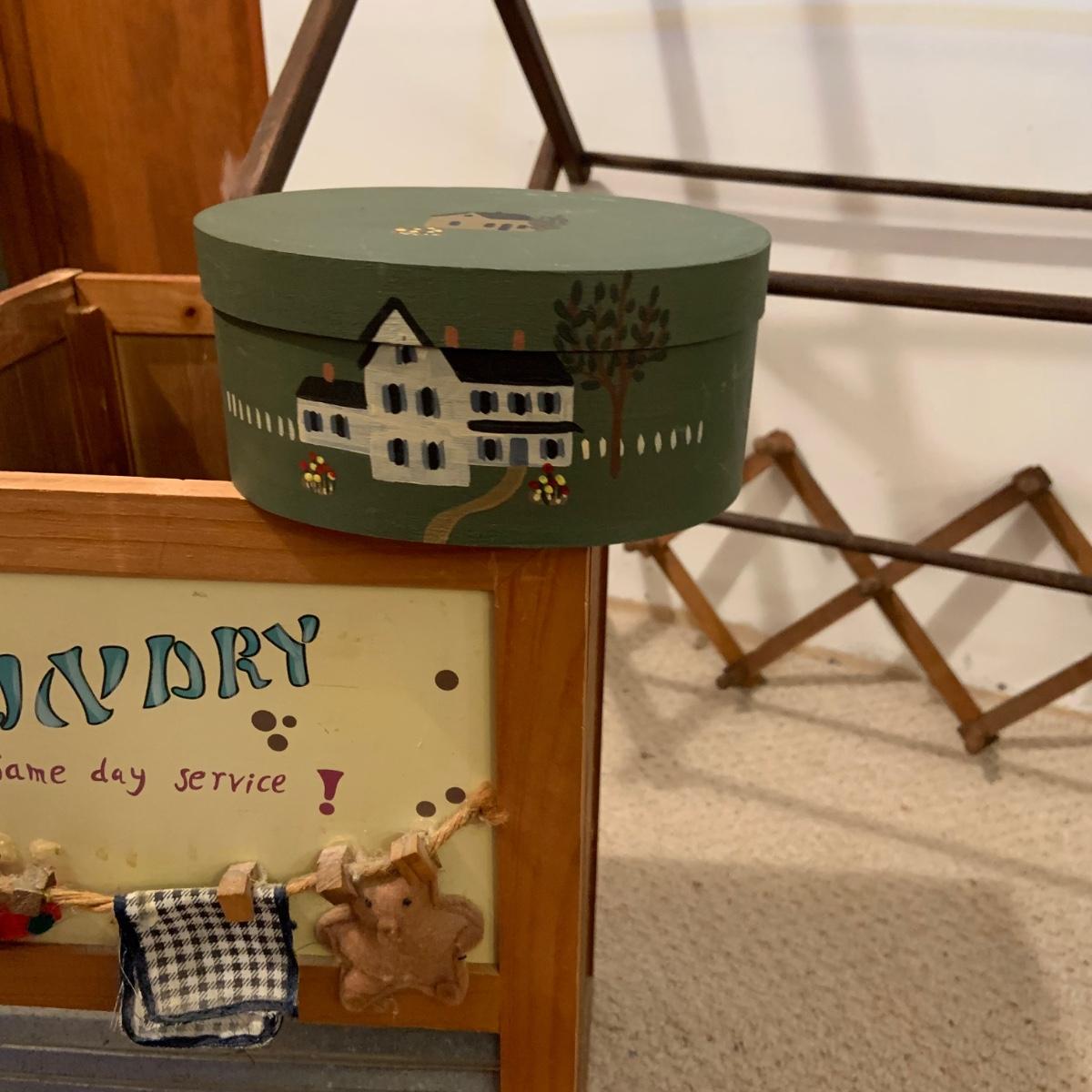 LOT:114: Wash Day Necessities Including a Vintage Wood Drying Rack, Vintage Wooden Laundry Line Reel, Washboard Sqare Trashcan, Primitage Decor and More