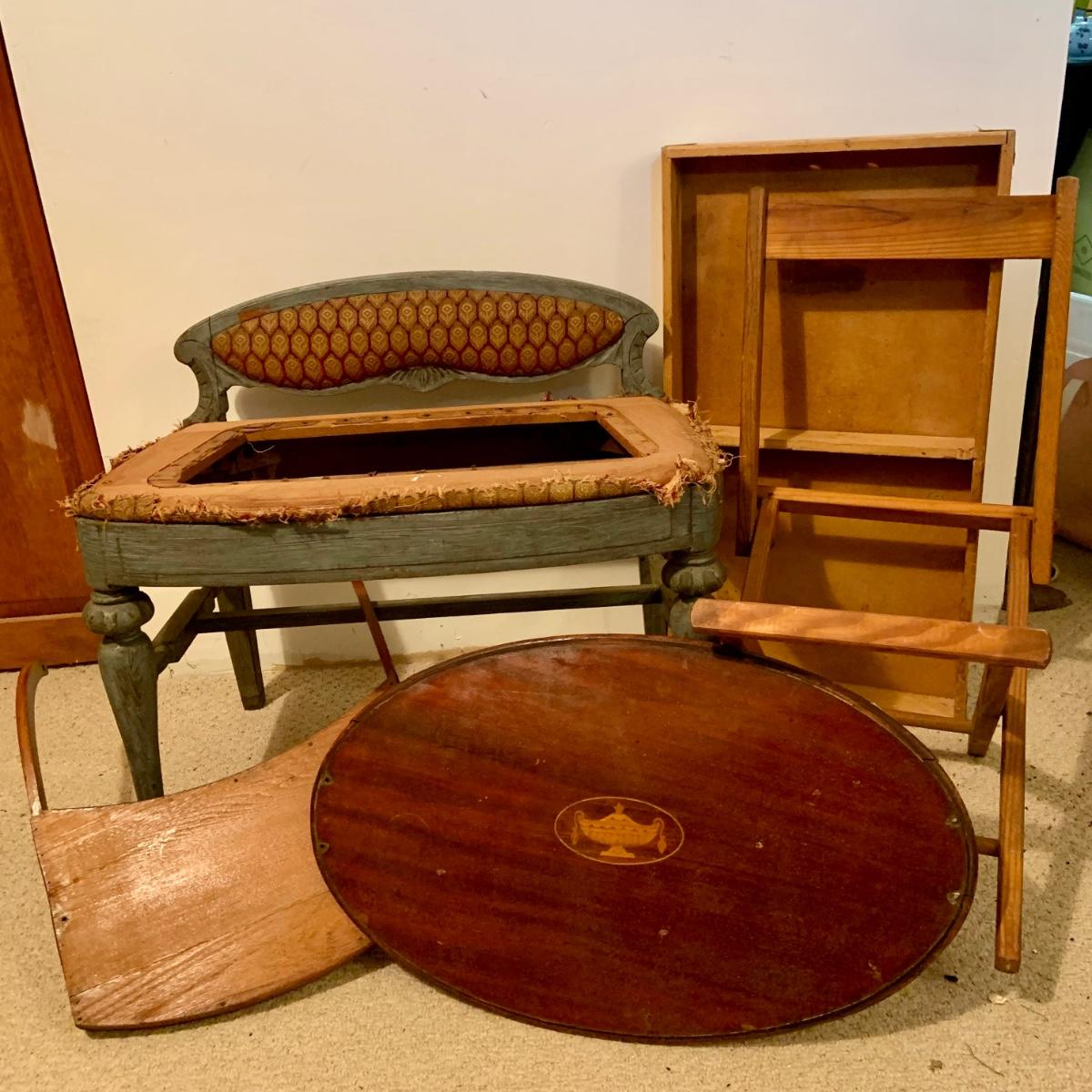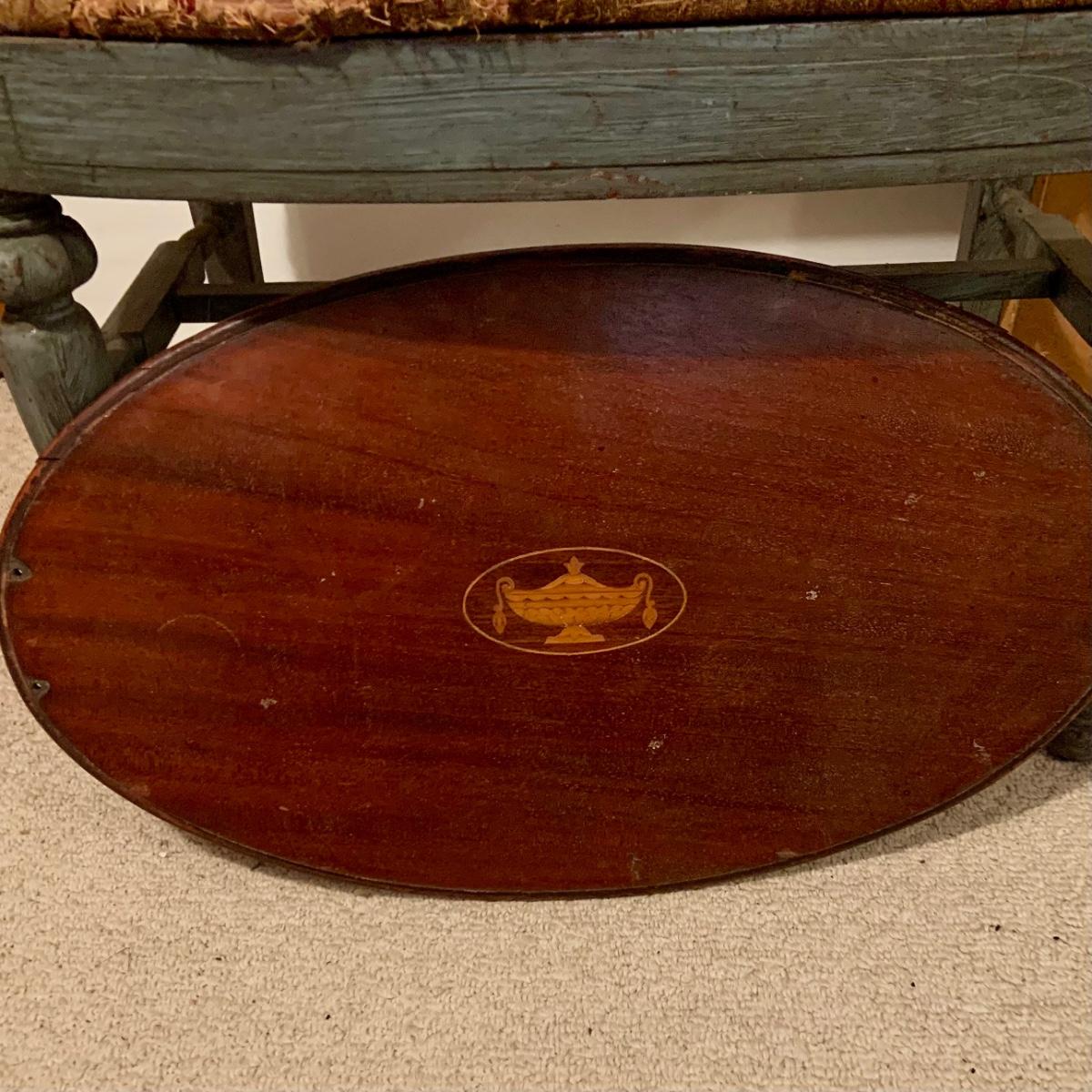 LOT:115: Vintage and Antique Trays and Chairs - Project Pieces Featuring an Mahogany Tray with Inlaid Center
