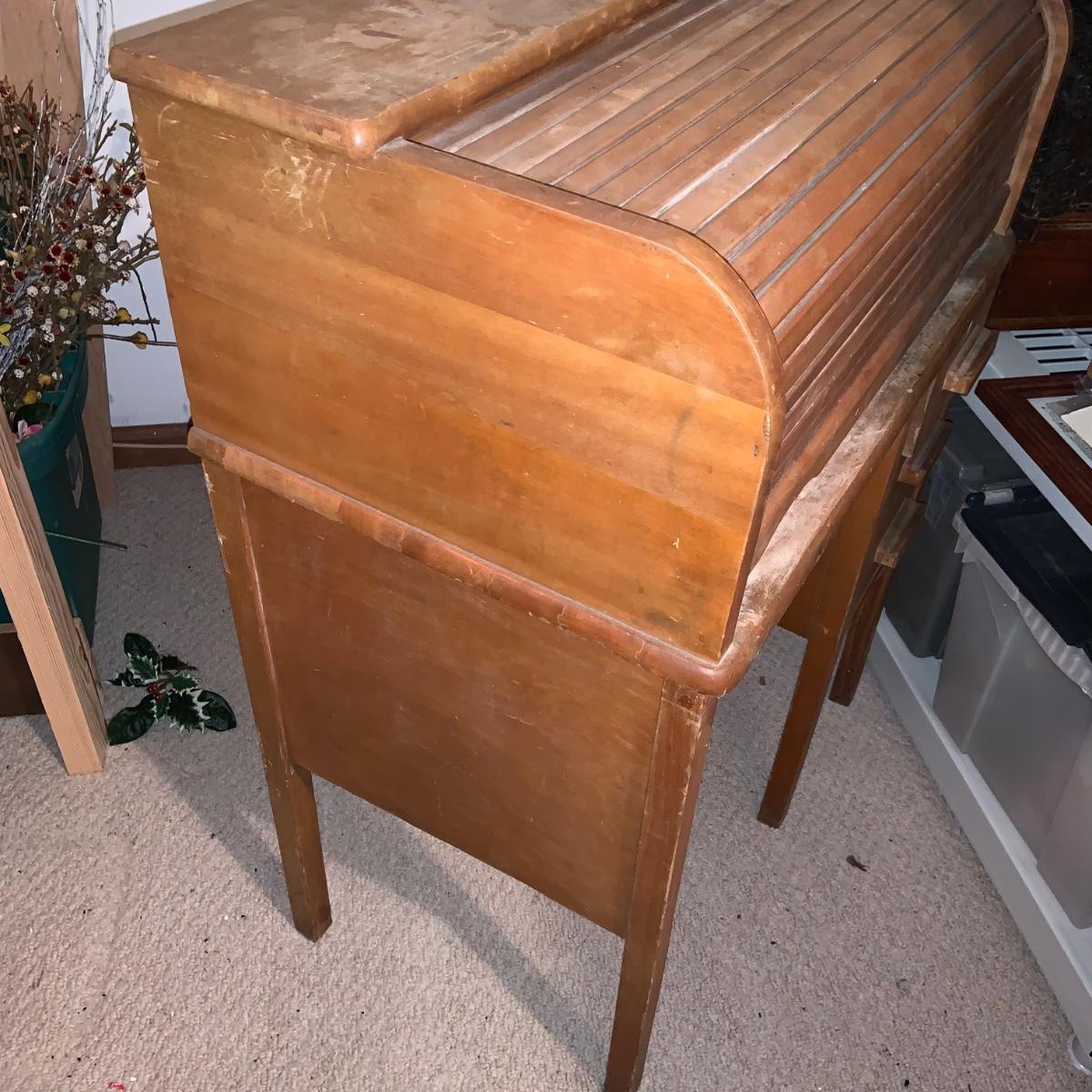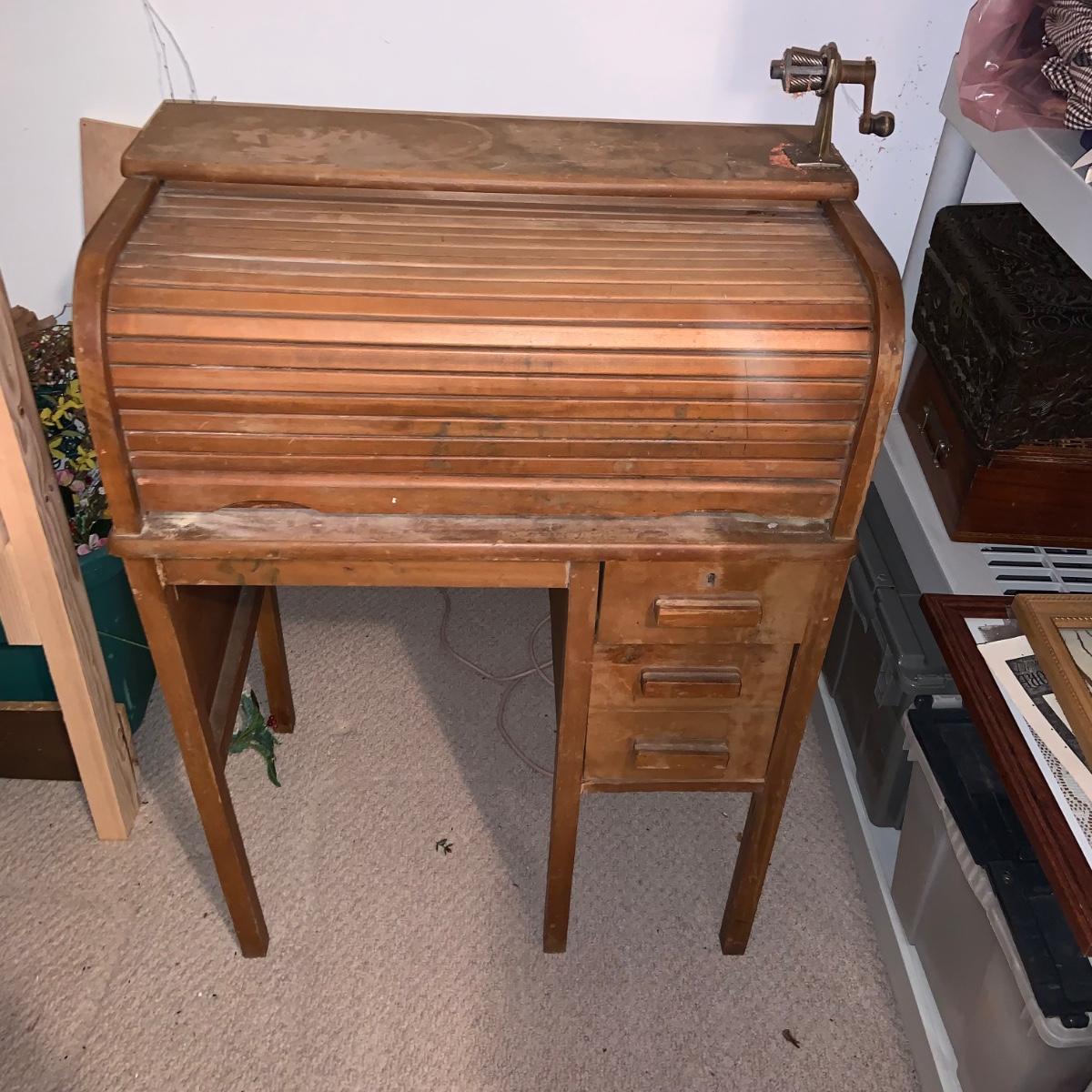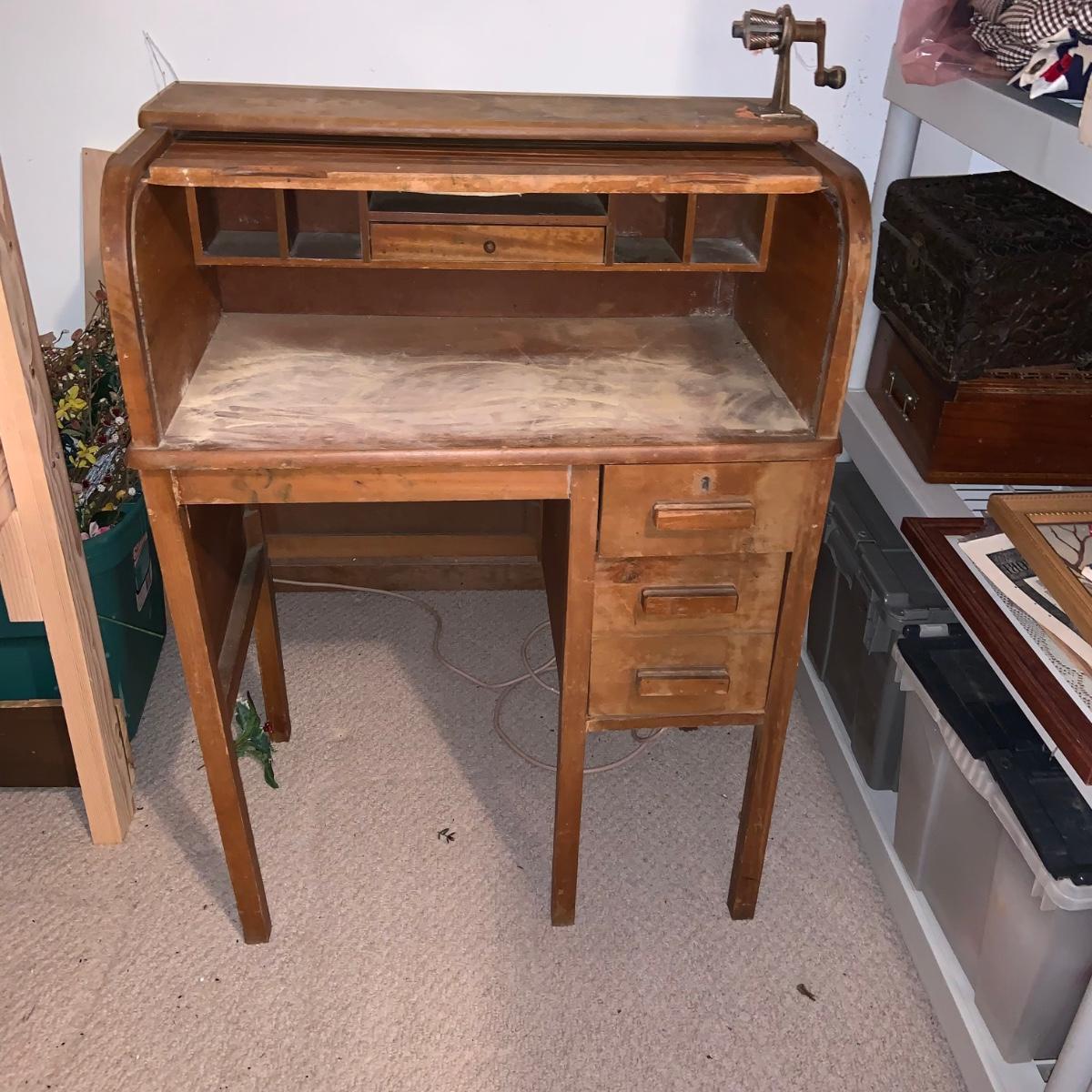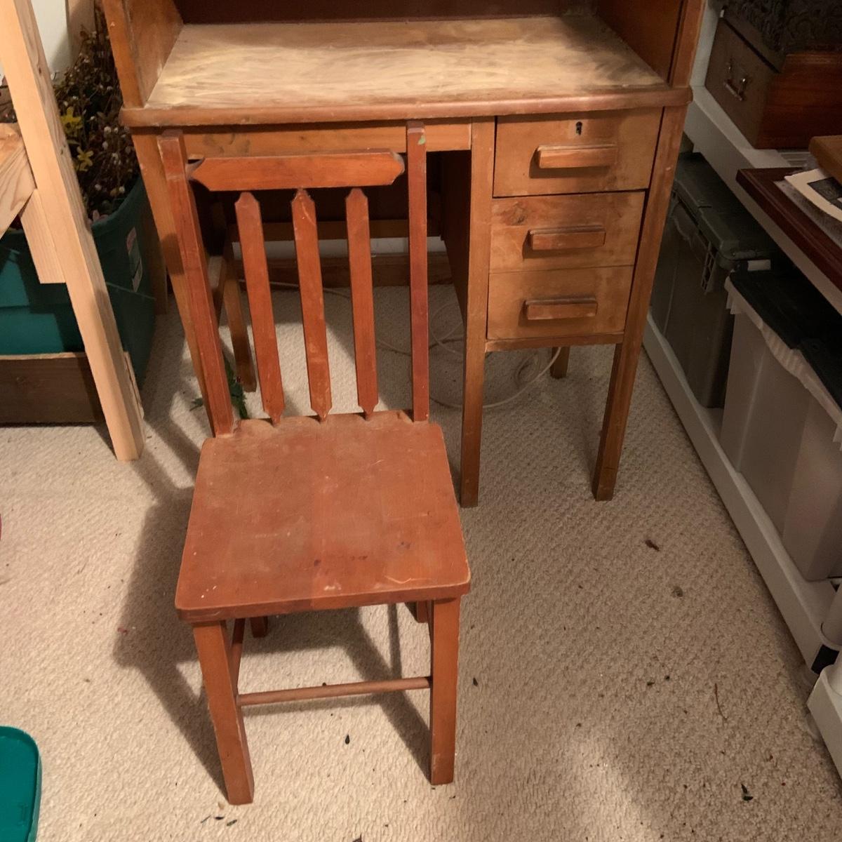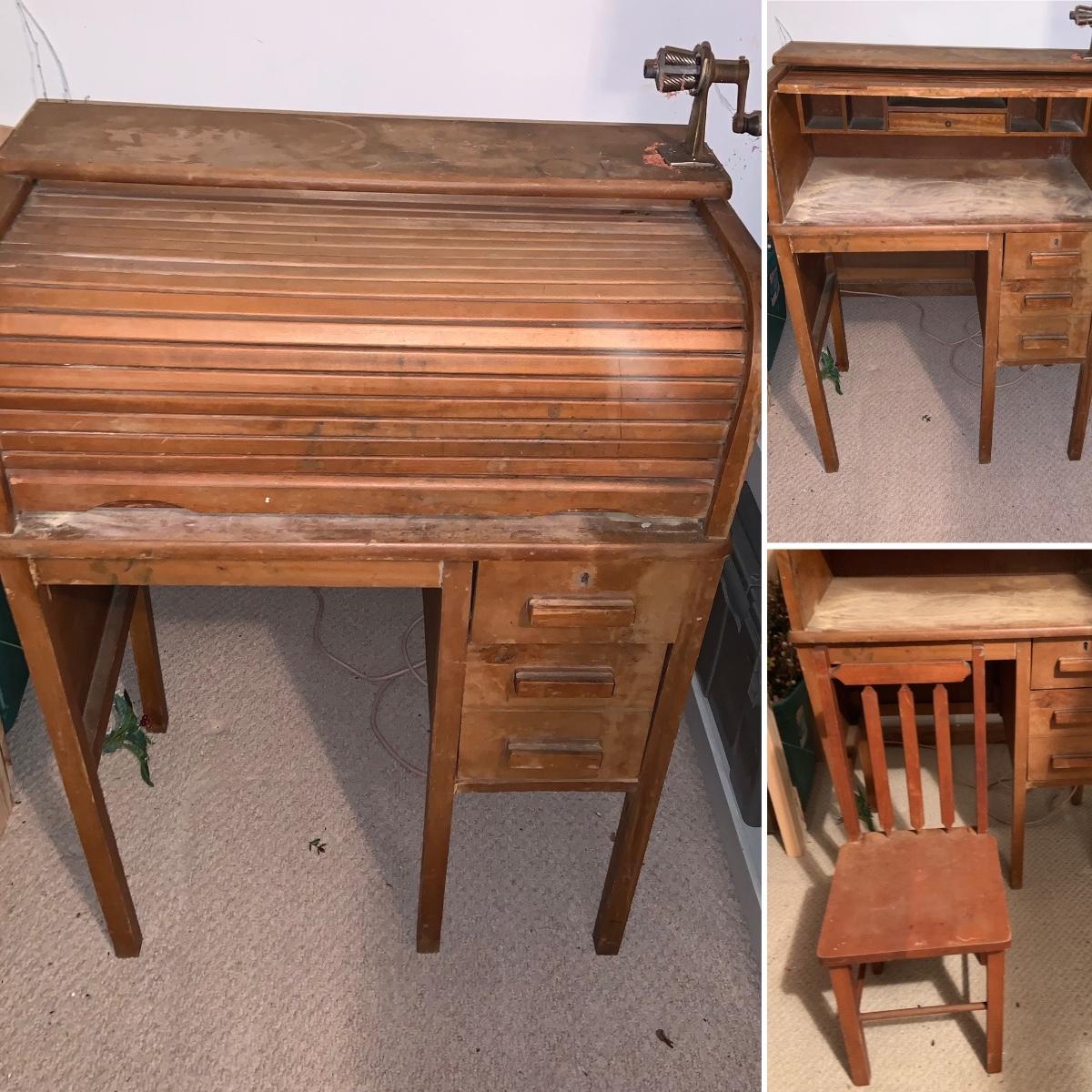 LOT:116: Child Sized /Student Wood Roll Top Desk and Chair.