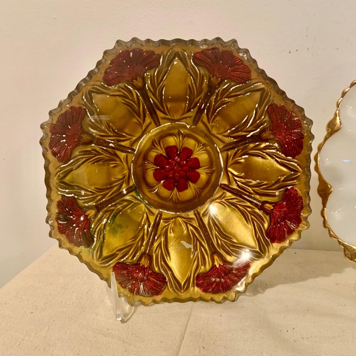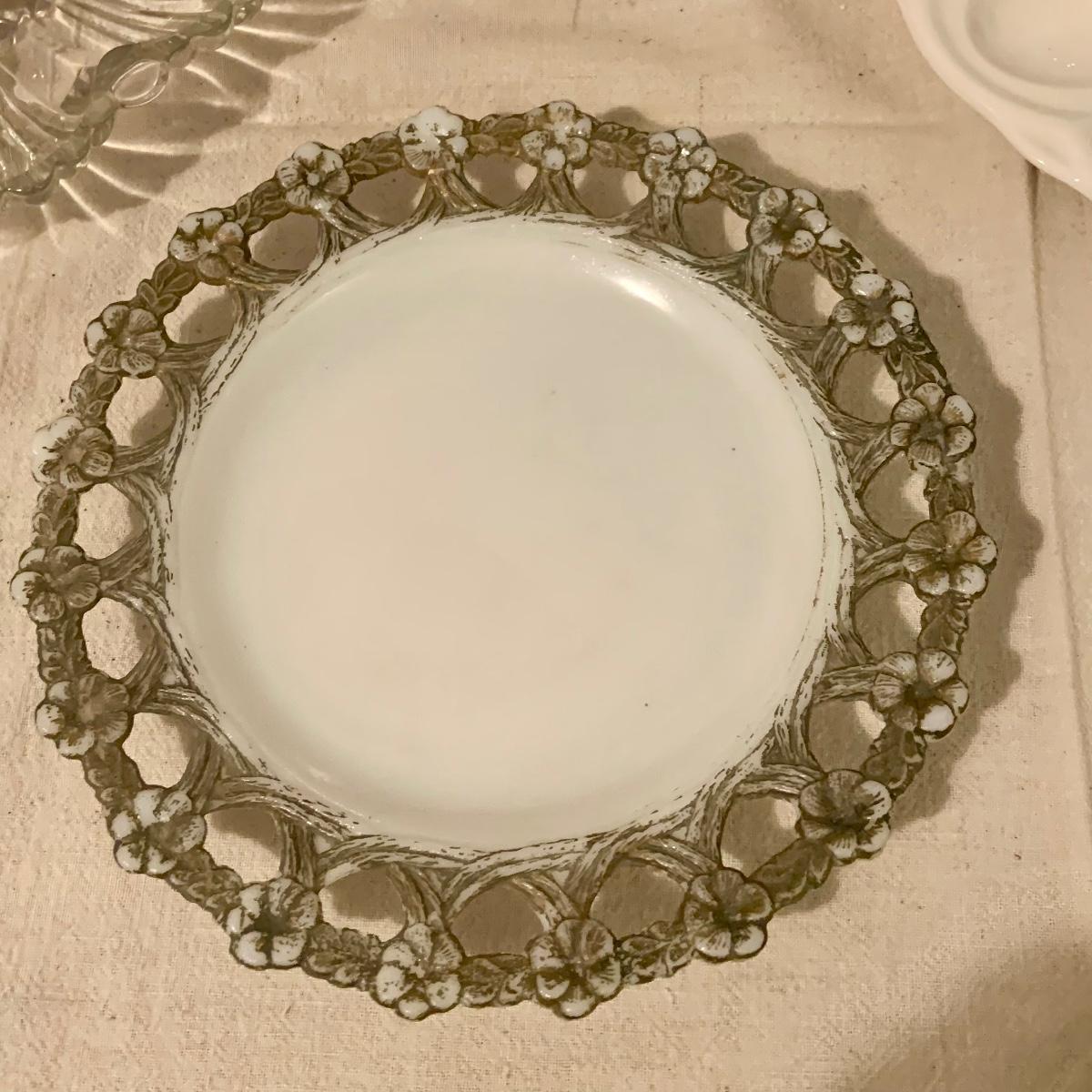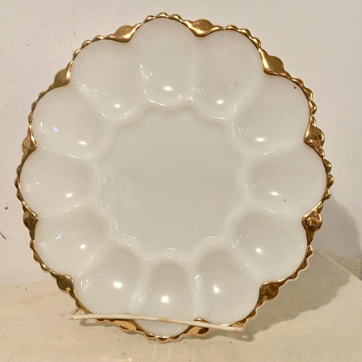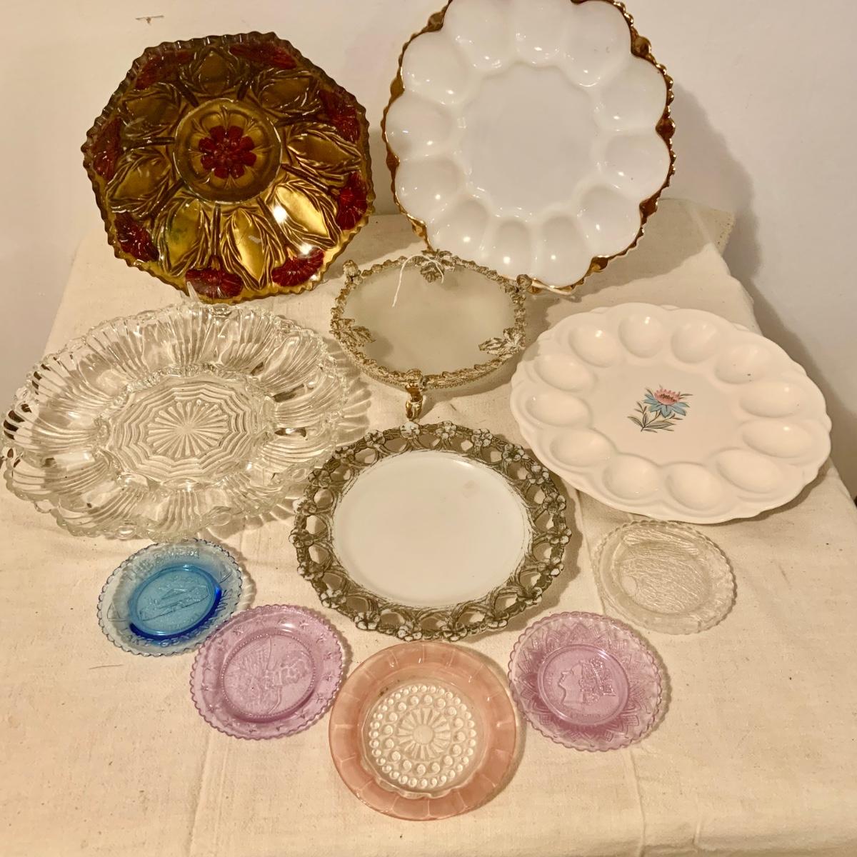 LOT:131: Dishes for Spring Including Egg Platters, Milk Glass Cake Plate, Bowl with Brass Cherbus Trim a Beautiful Gold and Floral Bowl and Much More