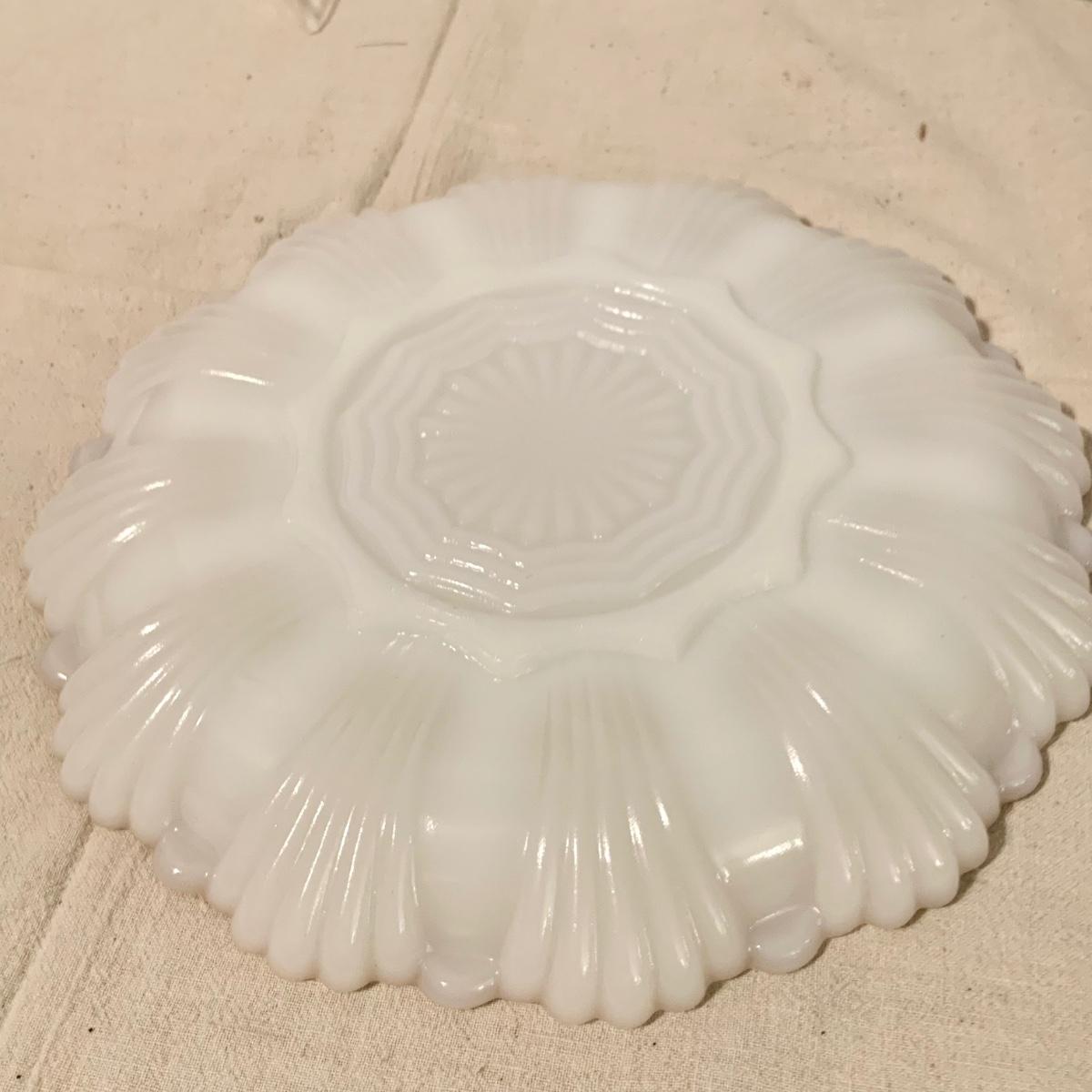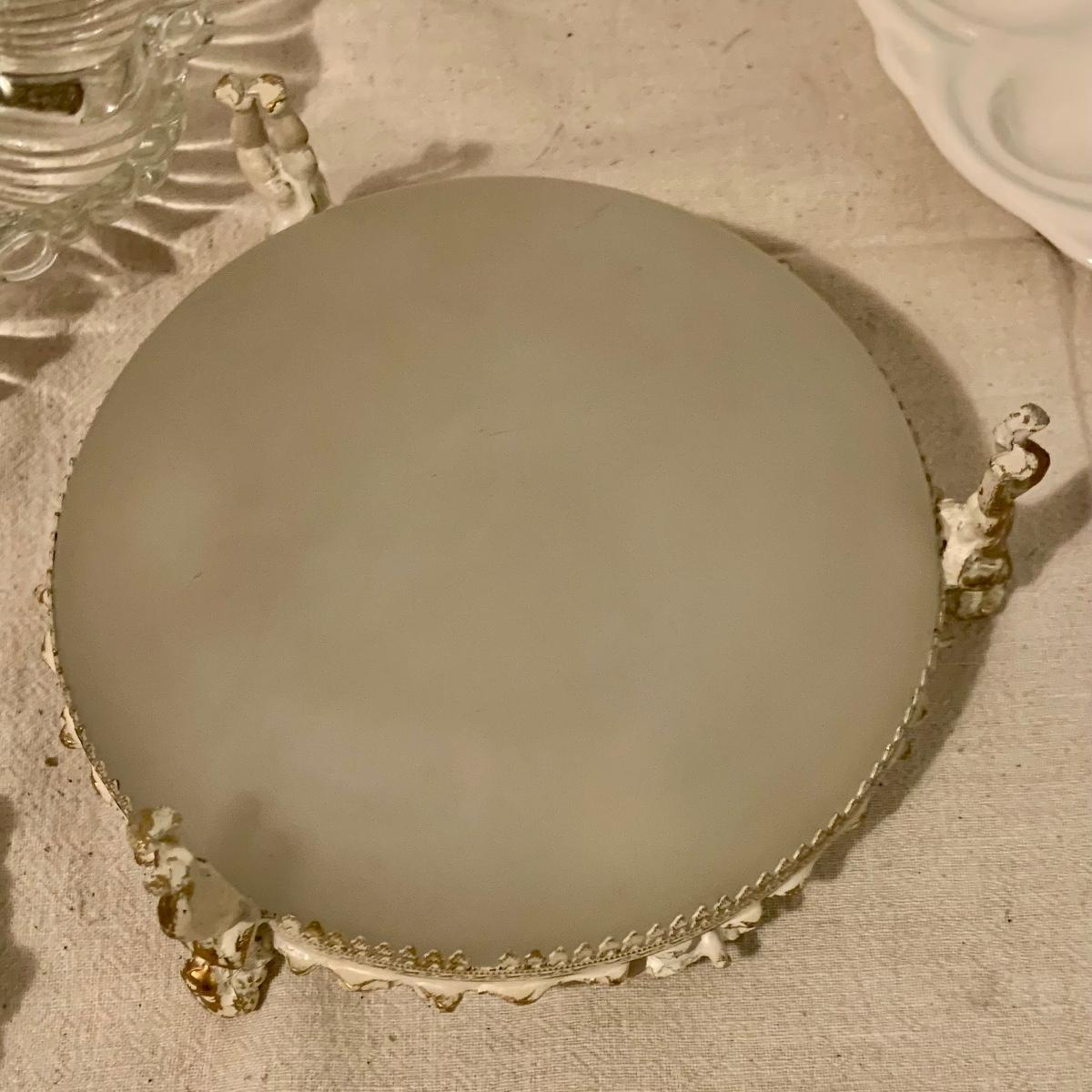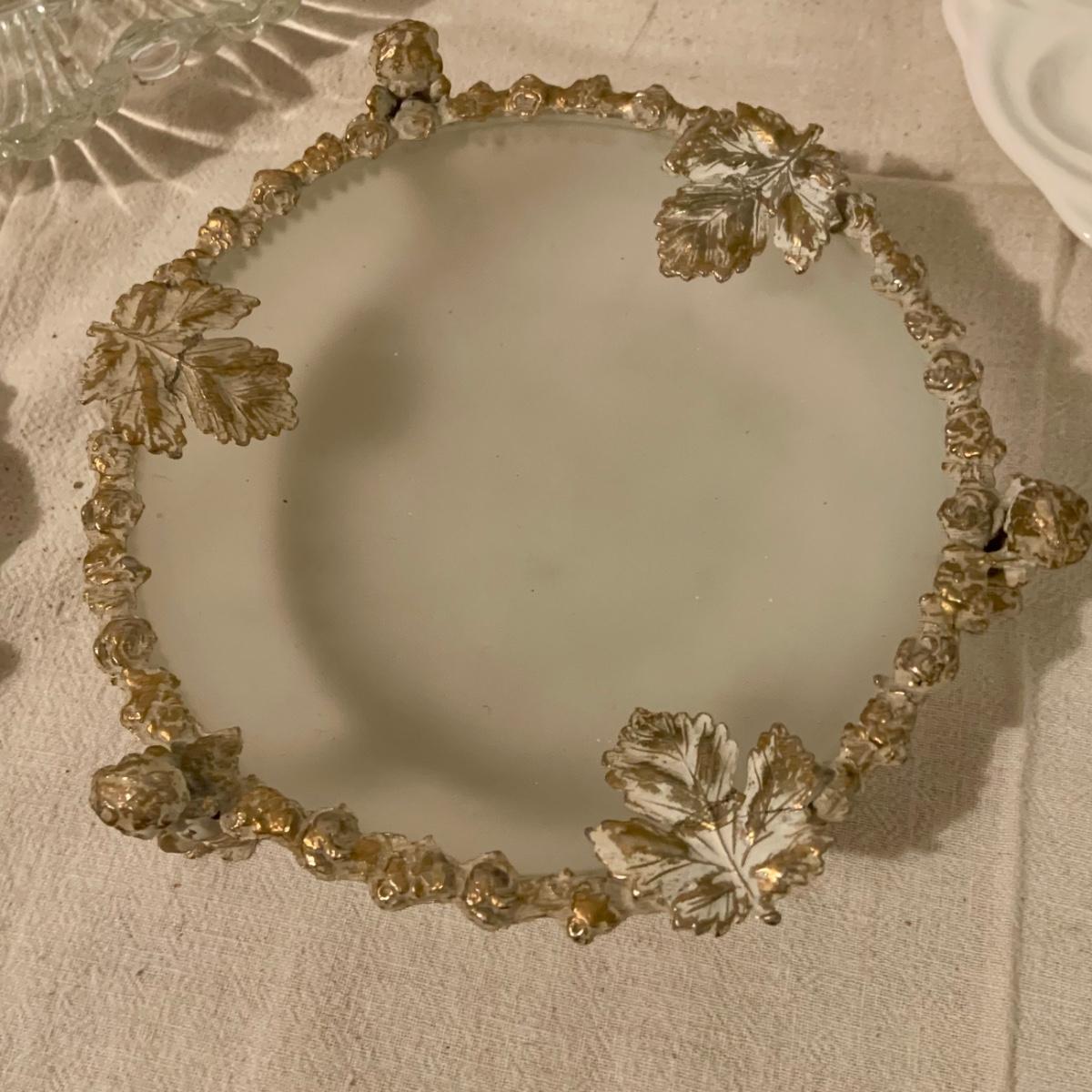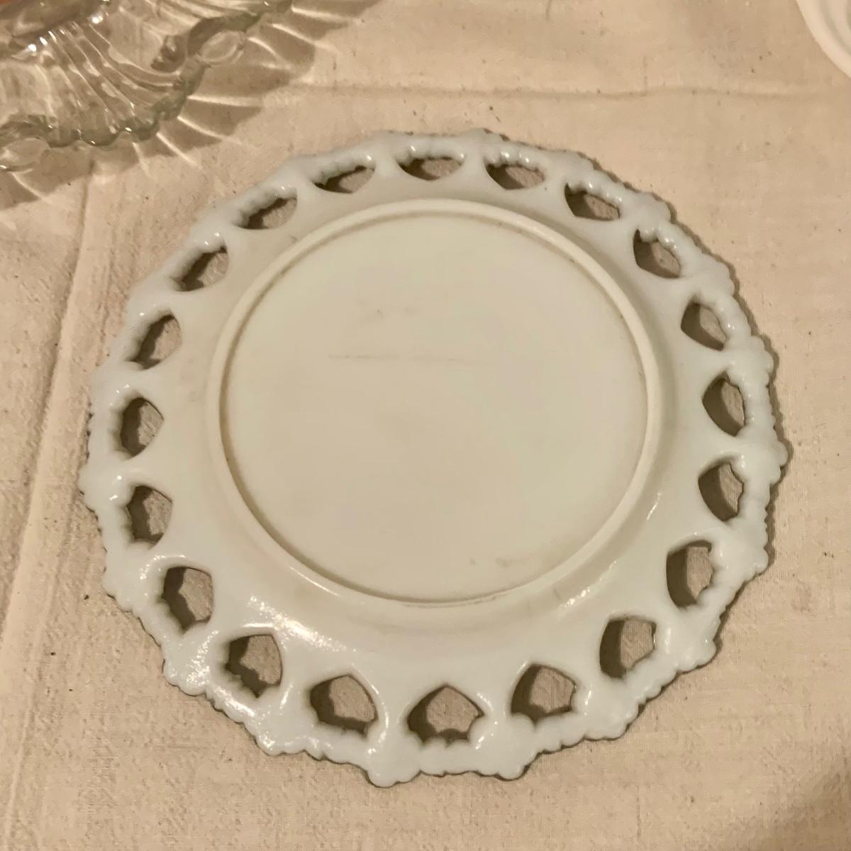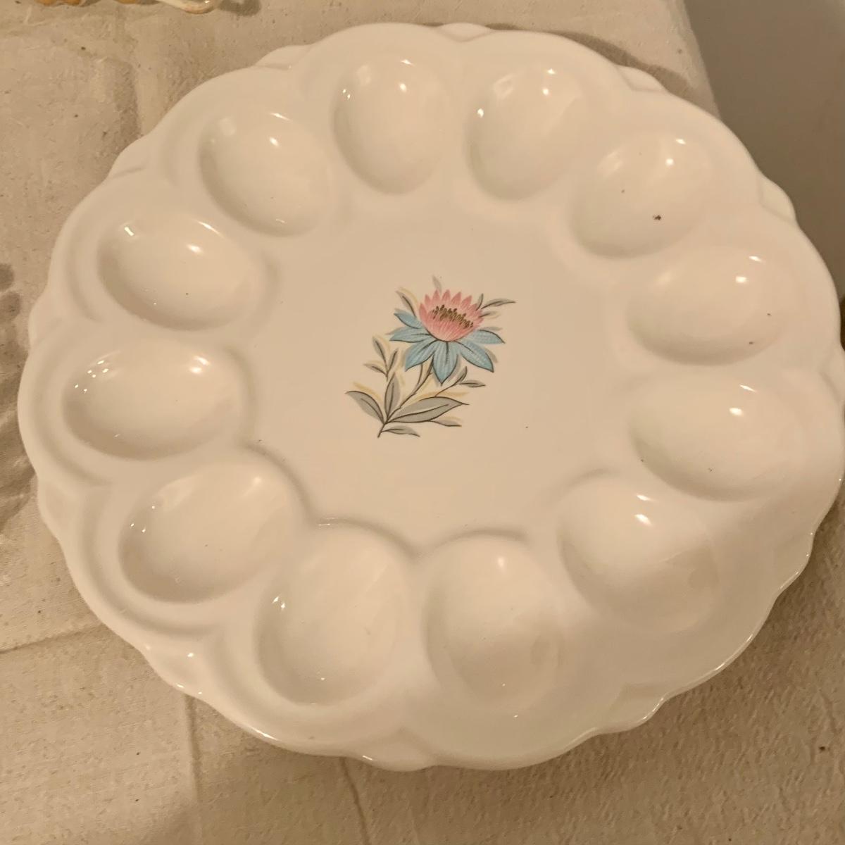 LOT:131: Dishes for Spring Including Egg Platters, Milk Glass Cake Plate, Bowl with Brass Cherbus Trim a Beautiful Gold and Floral Bowl and Much More