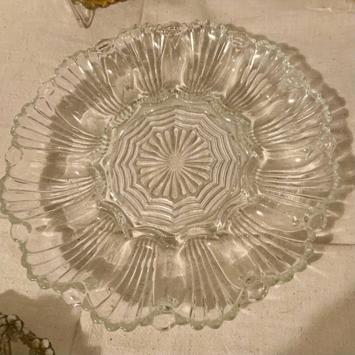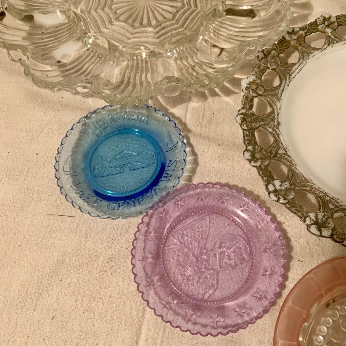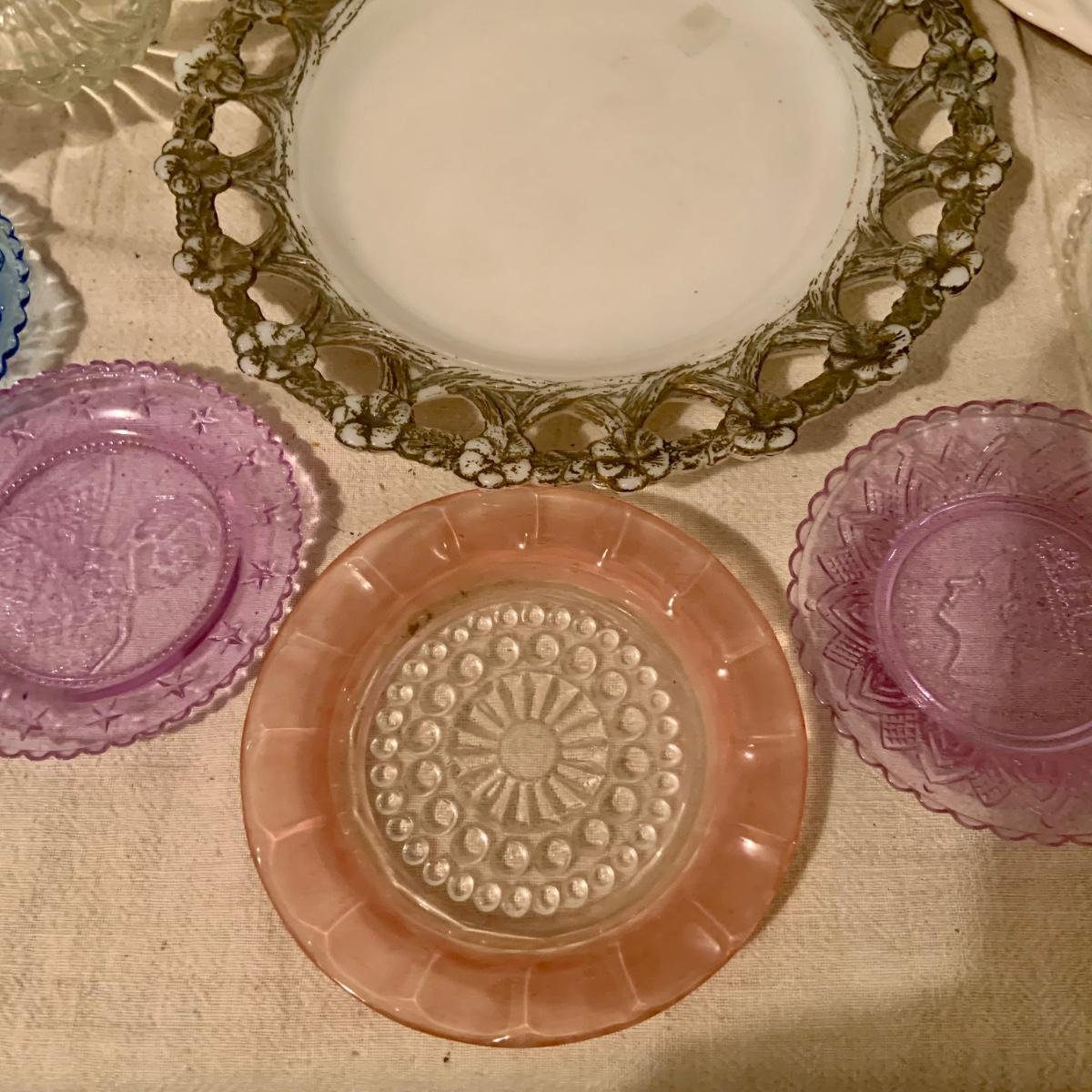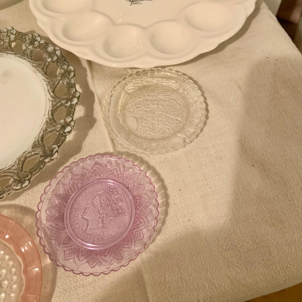 LOT:131: Dishes for Spring Including Egg Platters, Milk Glass Cake Plate, Bowl with Brass Cherbus Trim a Beautiful Gold and Floral Bowl and Much More