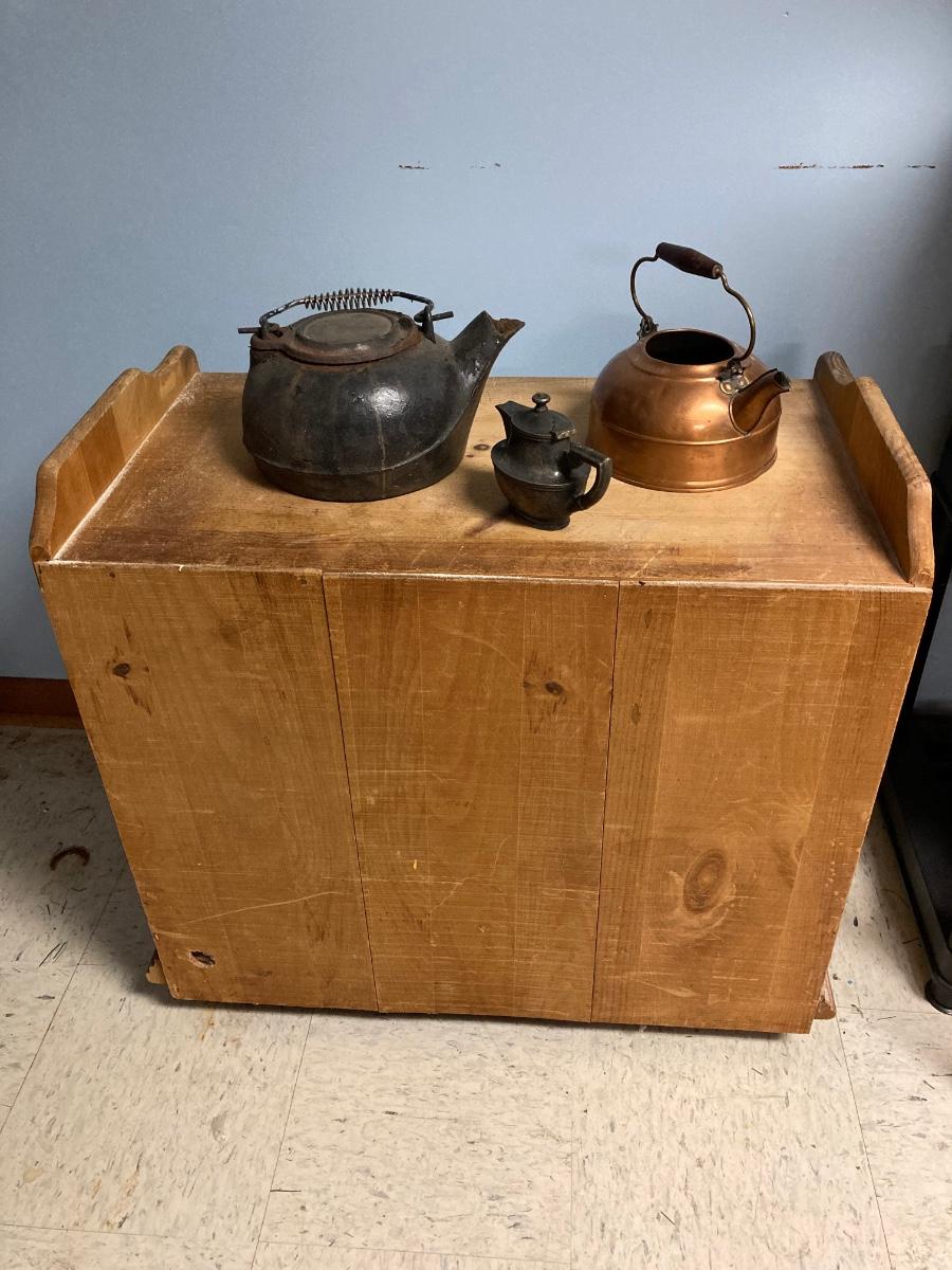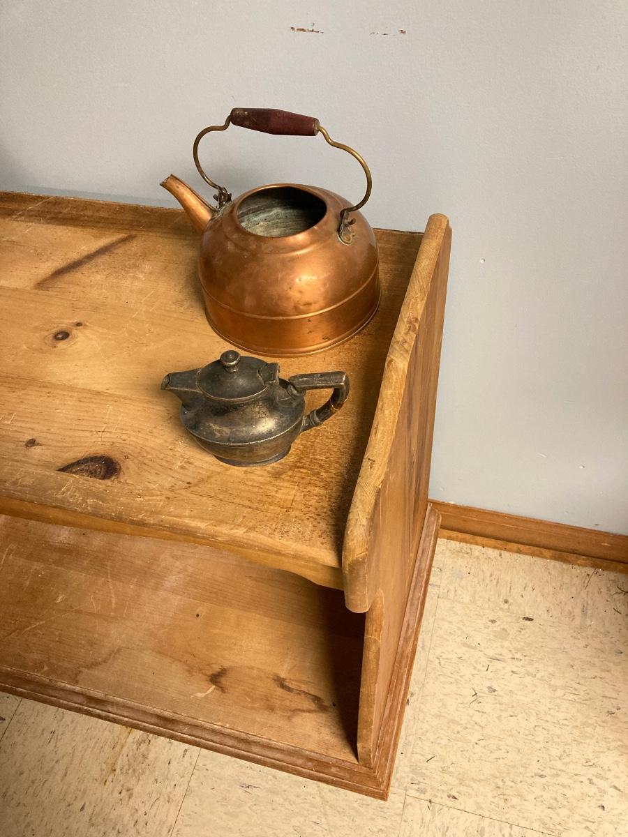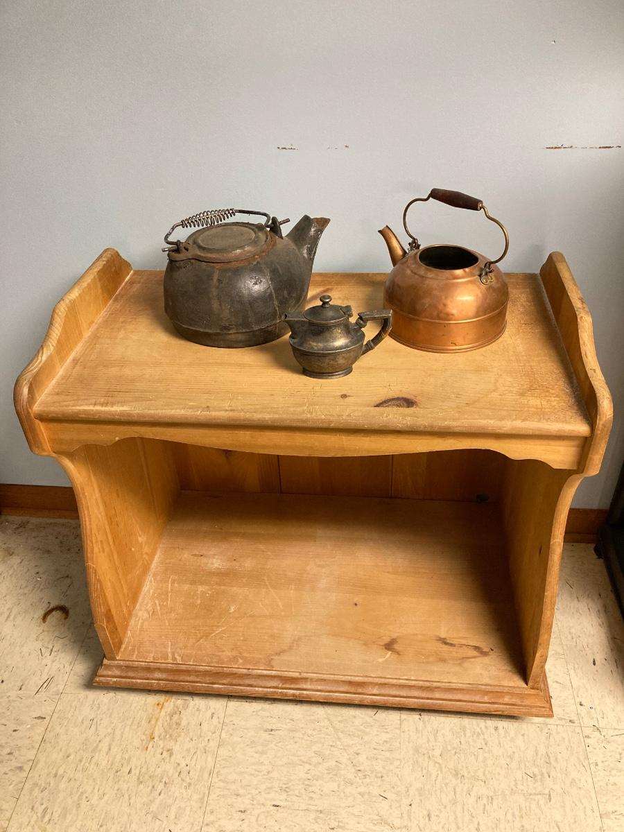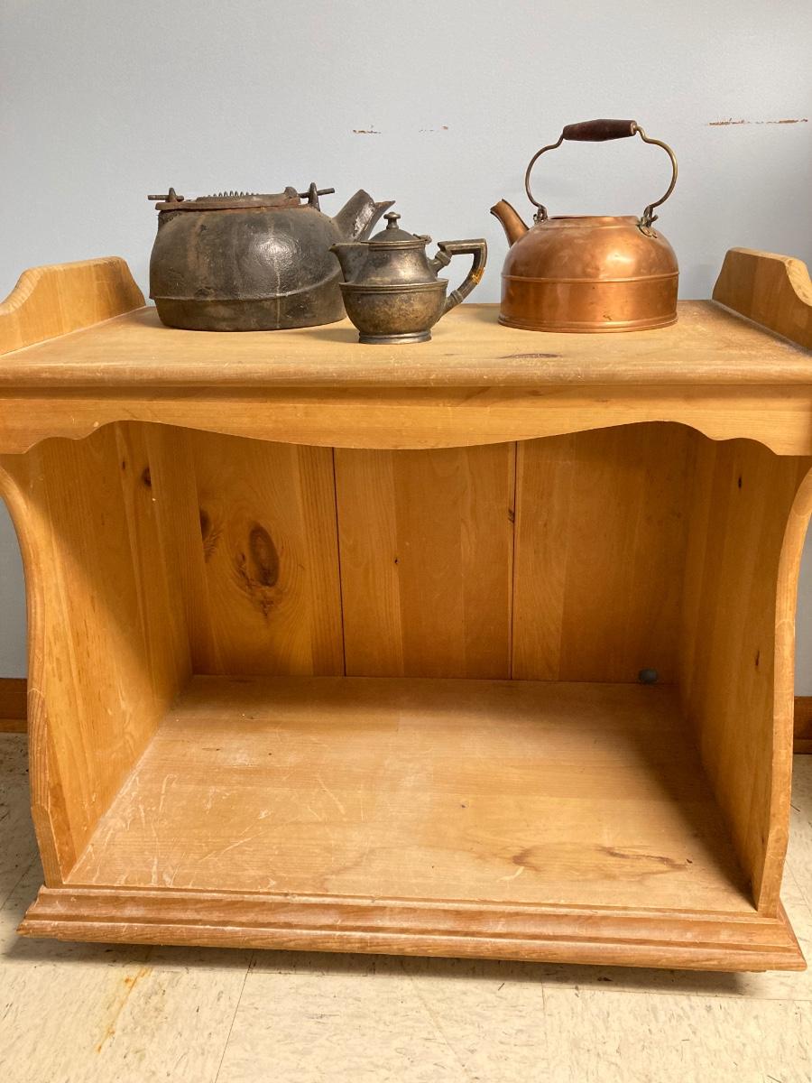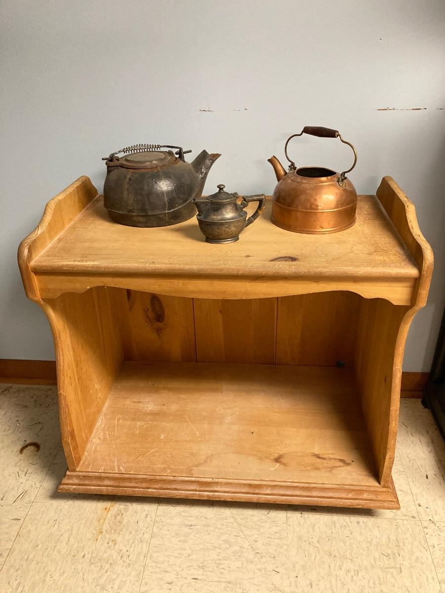 LOT 143: Vintage Rolling Wood Two Tiered Side Table with Teapot Collection - Cast Iron, Silver Plated and Copper