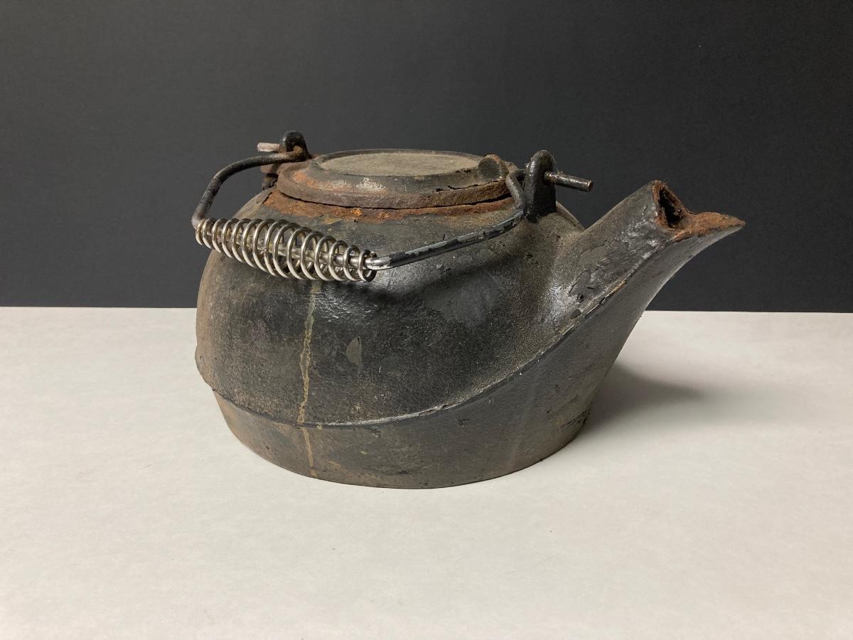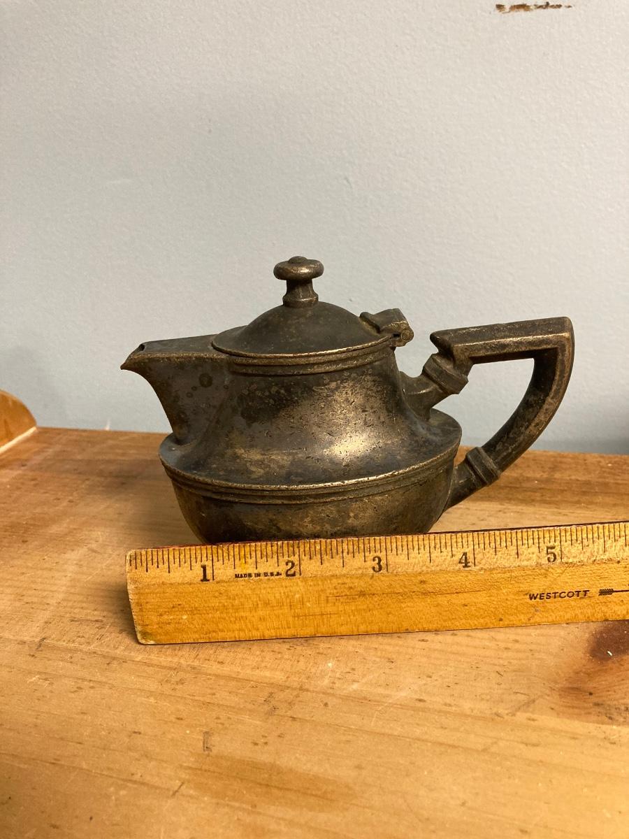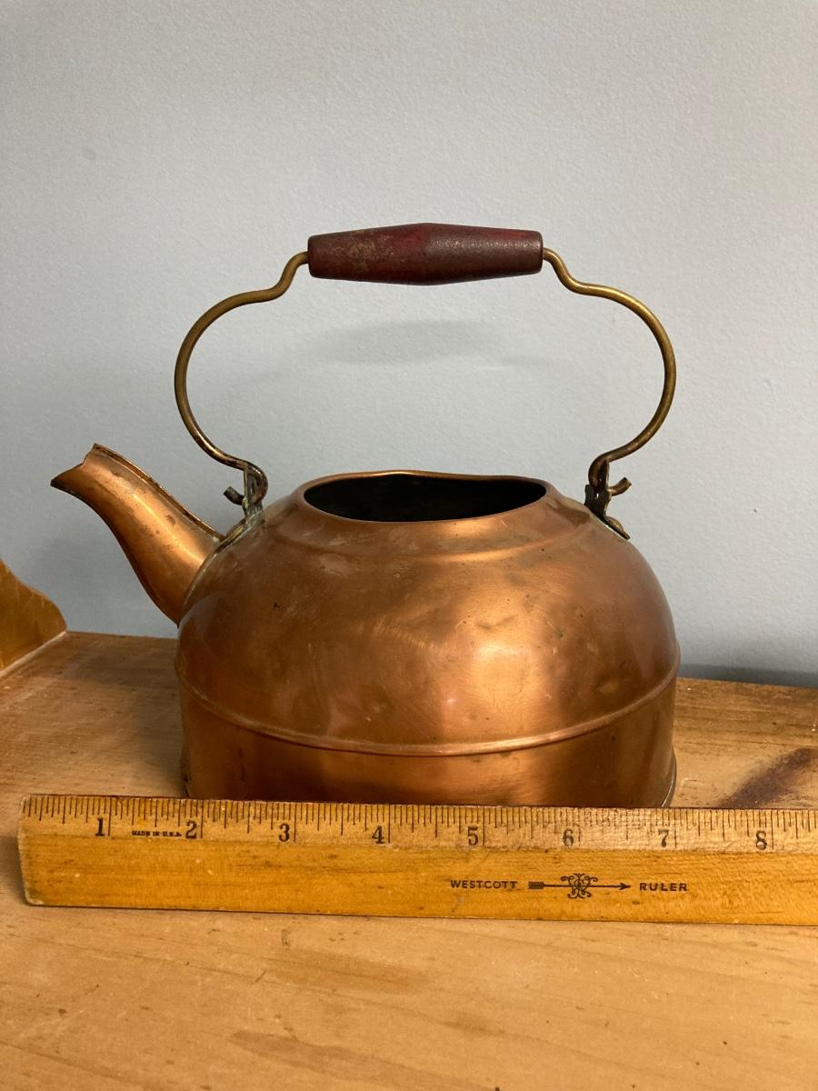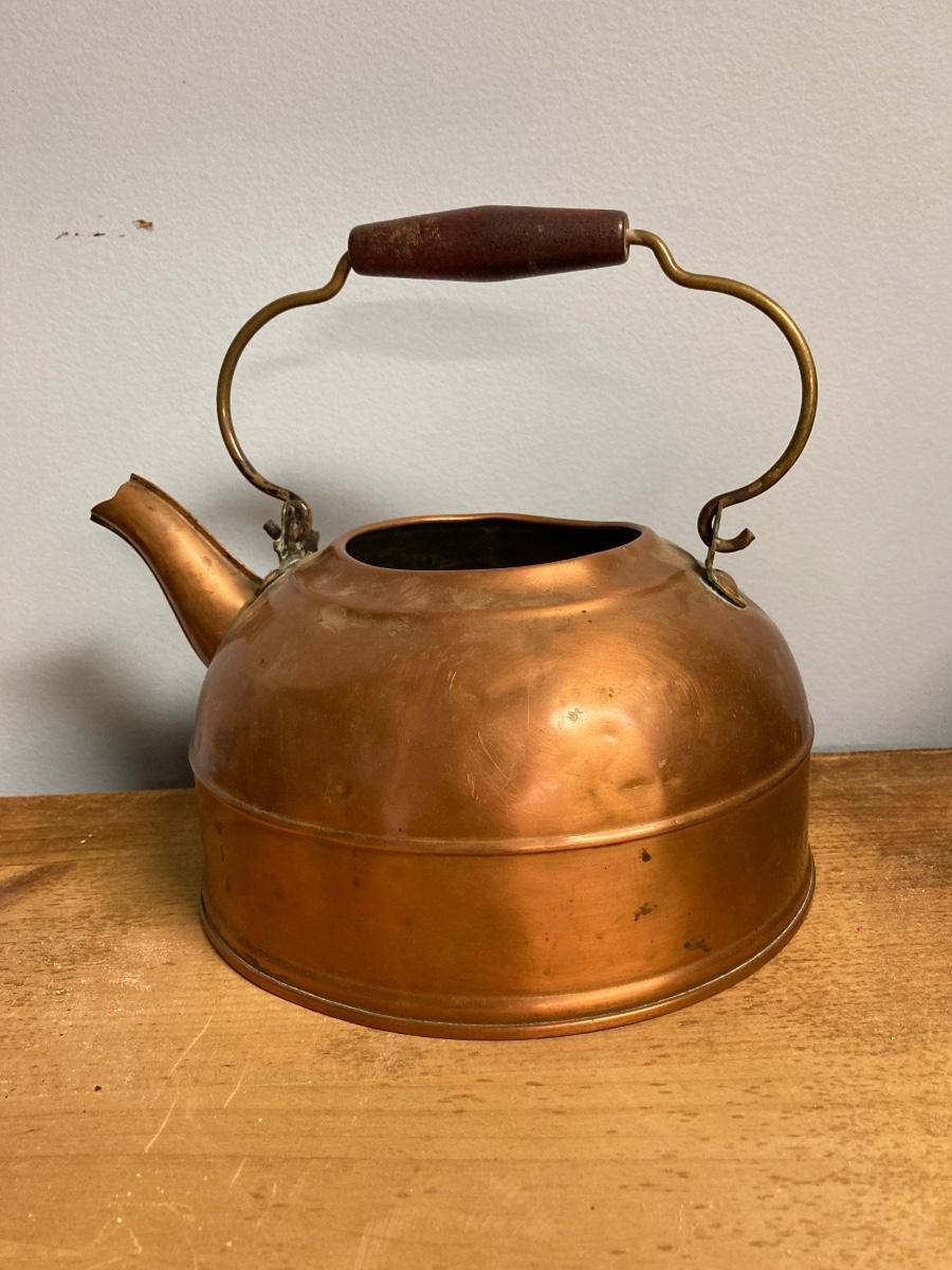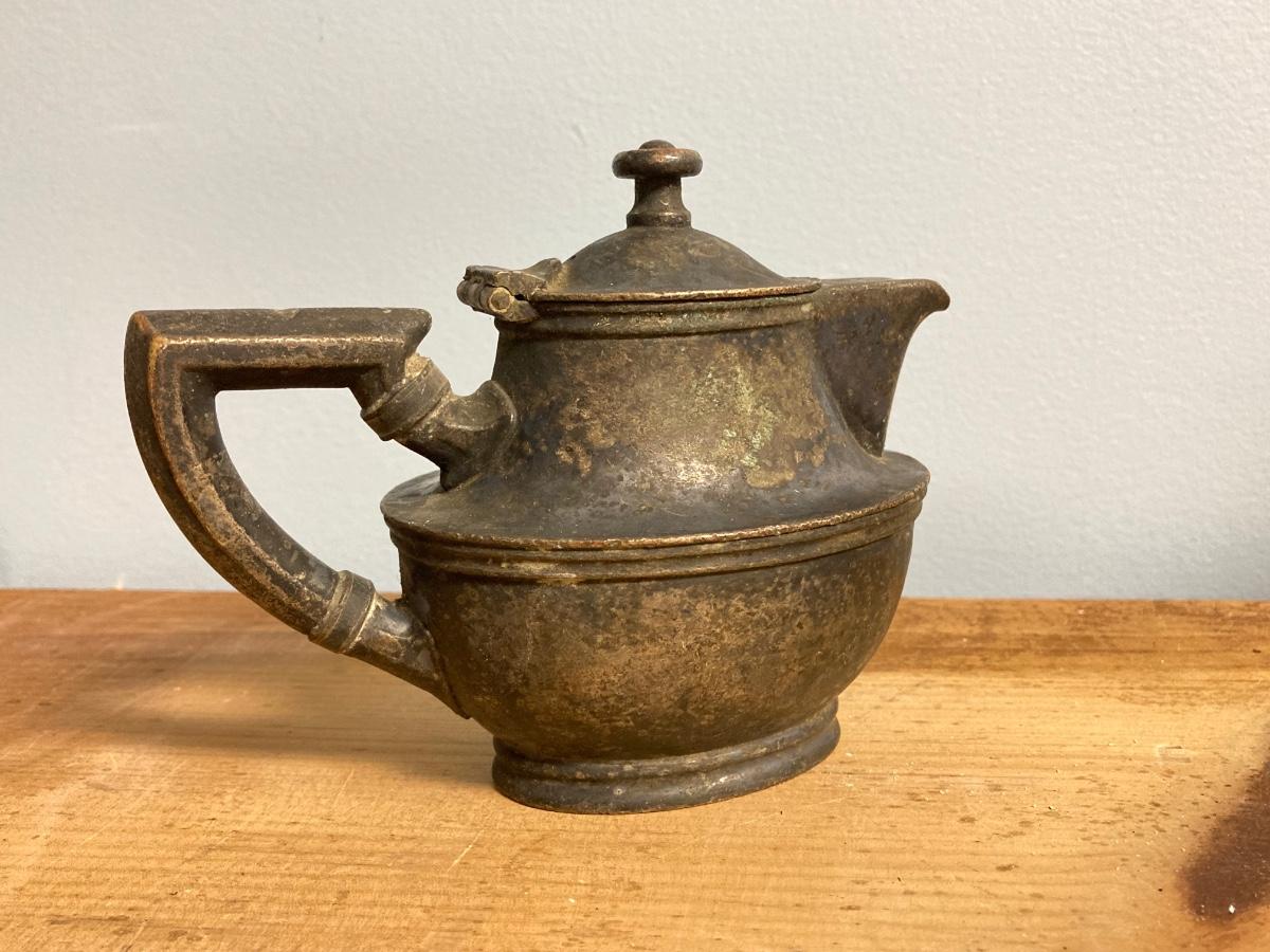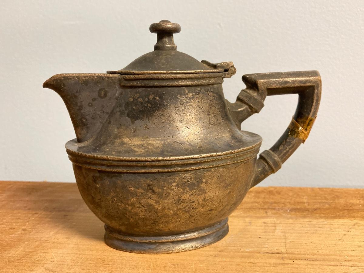 LOT 143: Vintage Rolling Wood Two Tiered Side Table with Teapot Collection - Cast Iron, Silver Plated and Copper