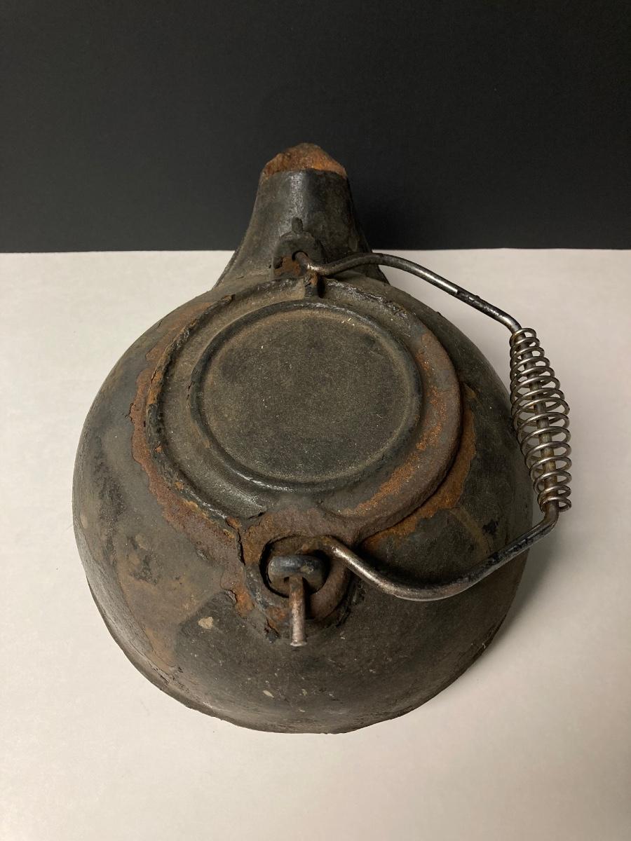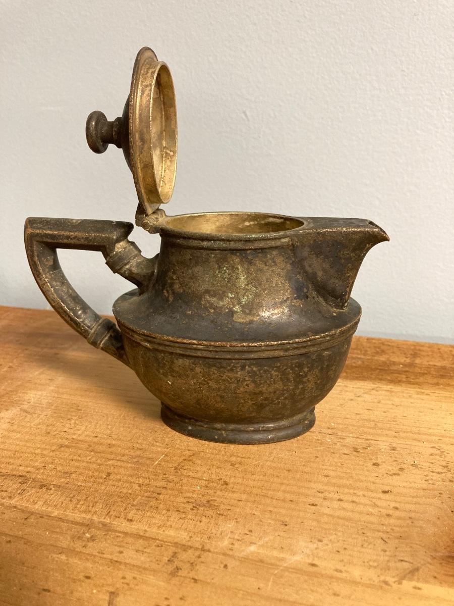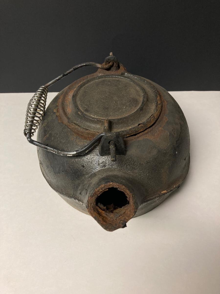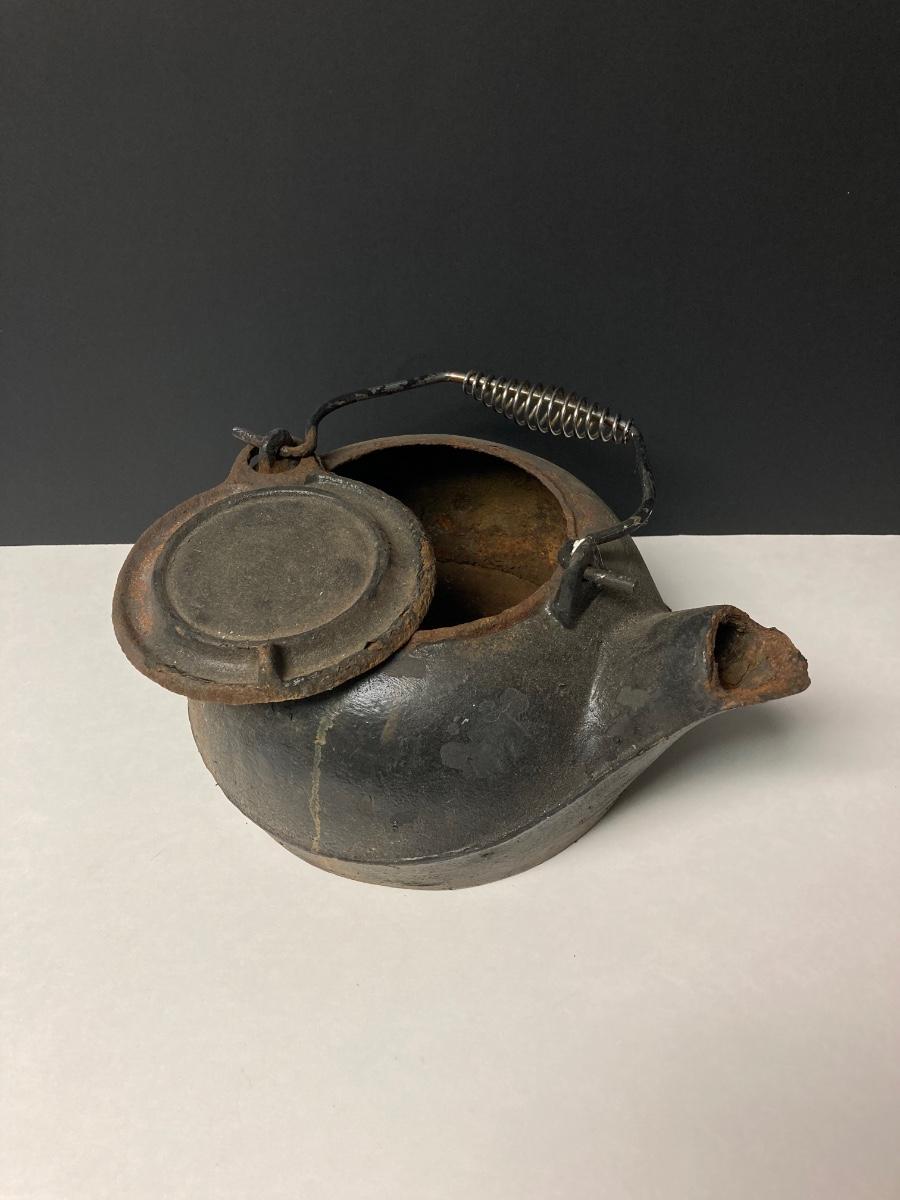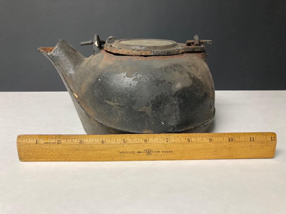 LOT 143: Vintage Rolling Wood Two Tiered Side Table with Teapot Collection - Cast Iron, Silver Plated and Copper