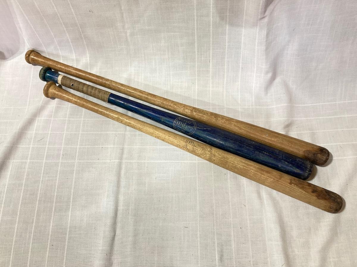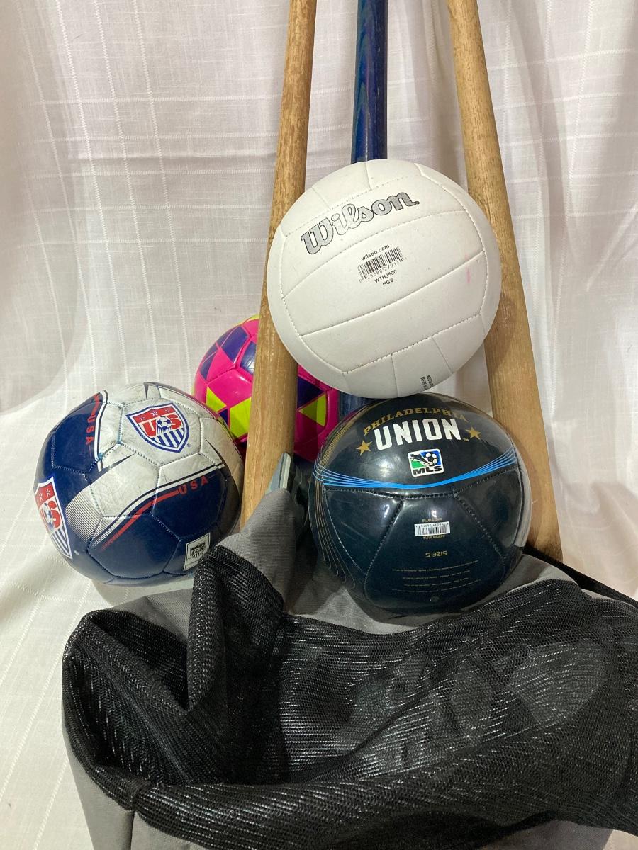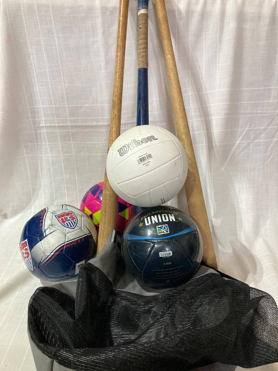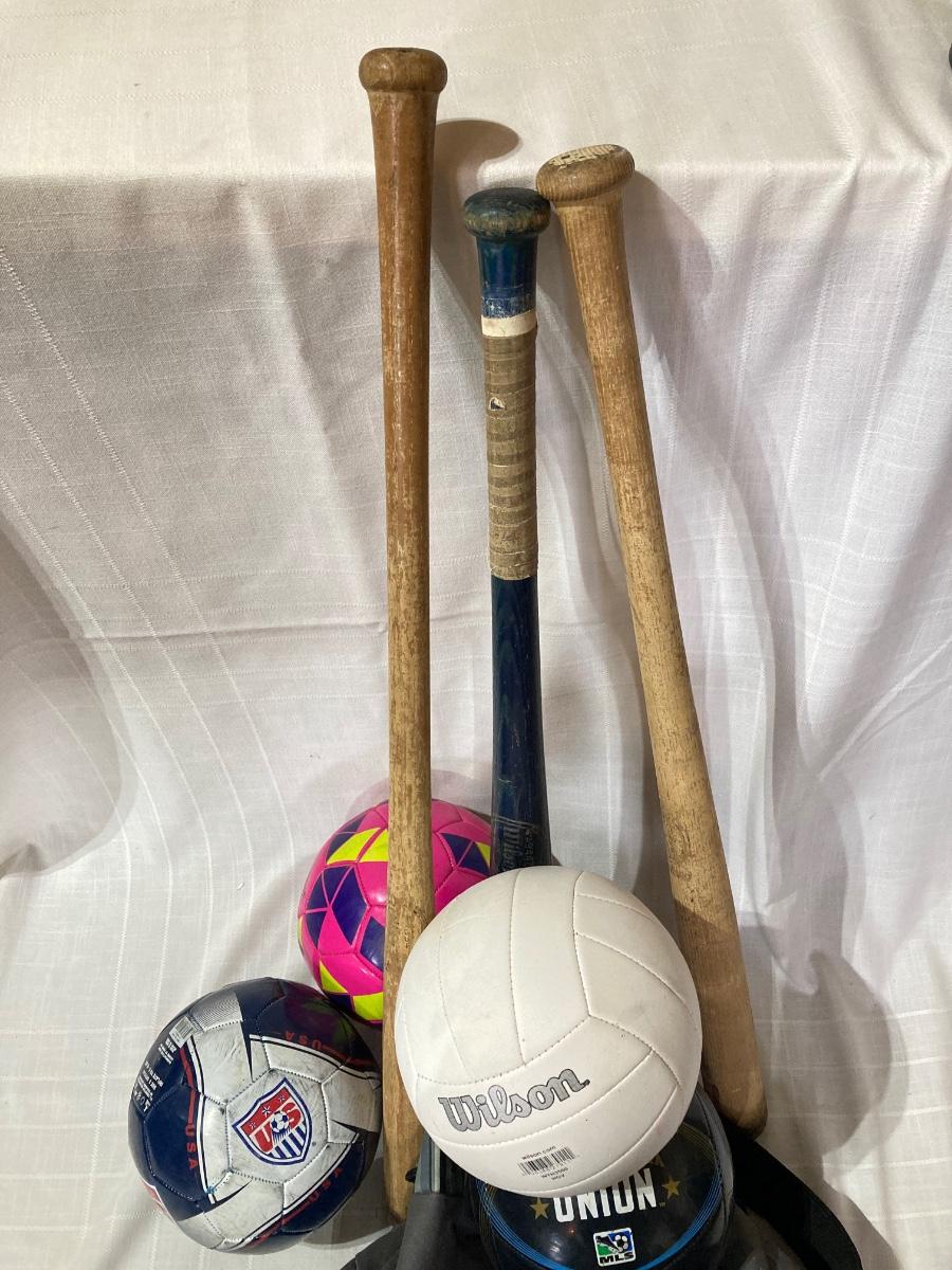 LOT 144G: Vintage Wooden Wilson Baseball Bats with Heavy Duty Bag of Soccer Balls