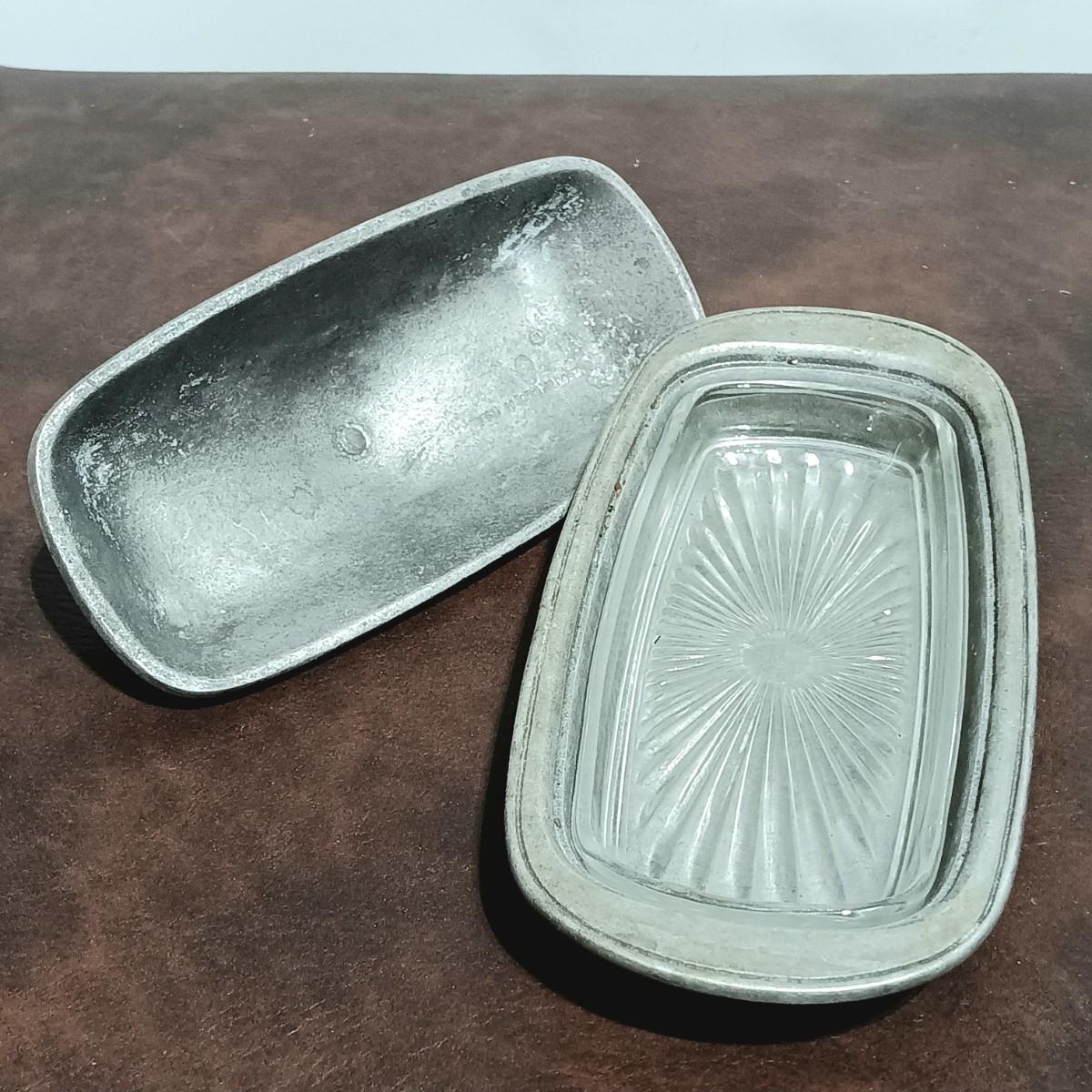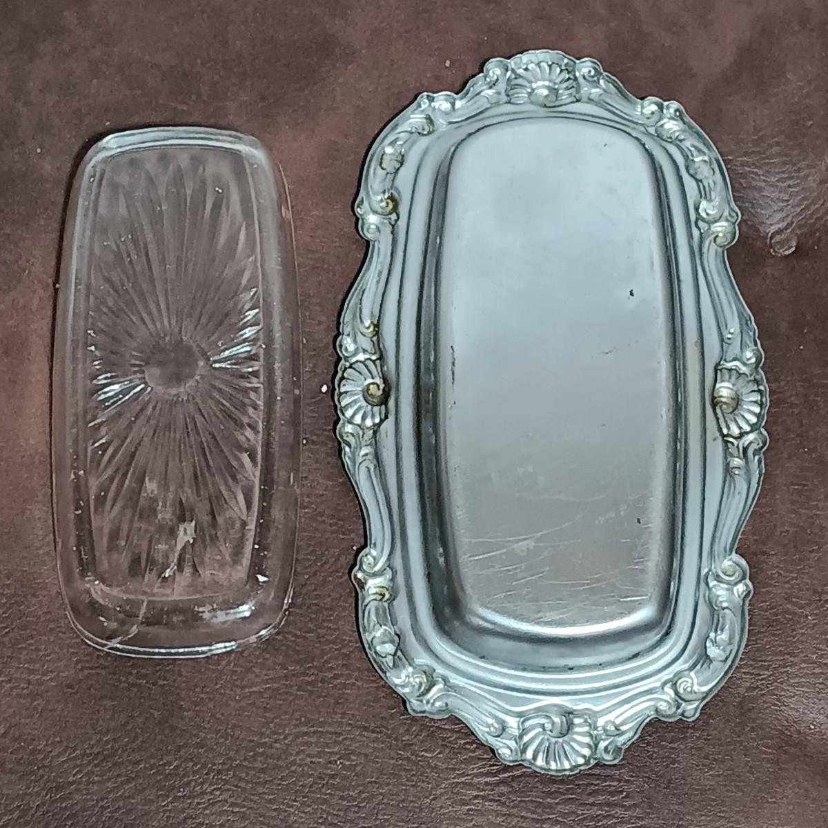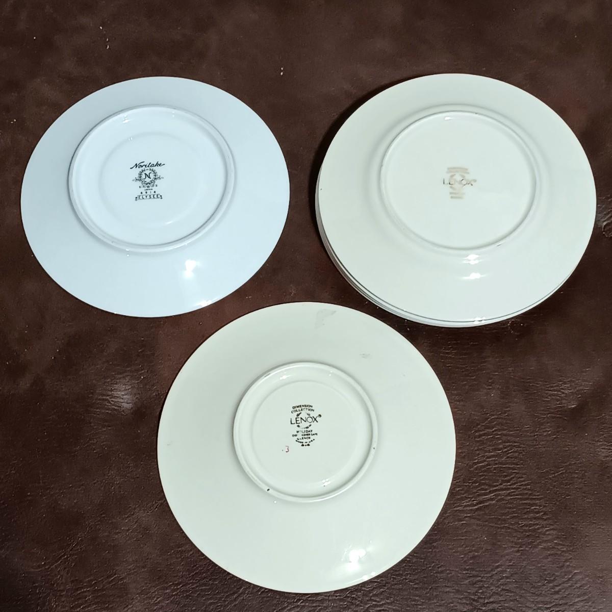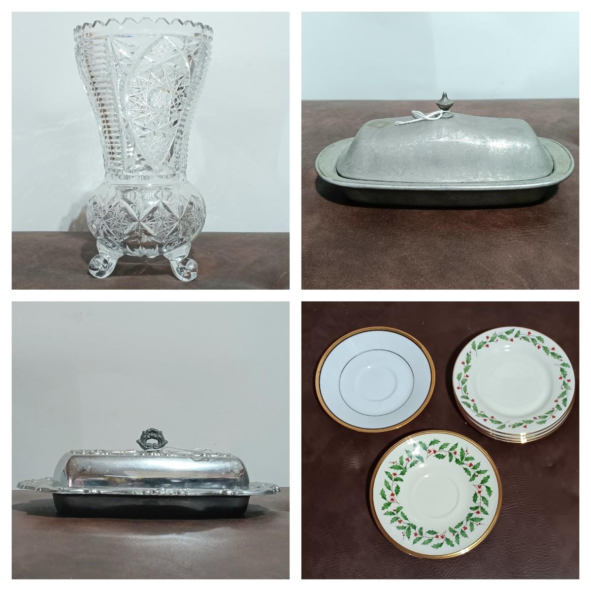 LOT 167G: Pewter and Metal Butter Dishes with Noritake and Lenox Plates and a Crystal Vase