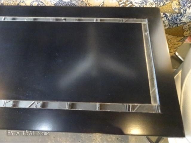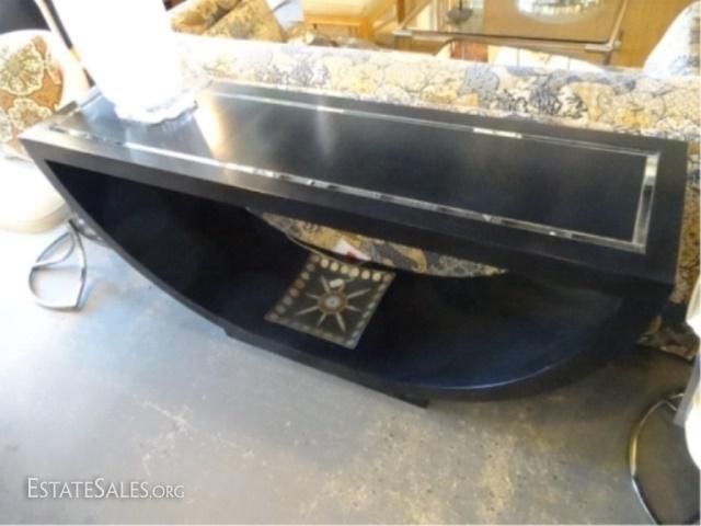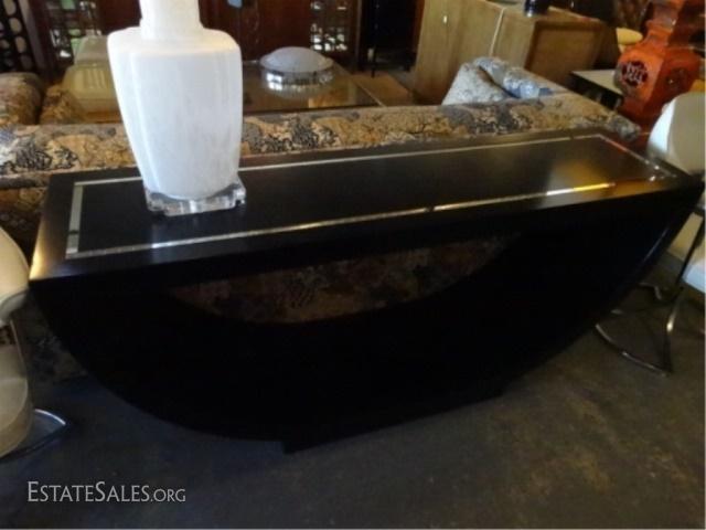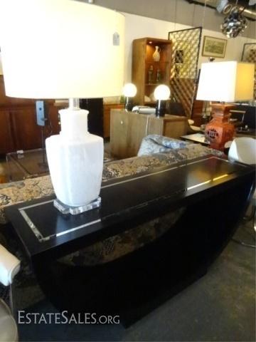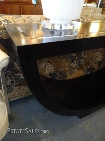 LOT 98A: MID CENTURY MODERN U SHAPE CONSOLE TABLE, BLACK ENAMEL WITH MIRRORED ACCENT STRIPE ON TOP, VERY GOOD GENTLY USED CONDITION WITH MINOR WEAR, 60"W X 15.5"D X 27.5"H, SKUJMD
