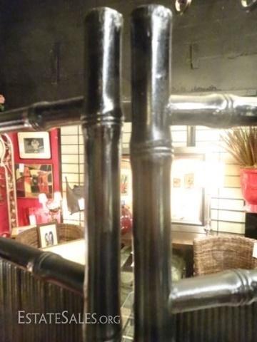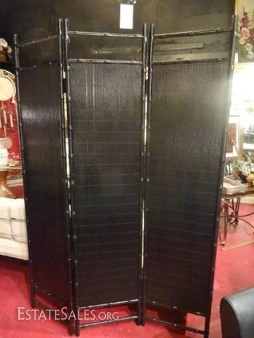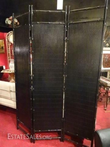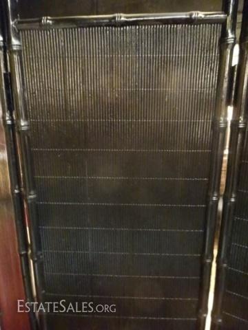 LOT 98E: MID CENTURY MODERN FLOOR SCREEN, BAMBOO AND RATTAN, BLACK LACQUER FINISH, 72"H X 50"W, VERY GOOD VINTAGE CONDITION, SKUJMD