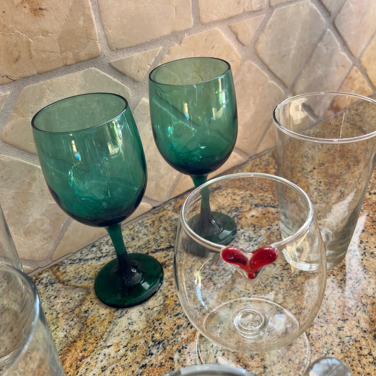 Miscellaneous clear glassware and 2 green wine glasses