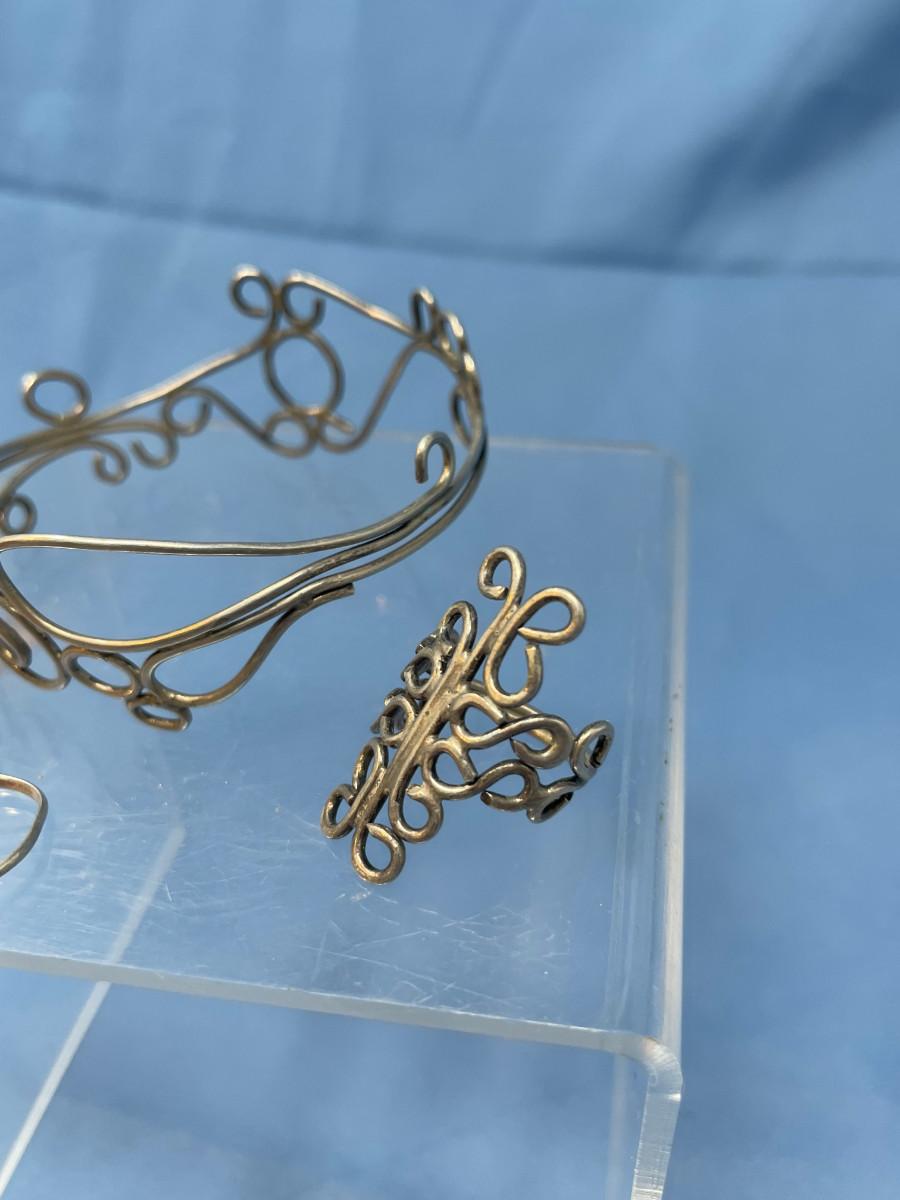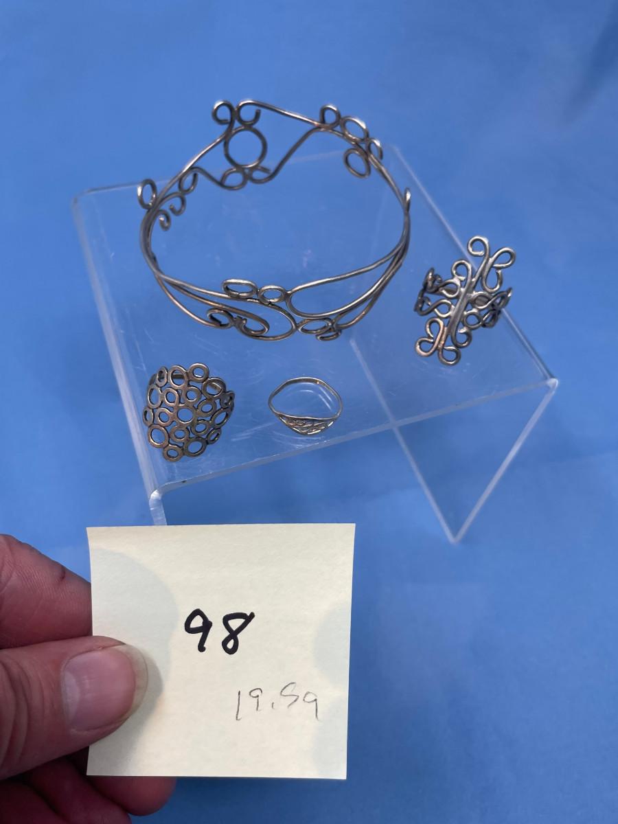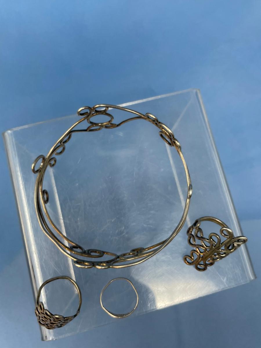 19.5 grams total weight. Bracelet & 3 rings. Rings are size 8 approximately.