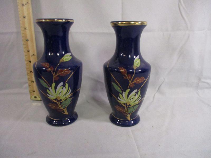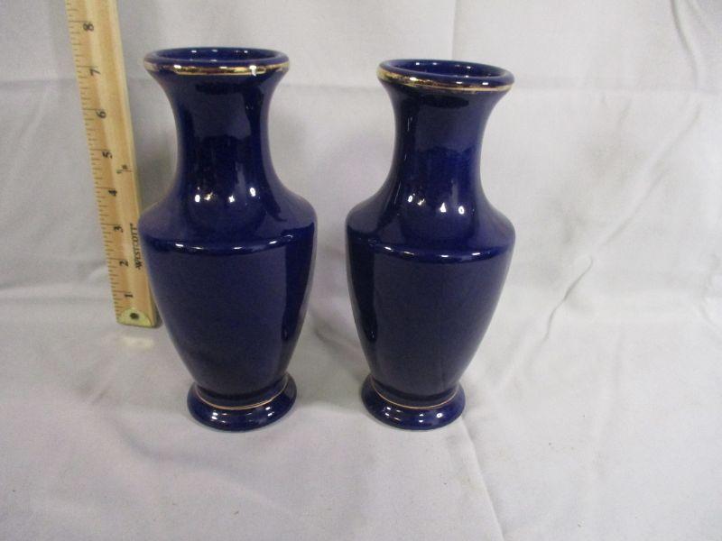 Both of these vases are in excellent condition with no identifying marks. They are each about 8" tall.