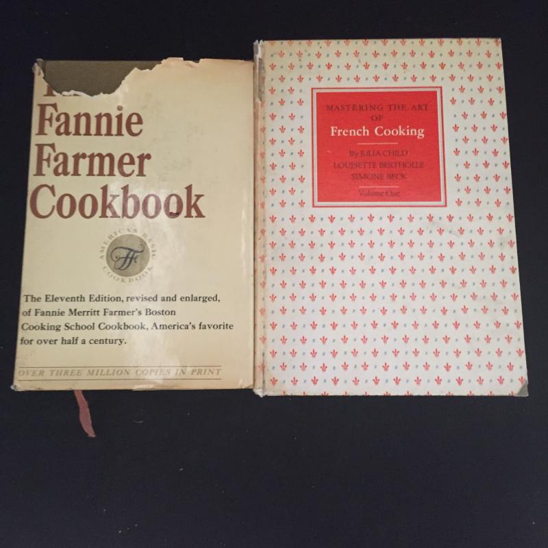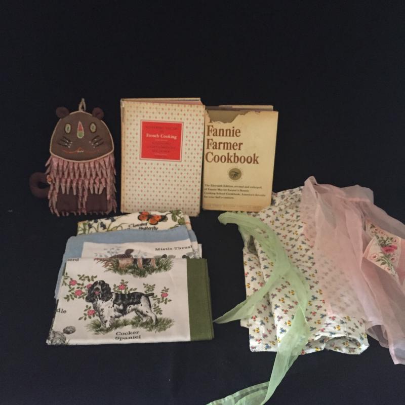 Vintage Cookbooks with Two Aprons and Three Towels. Channel your inner Julia Child.