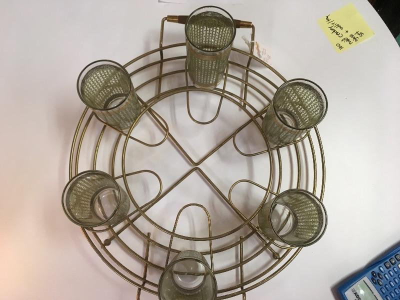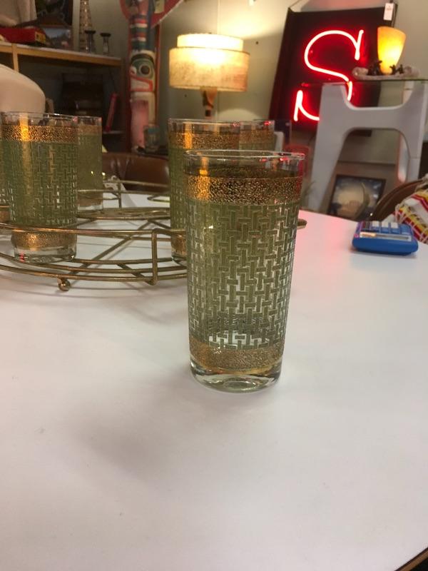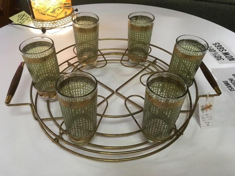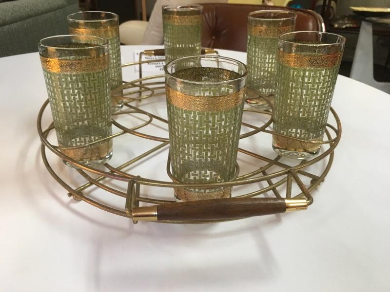 Lot 99 This lot includes authentic mid century glasses with a unique glass caddie that will also hold a servicing bowl.