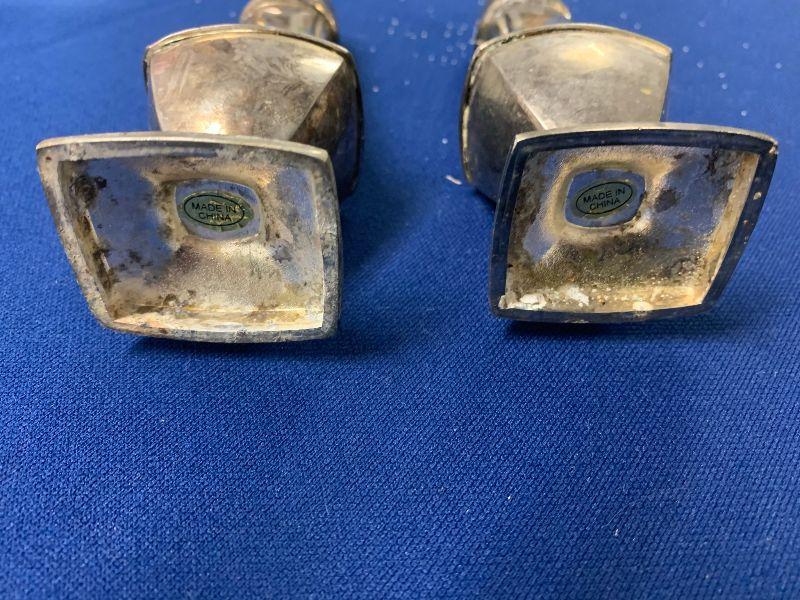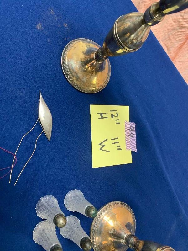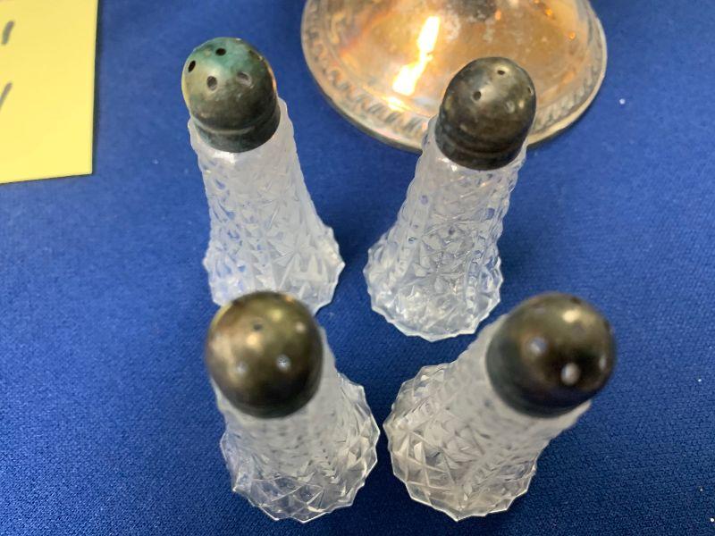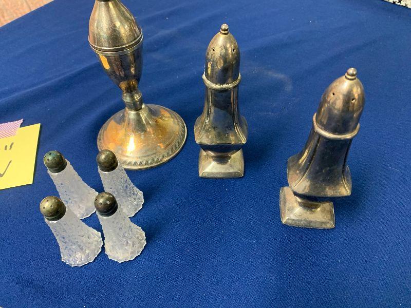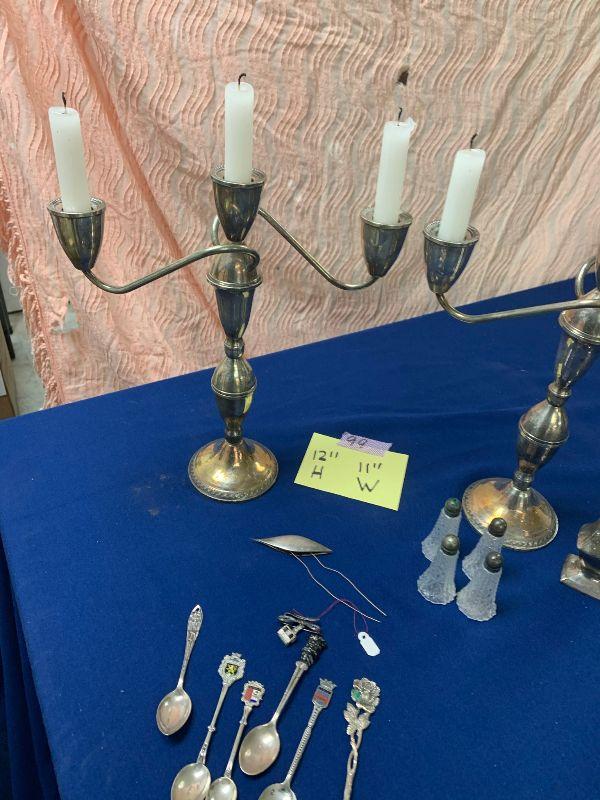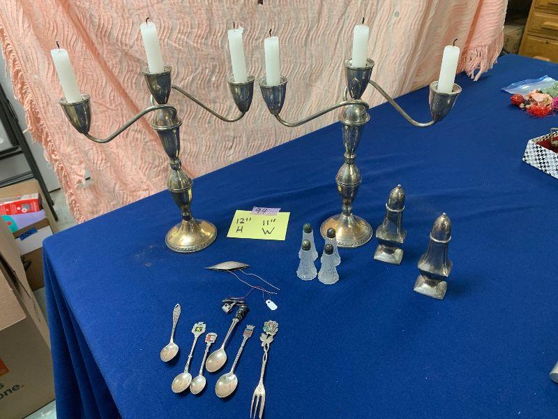 2 large sterling candle holders (3 candles each), plus small collector spoons, salt and pepper not sterling and 4 small sterling topped S&Ps