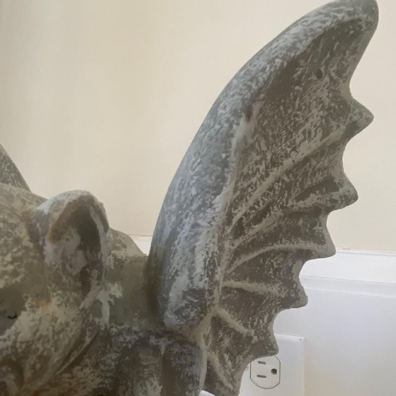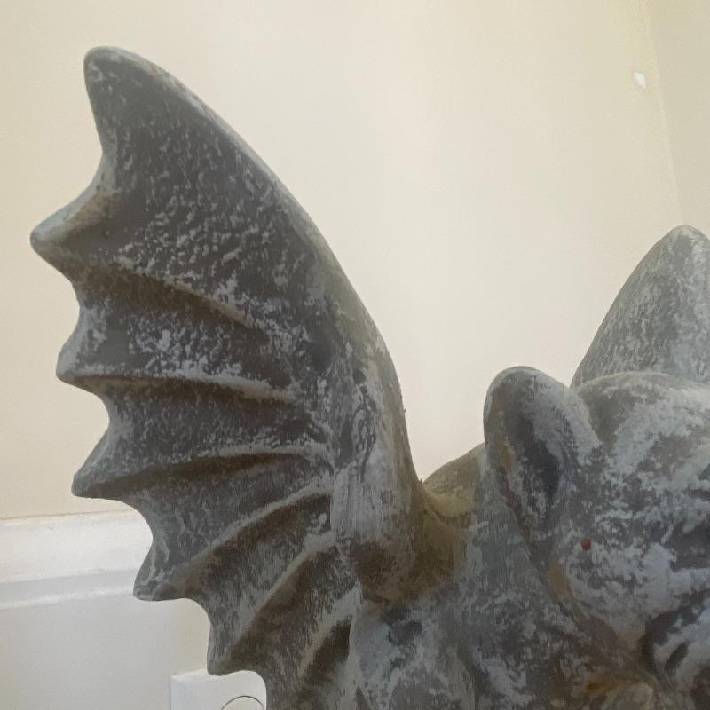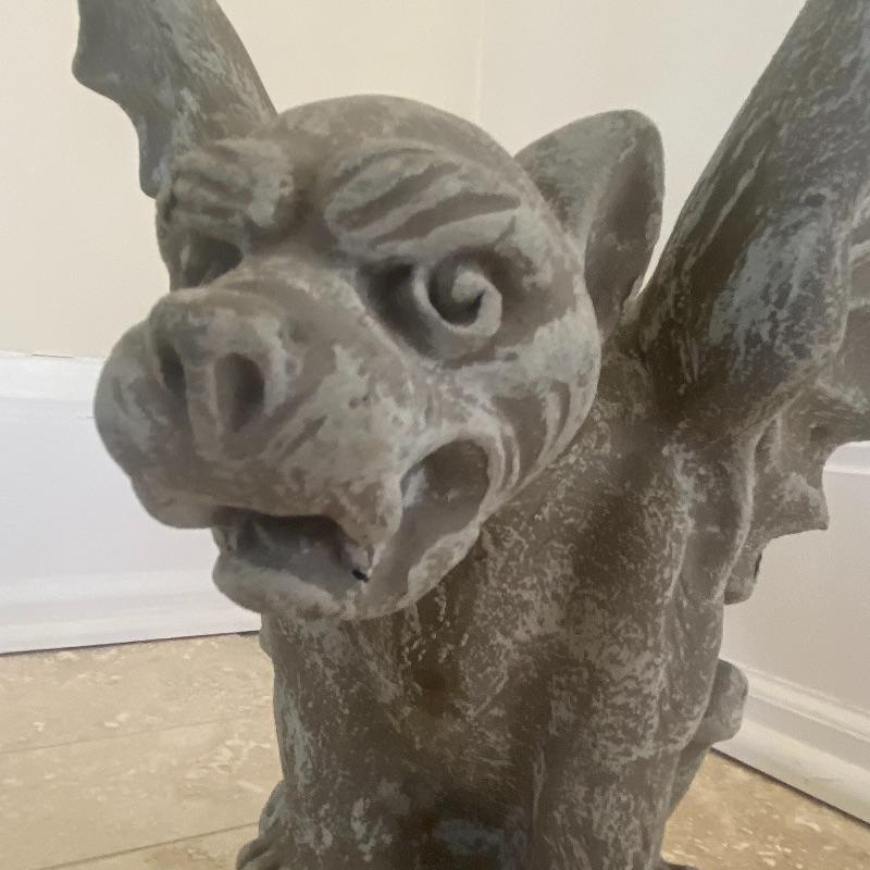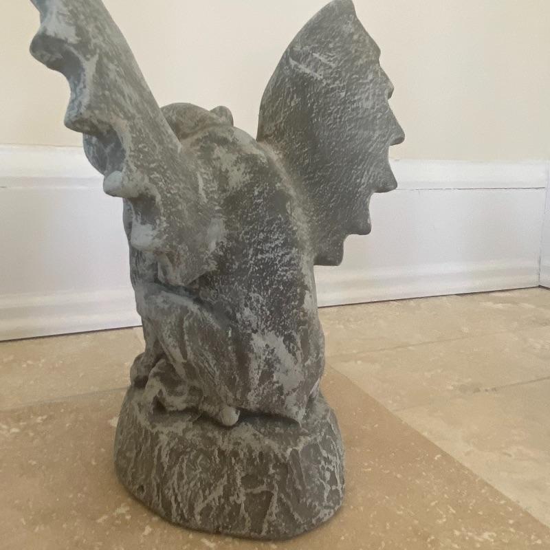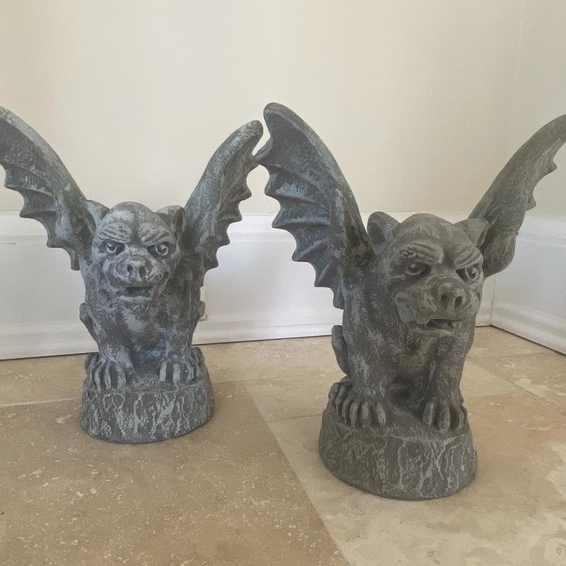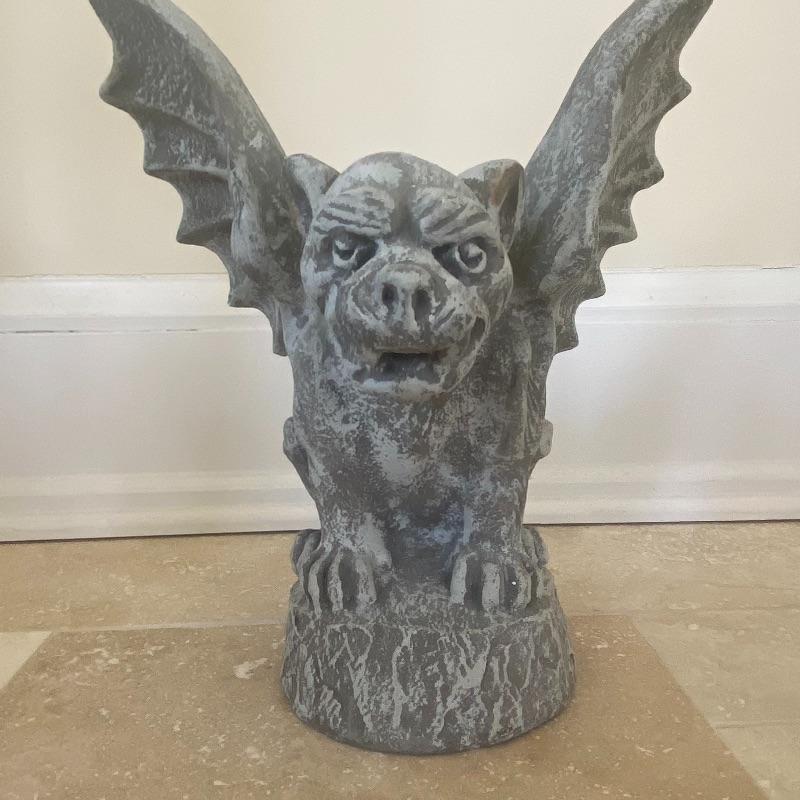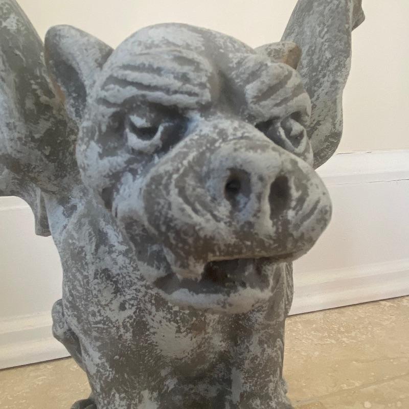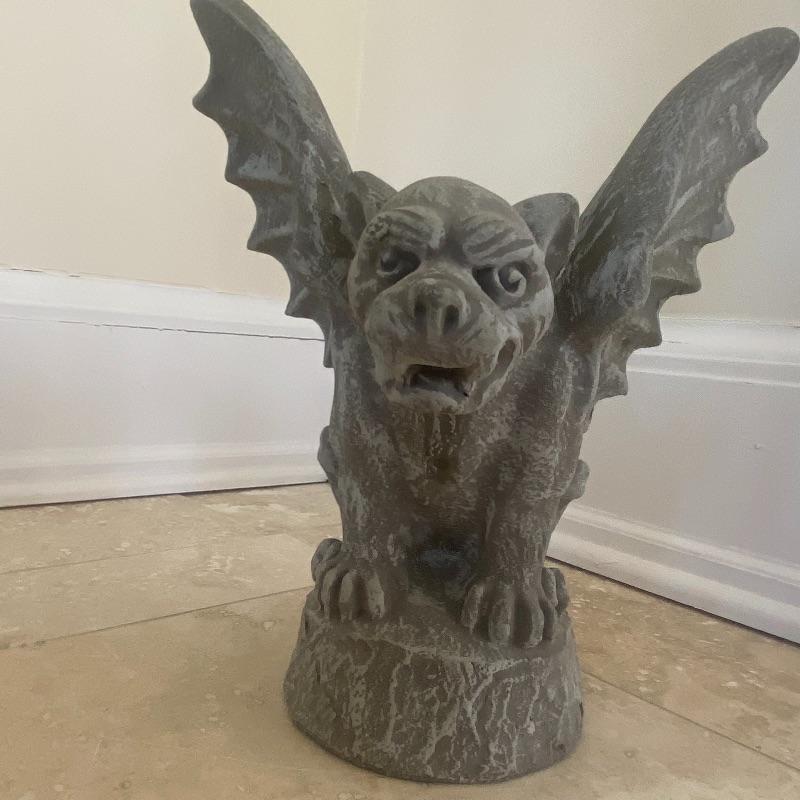 Lot includes a pair of small concrete gargoyles. See photos for details in the pieces such as the face and wings. Gargoyles stand 12” tall. Gargoyles have a base diameter of 5.5”. Local pickup only.