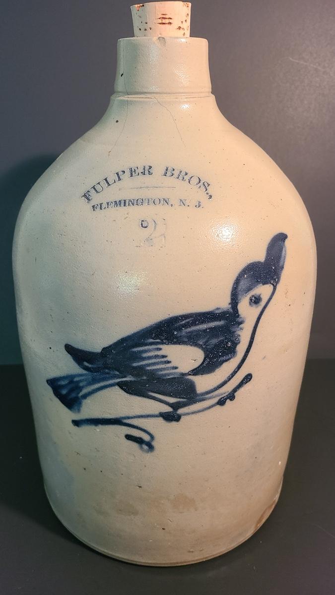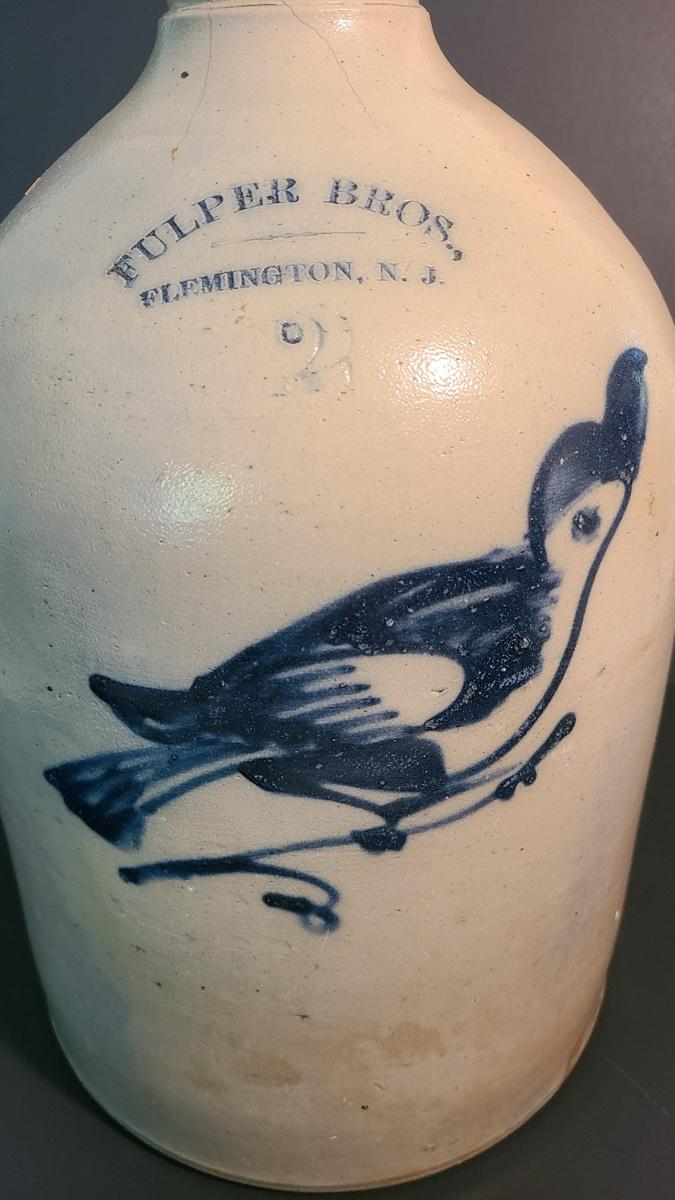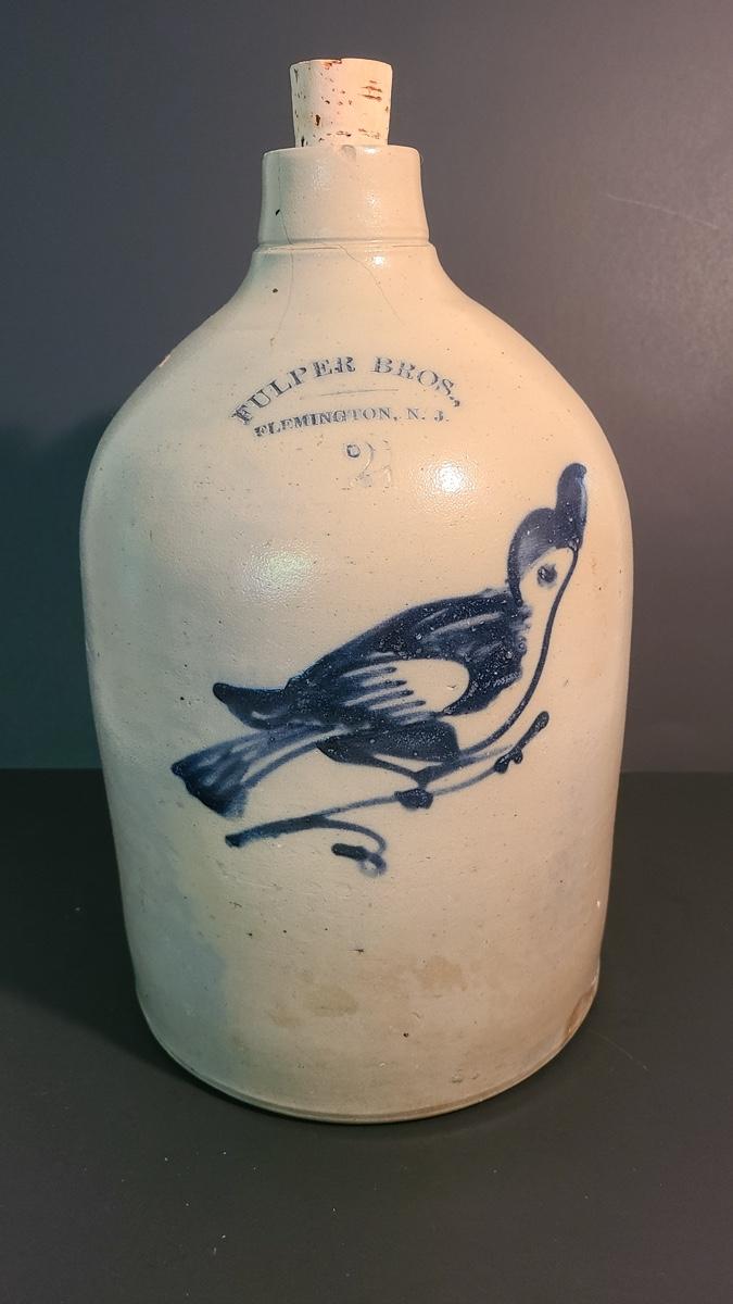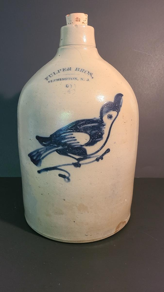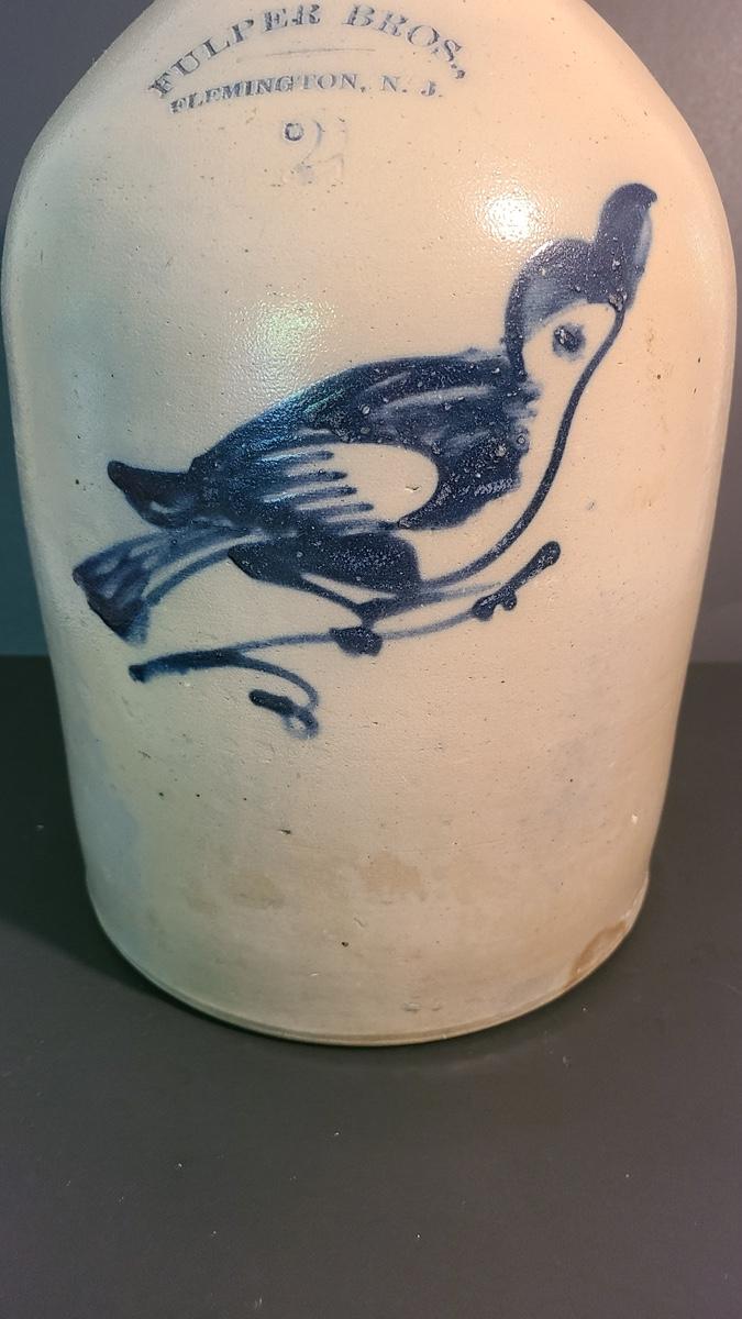 Lot 99: Fulper Bros. Flemington NJ 2 Gallon Jug with Cobalt Bird