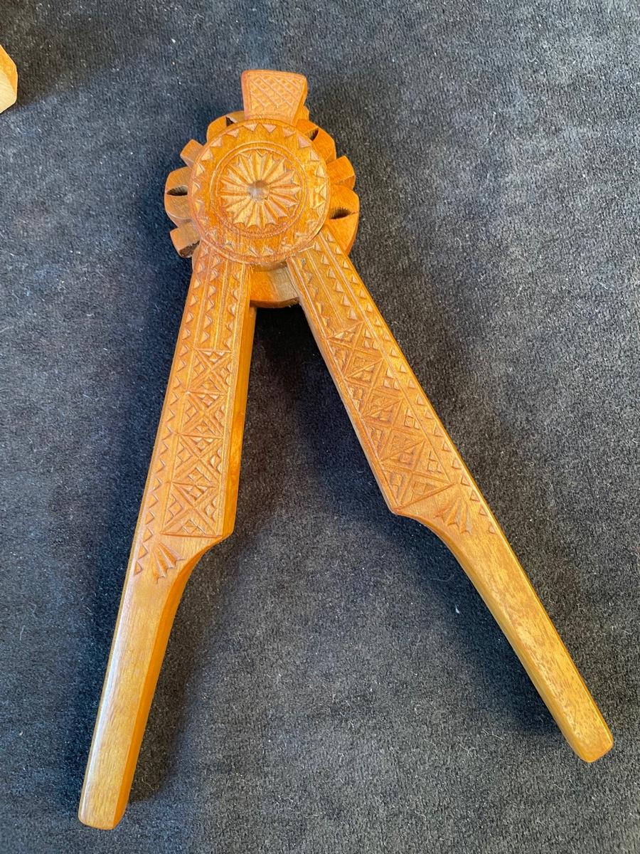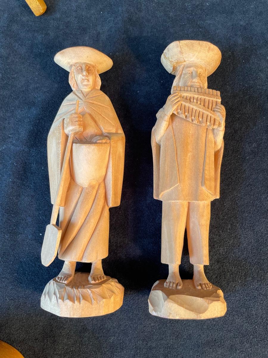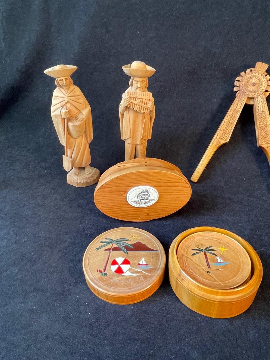 Pair of carved figurines, small wooden box with scrimshaw decoration, a set of souvenir coasters in a wooden box and a hand carved nut cracker.