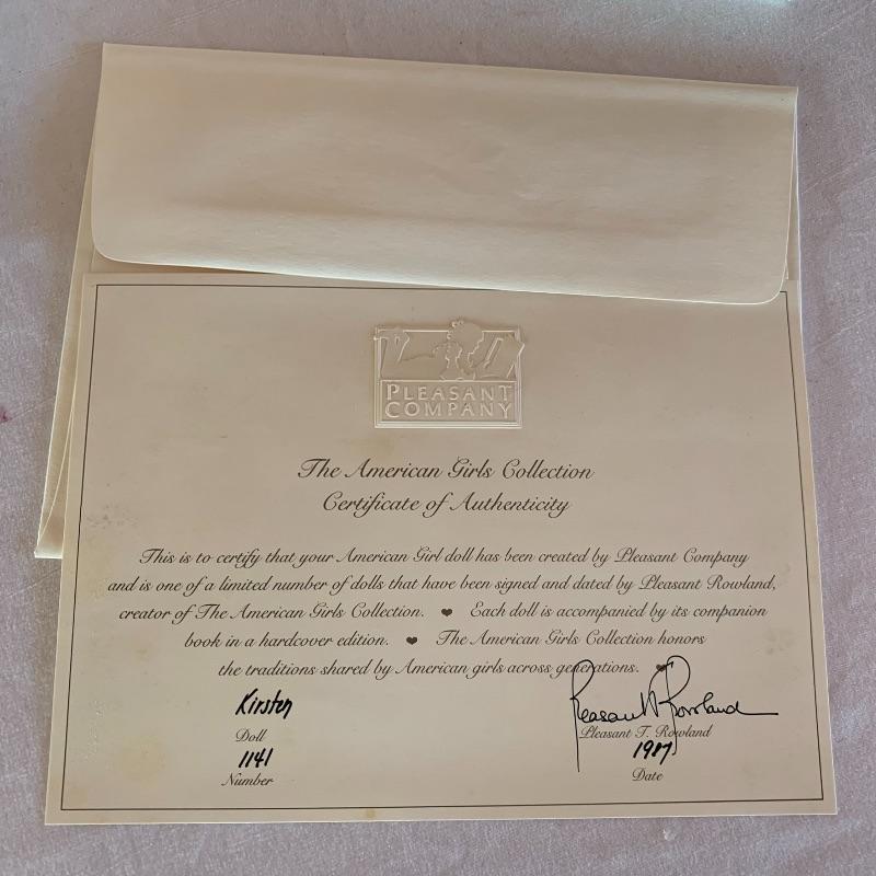 Number 1141 Kristen doll from the American Girls Doll Collection is in wonderful condition with her book, toys, COA and original box. A few catalogs and doll magazines thrown in for exploring. Shipping available.