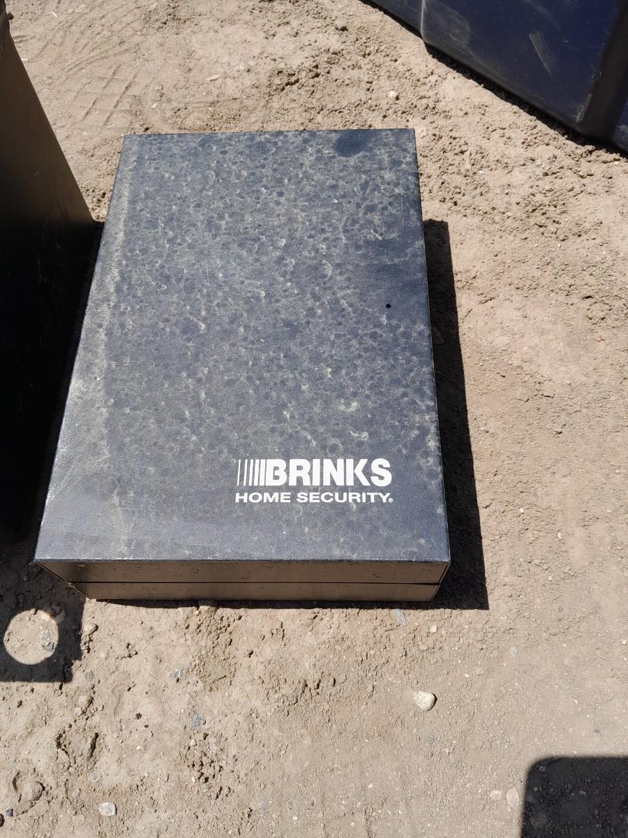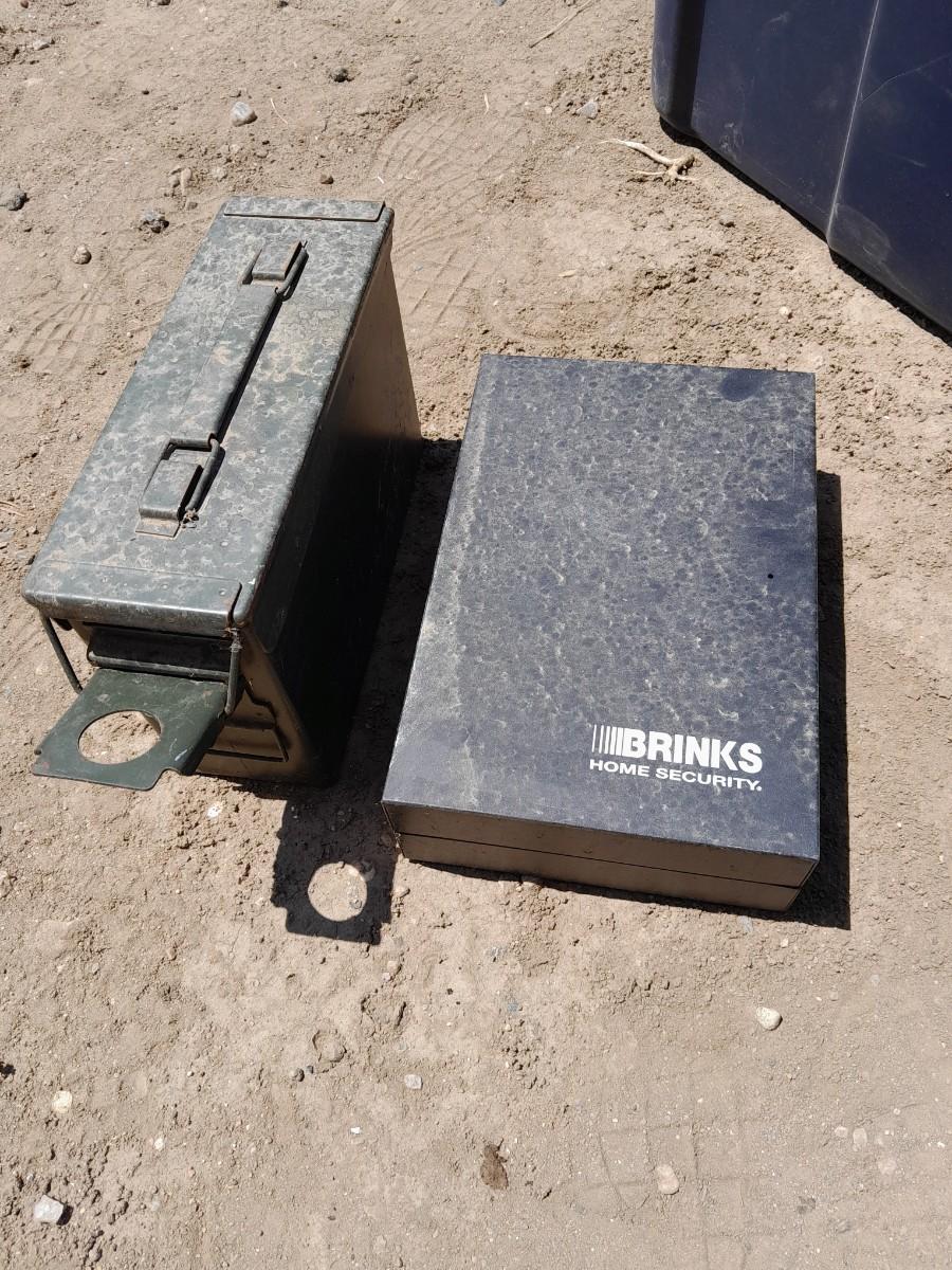 METAL AMMO BOX AND METAL BRINKS SECURITY KEY STORAGE (box currently opens, but unknown combination)
