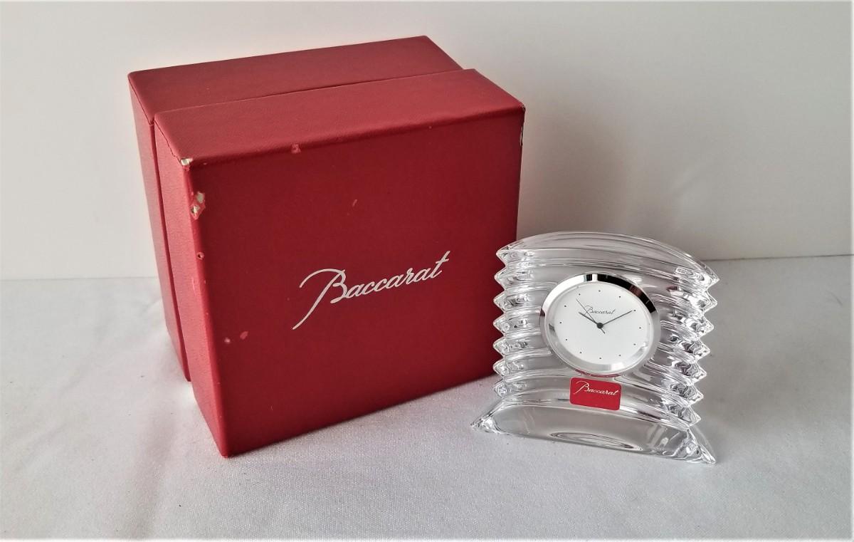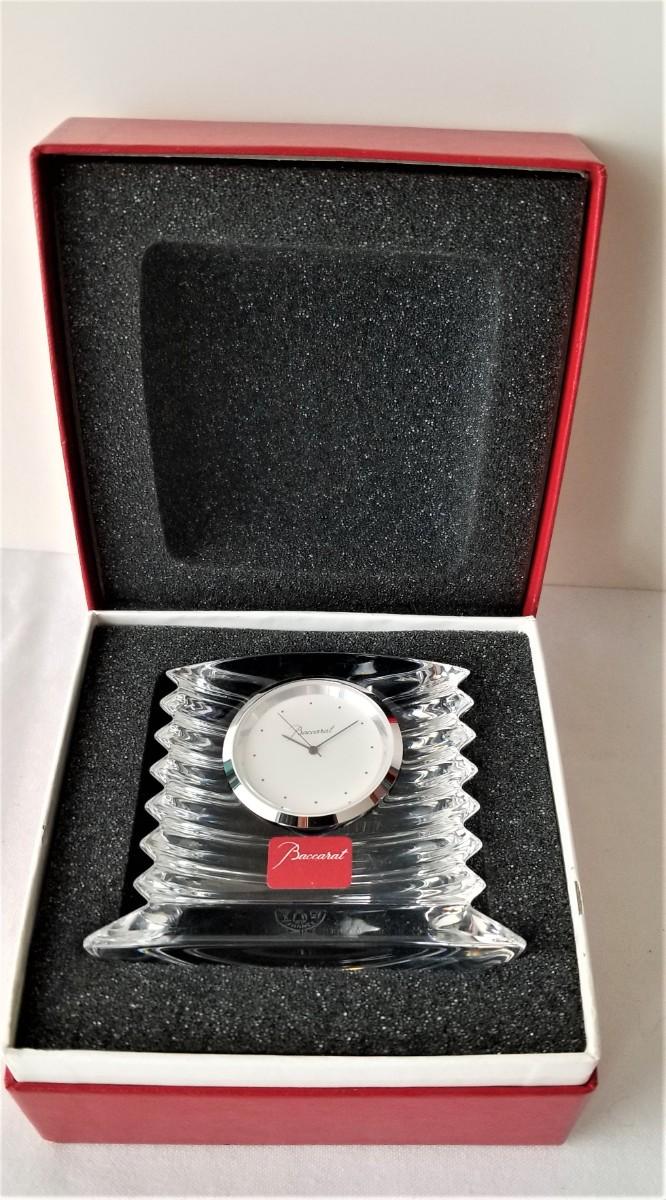 A bit of wear to the box - Like new BACCARAT crystal clock - needs battery. 2.5" tall, 3.25" across