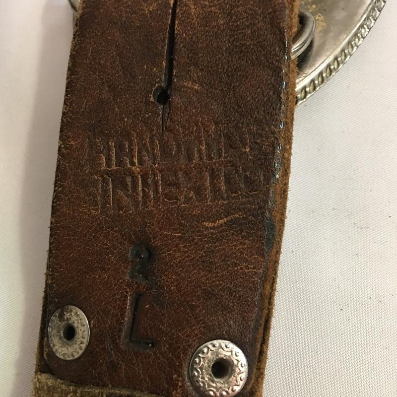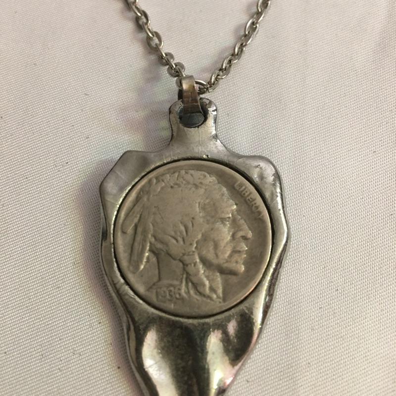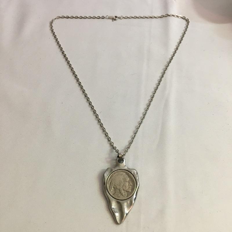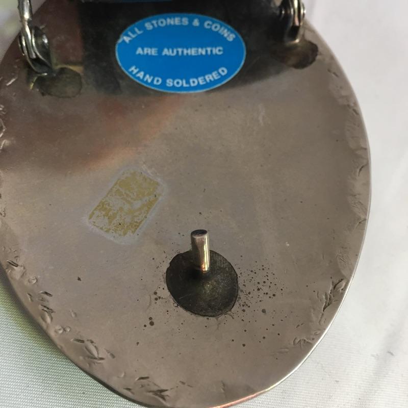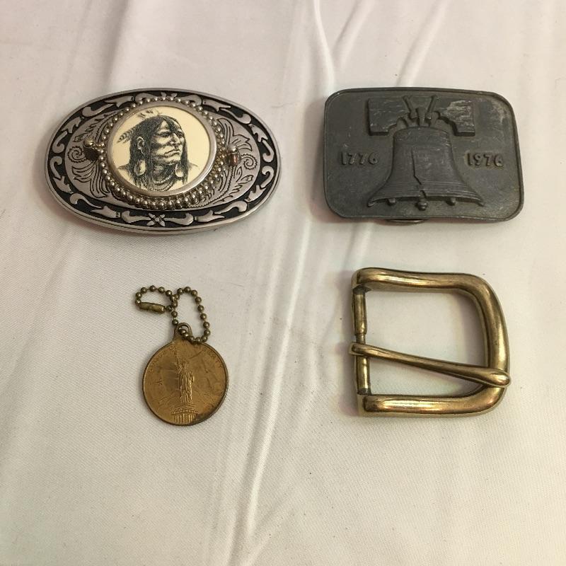 Belts, buckles and more. Lot includes 1936 nickel mounted in a pendant with necklace, brass buckle, two loose belt buckles, belt and buckle with scrimshaw style design on buckle and a belt with red and blue turquoise and Indian nickel buckle. Black Belt is marked 40 and both belts are same length.