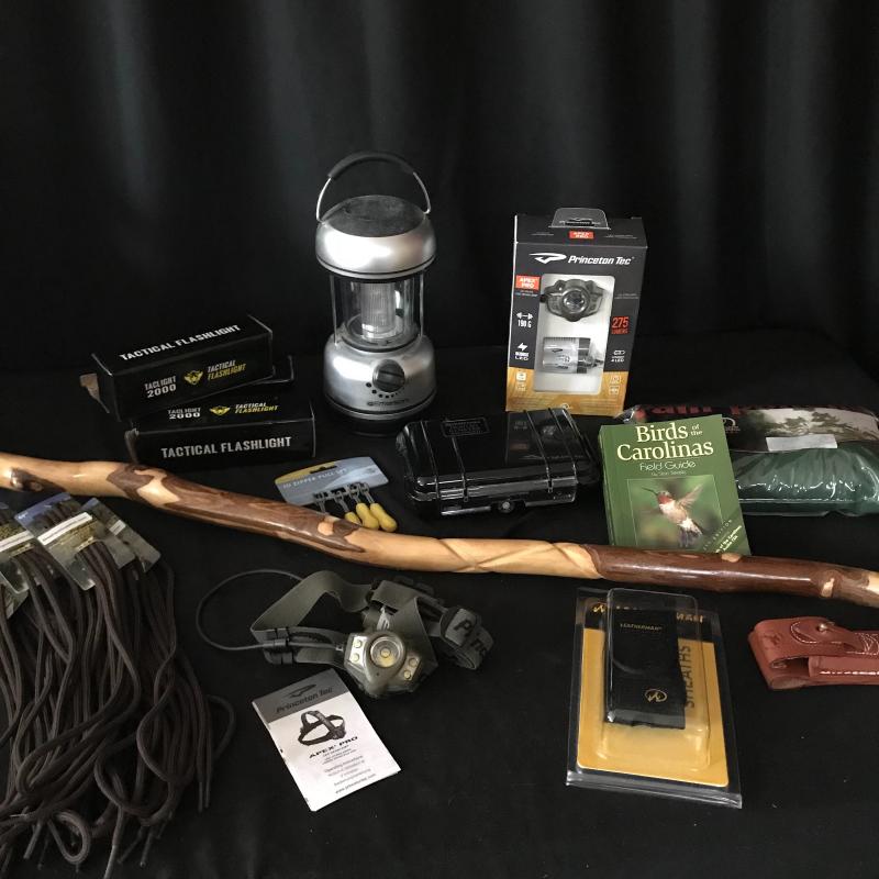 Equip yourself for your next family campout! Lot includes battery powered lantern, two Princeton Tec headlamps, three tactical flash lights, hiking laces, Leatherman sheath, birding book, rain pancho, handcarved walking stick and more. See pics. Local pickup only.