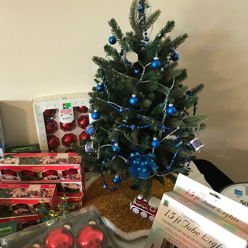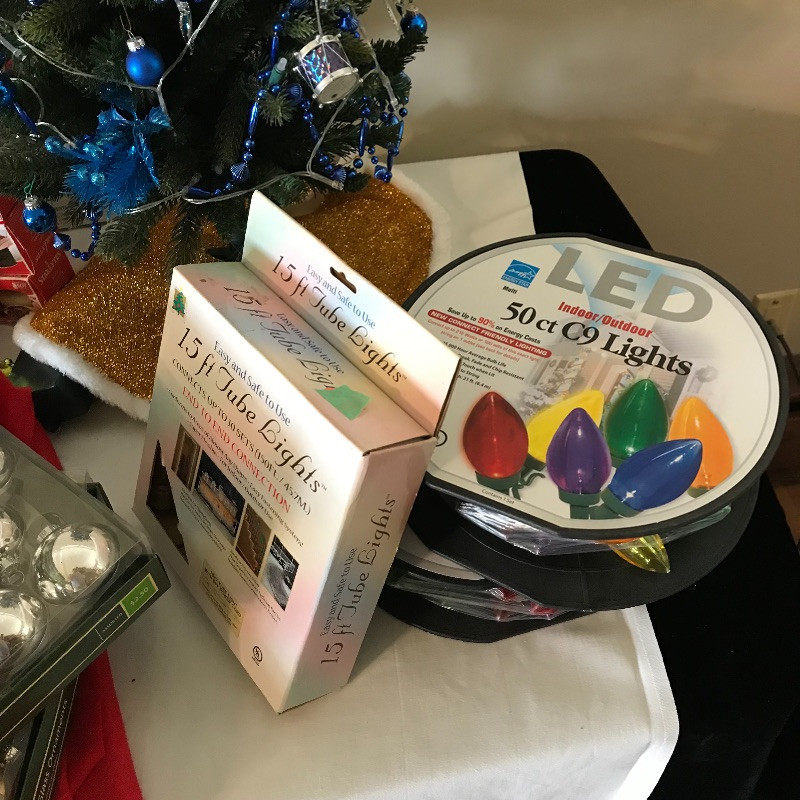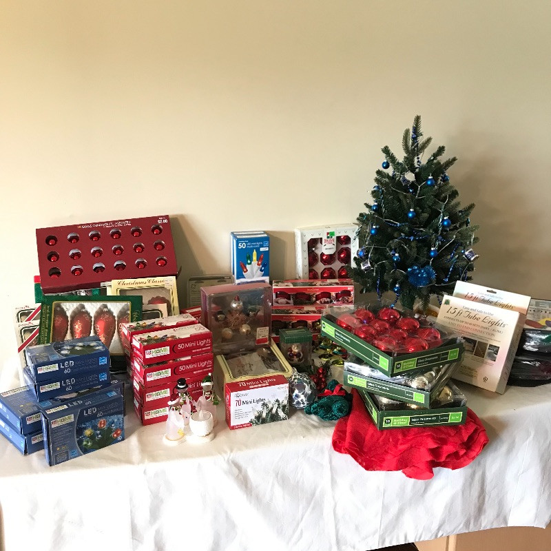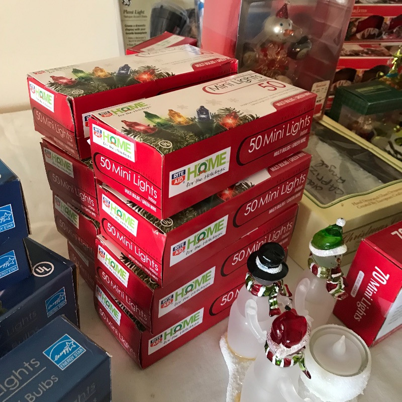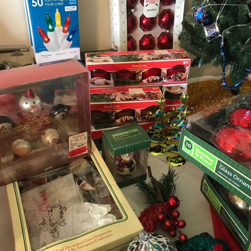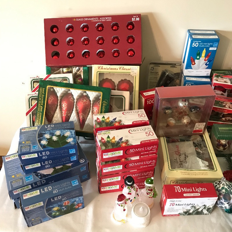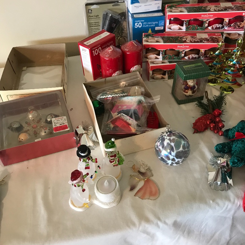 Christmas will be here before you know it, so why not plan ahead with this assortment of decorations that consists of a 29” tree that has battery operated lights with dimmer which we cannot verify that it works as batteries were not in. Also included are a good amount of ornaments and lots of string lights, candles and more goodies. See images. Local pick up only.