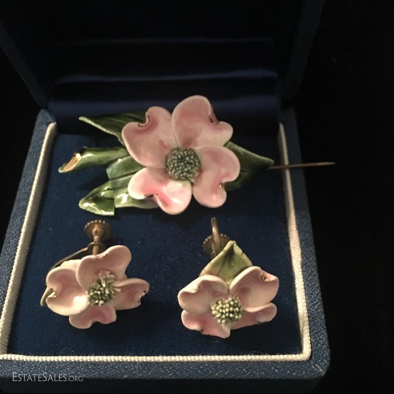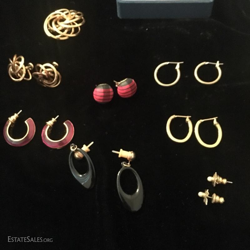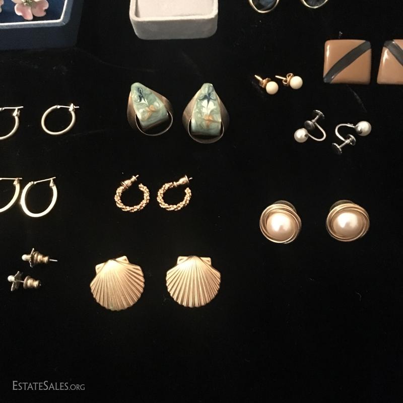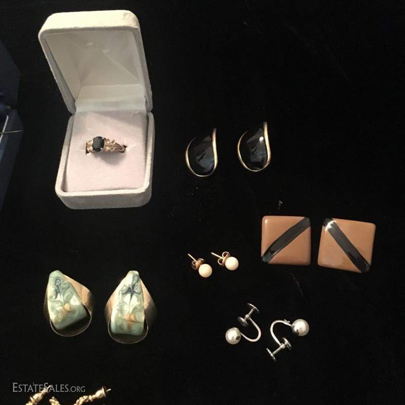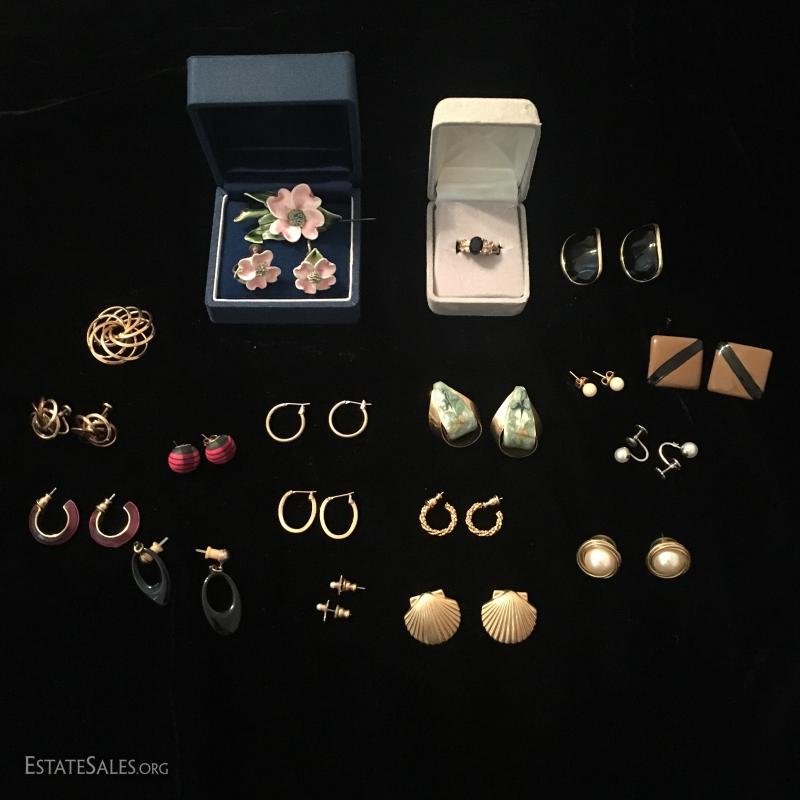 16 pairs in total, both clip and pierced. One gold swirl set with matching pin, one clay floral set with a pin. One ring size 6.5 gold with black stone. This lot is available for shipping or local pick up in Asheville, NC.