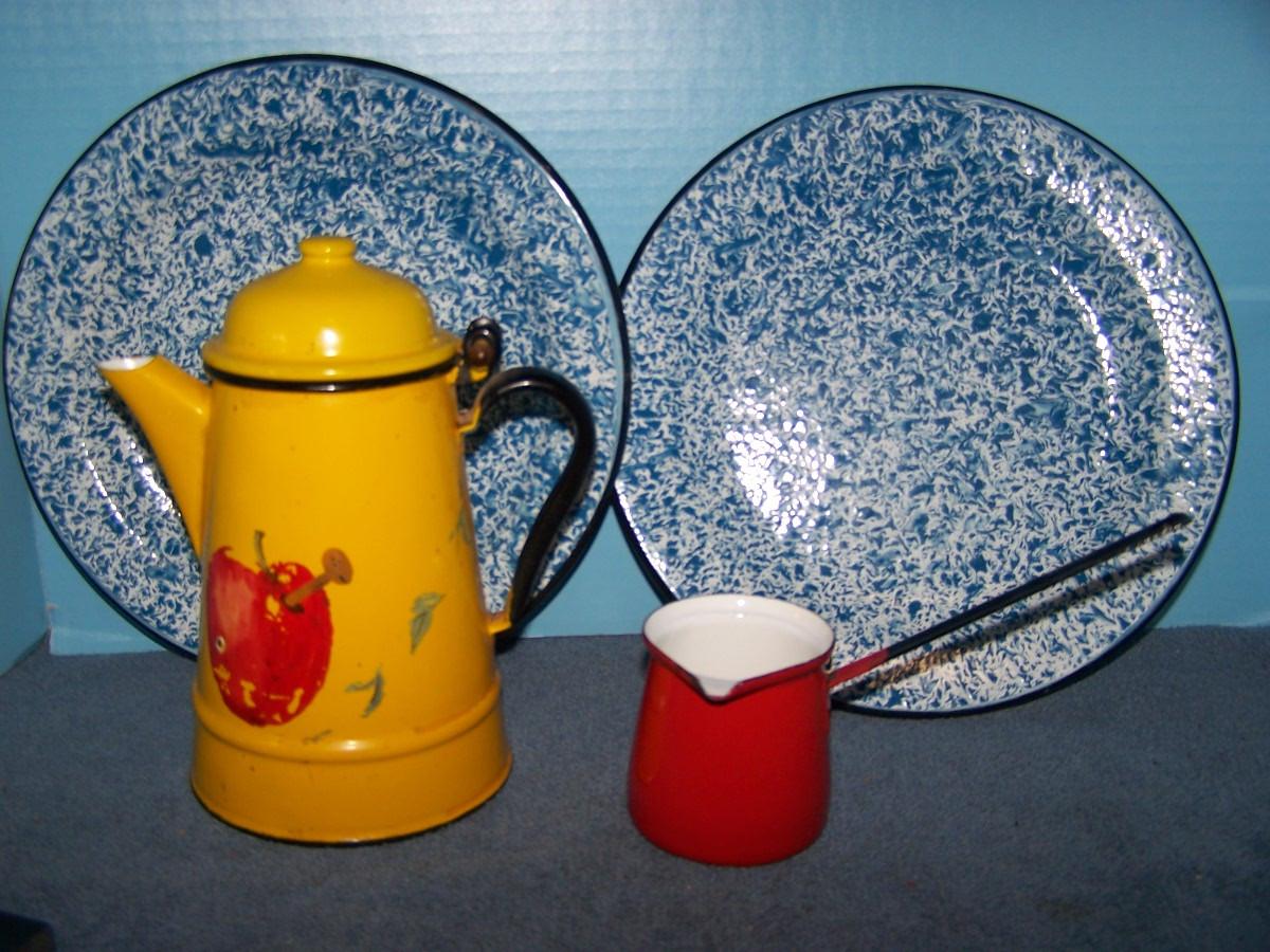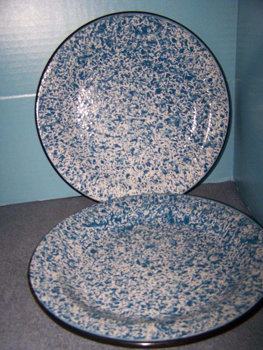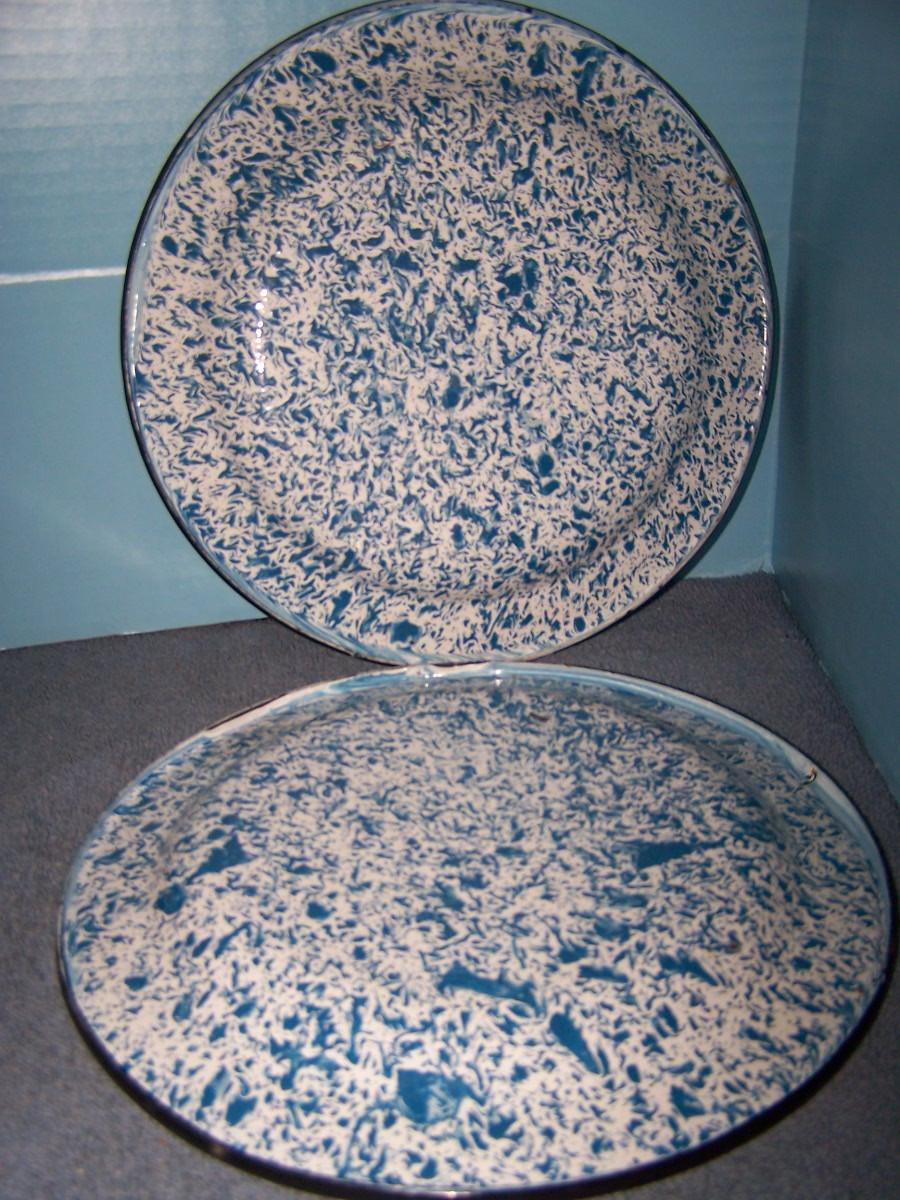 THIS IS GREAT VINTAGE GRANITE & ENAMEL WARE!!! PLATES ARE 10 1/4'' ACROSS... LIGHT WEAR/SPOTS/FLAKES..