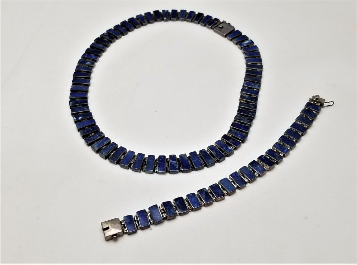 Heavy Sterling Silver and polished Lapis Necklace with matching bracelet - actually these pieces are marked "950" which means they are 95% pure silver - higher grade than sterling. Necklace designed to lie flat like a collar. Necklace about 16.5" long, bracelet is 6.5" long. Good used condition. The silver could use a polish.