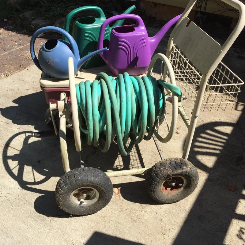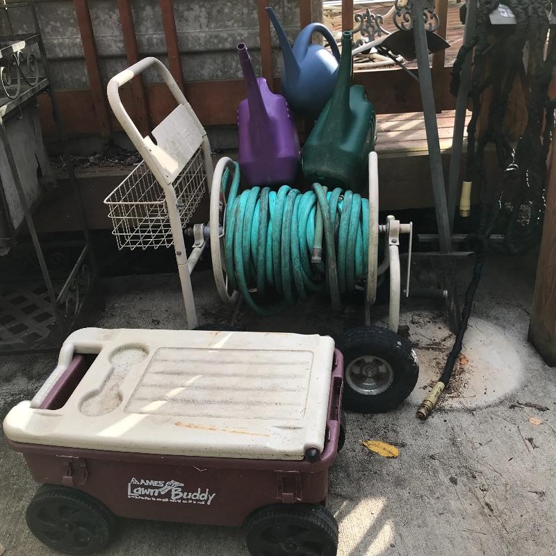 Great assortment of hoses and hose storage pieces here. Included are 2 metal hose holding stands that are designed to be staked in the ground and a third hose on a metal frame with wheels so you can transport it anywhere it’s needed, please note the tires are flat on this item. Also included are a hose sprayer attachment, 3 plastic watering cans and a Lawn Buddy - plastic seat/storage for the gardener.