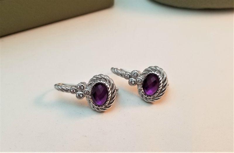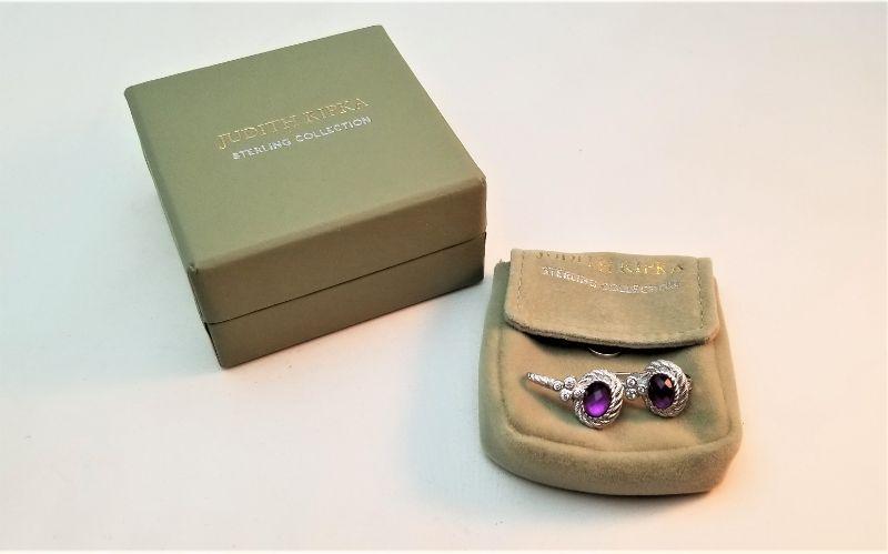 Pretty pair of Judith Ripka sterling earrings with CZ accents and faceted purple center stone. The measure about .75 inches long and are in the original packaging. They look new.