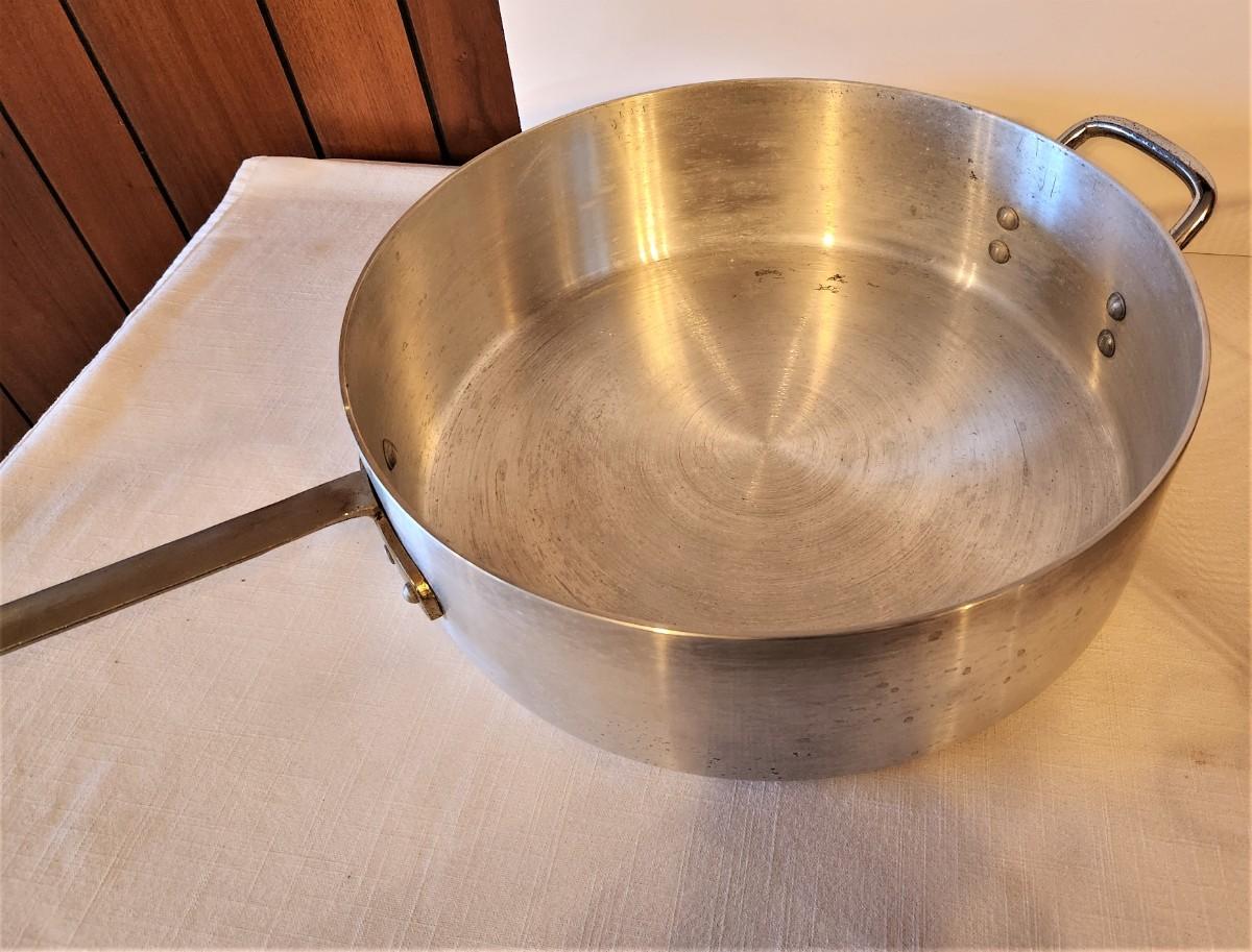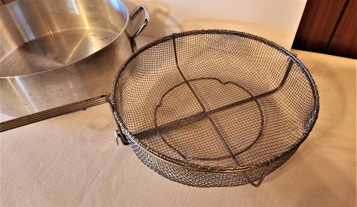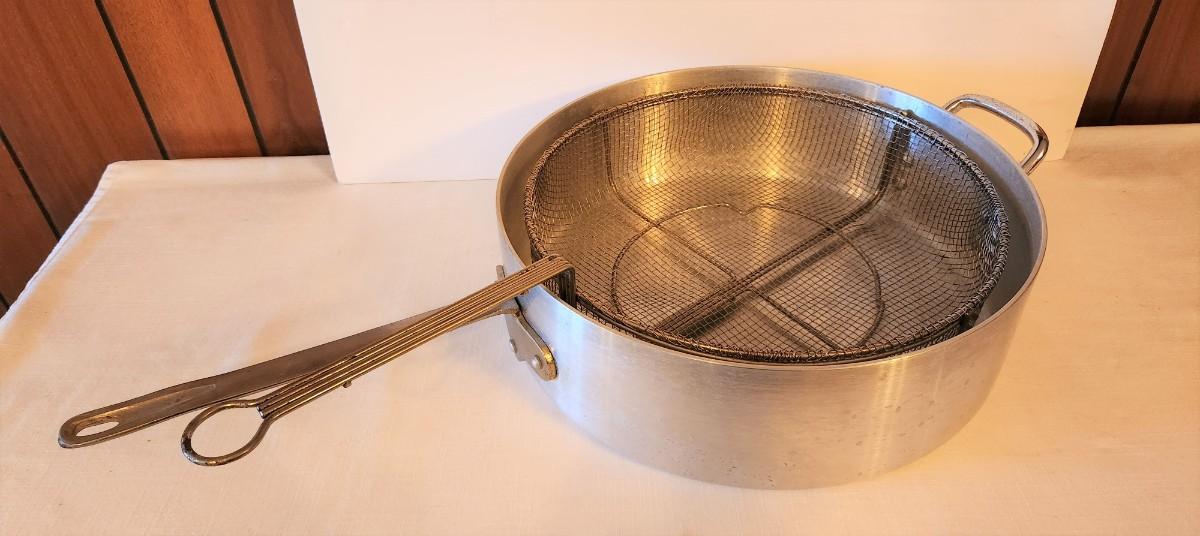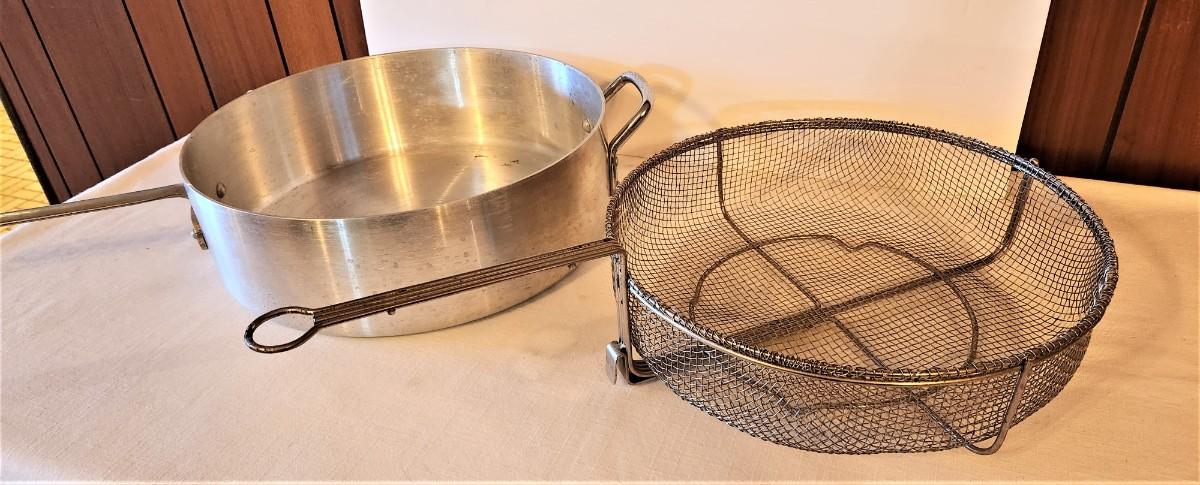 Nice large aluminum fryer (26" long handle to handle, 14" across) with strainer/basket. Both in good condition.