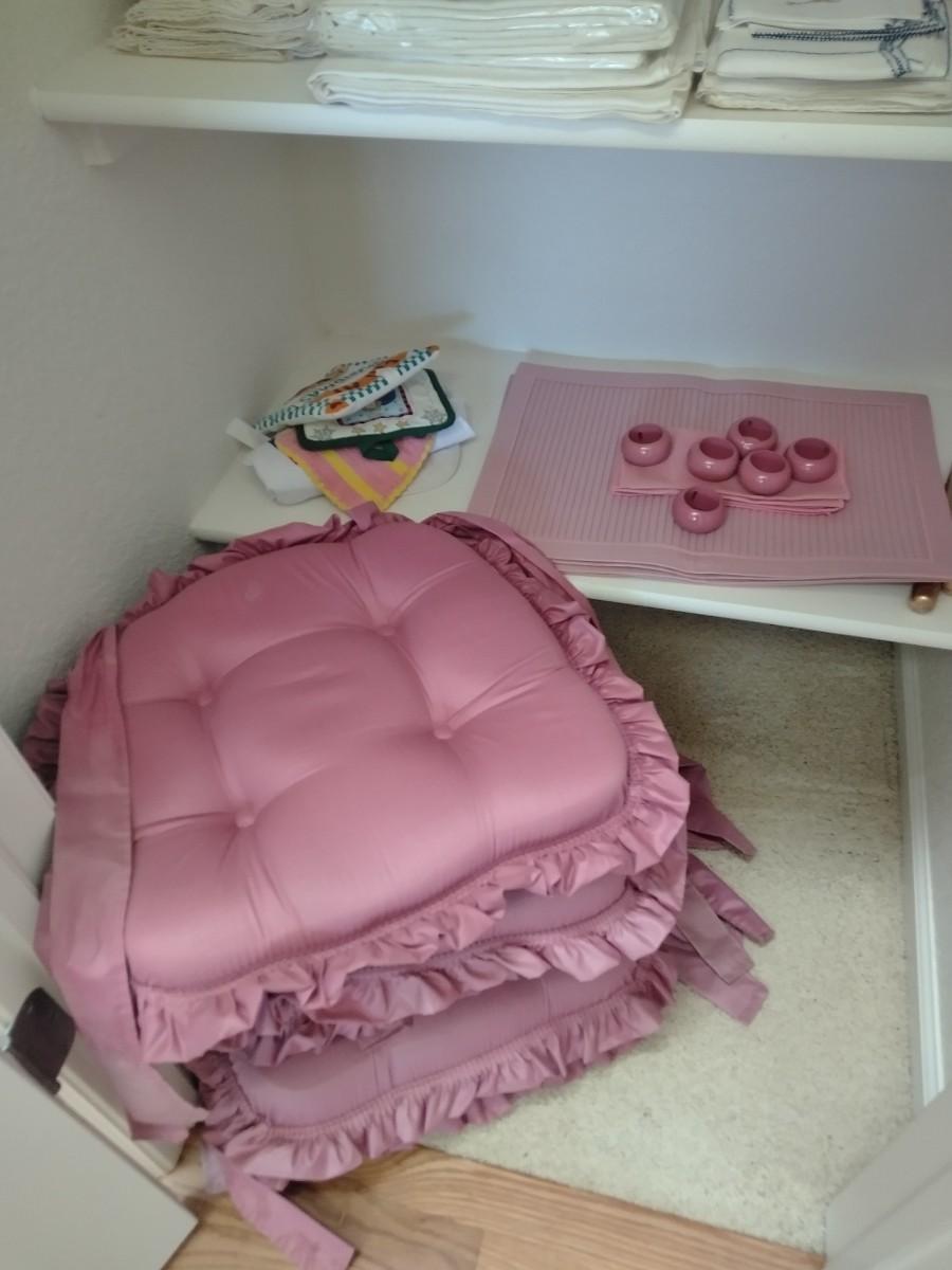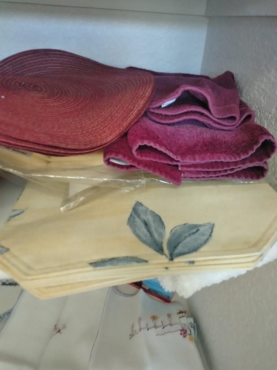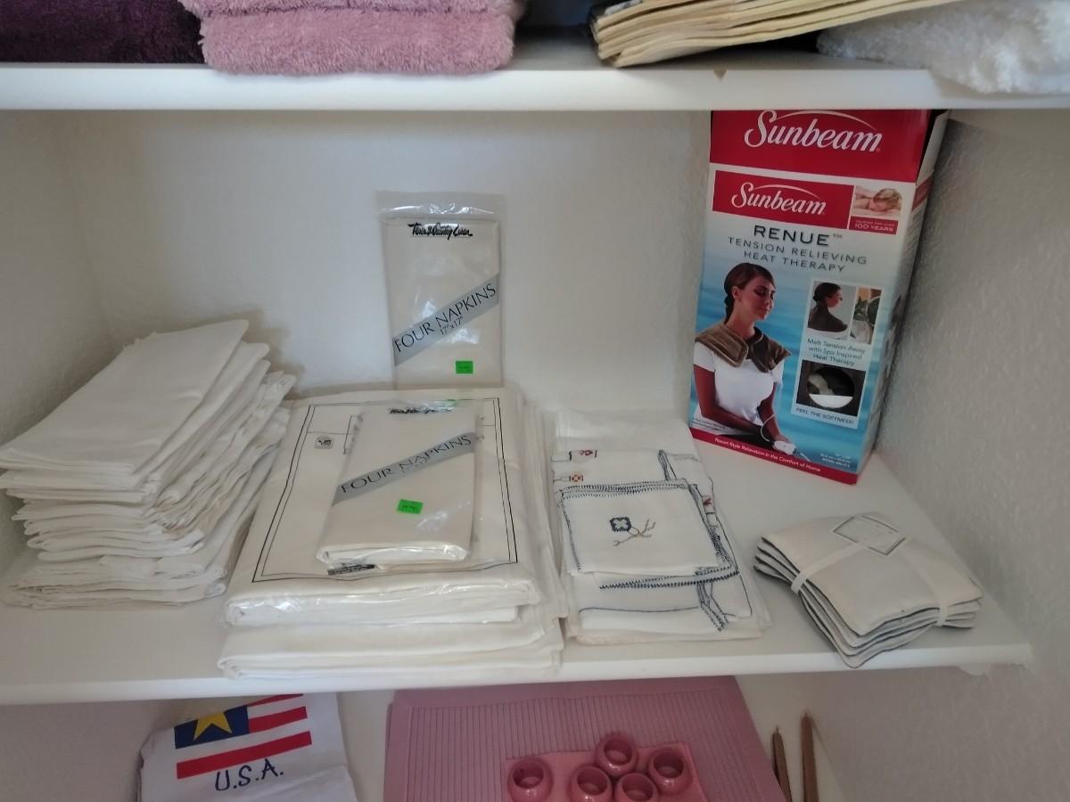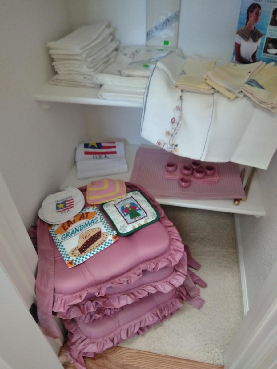 LINEN IN CLOSET. INCLUDES DININGROOM CHAIR PADS, TOWELS, DISH CLOTHS, TABLE LINENS, AND MORE.
