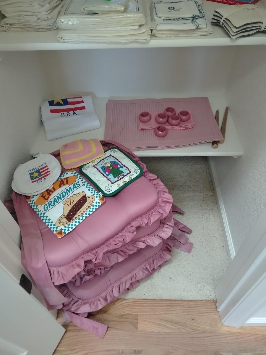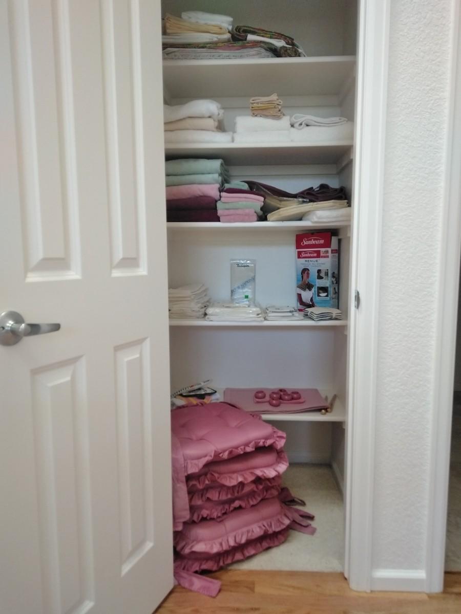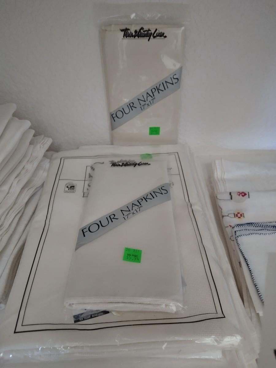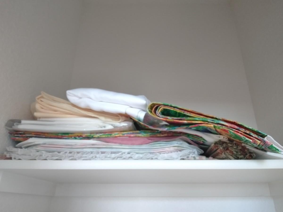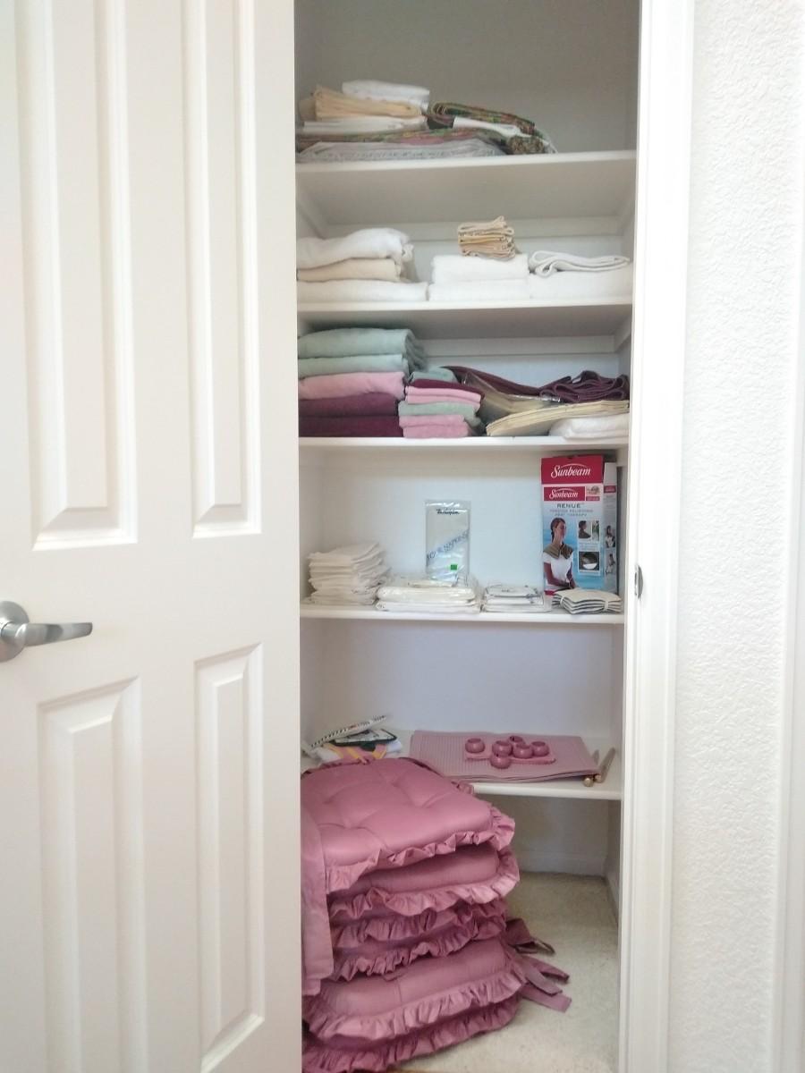 LINEN IN CLOSET. INCLUDES DININGROOM CHAIR PADS, TOWELS, DISH CLOTHS, TABLE LINENS, AND MORE.