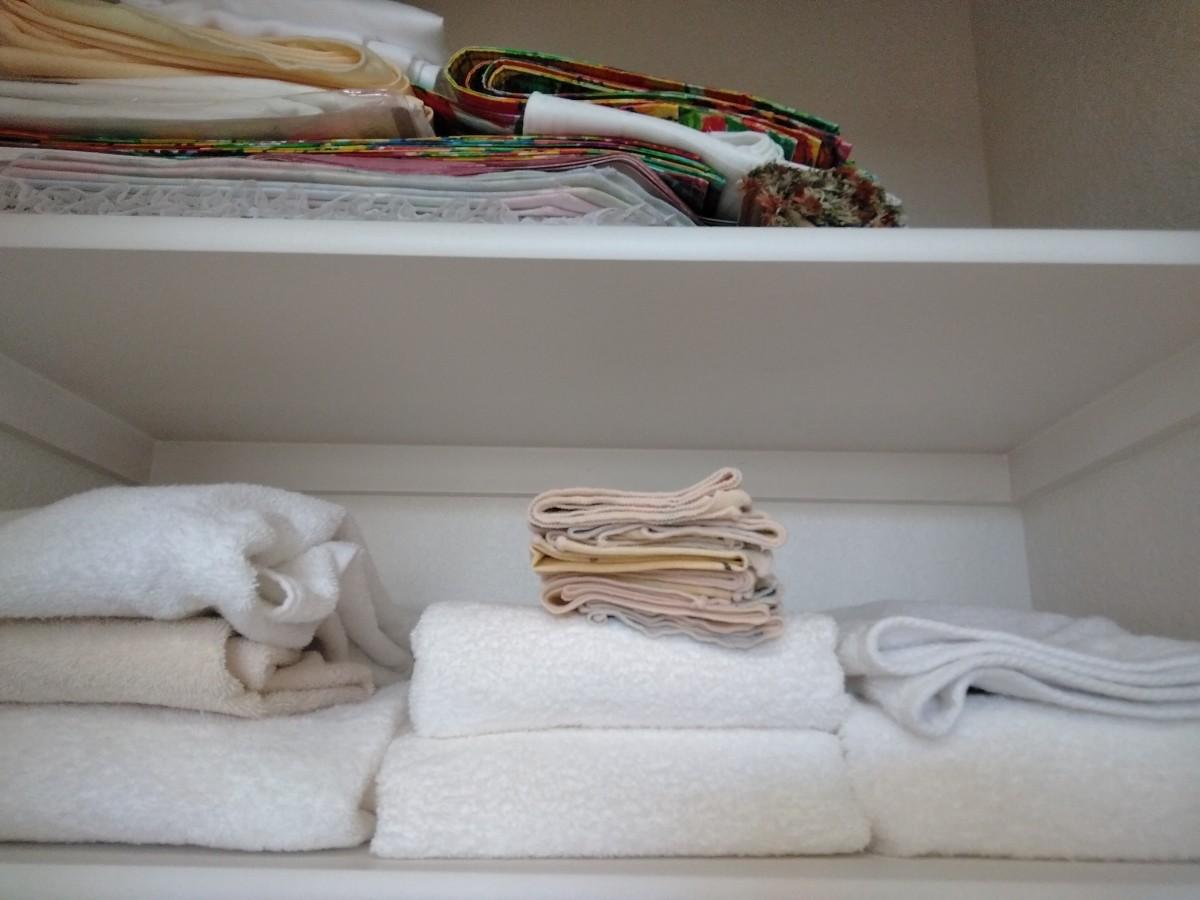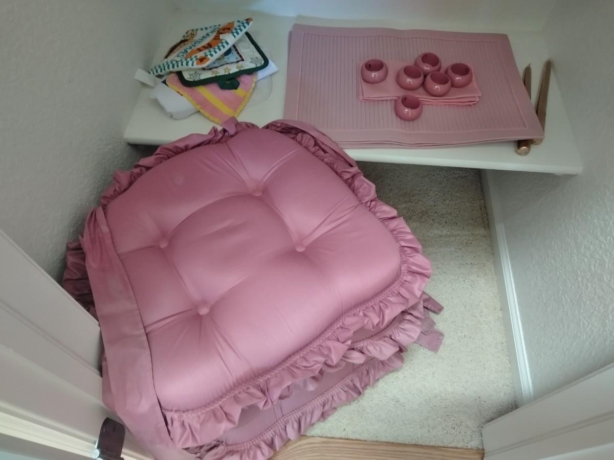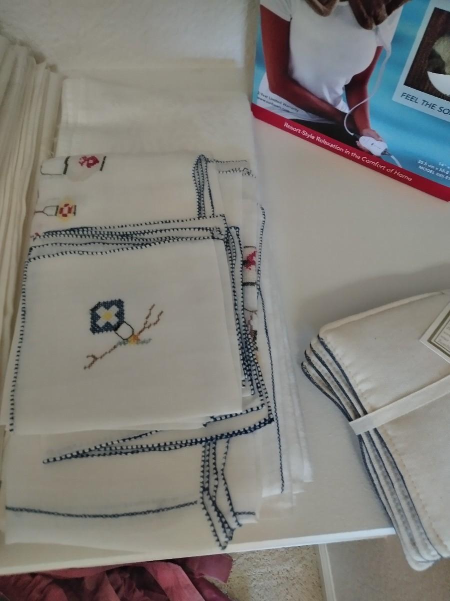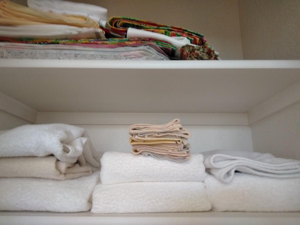 LINEN IN CLOSET. INCLUDES DININGROOM CHAIR PADS, TOWELS, DISH CLOTHS, TABLE LINENS, AND MORE.