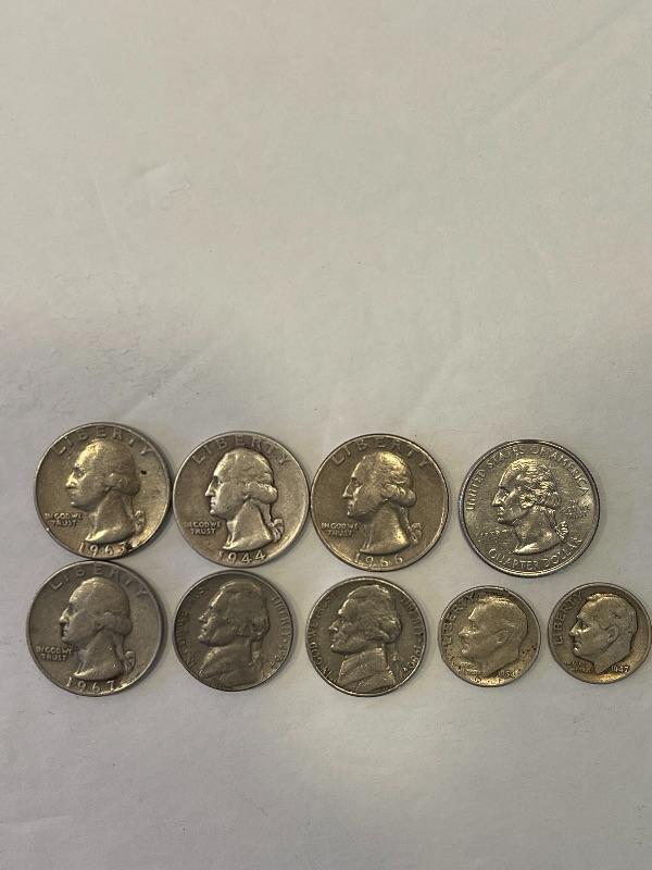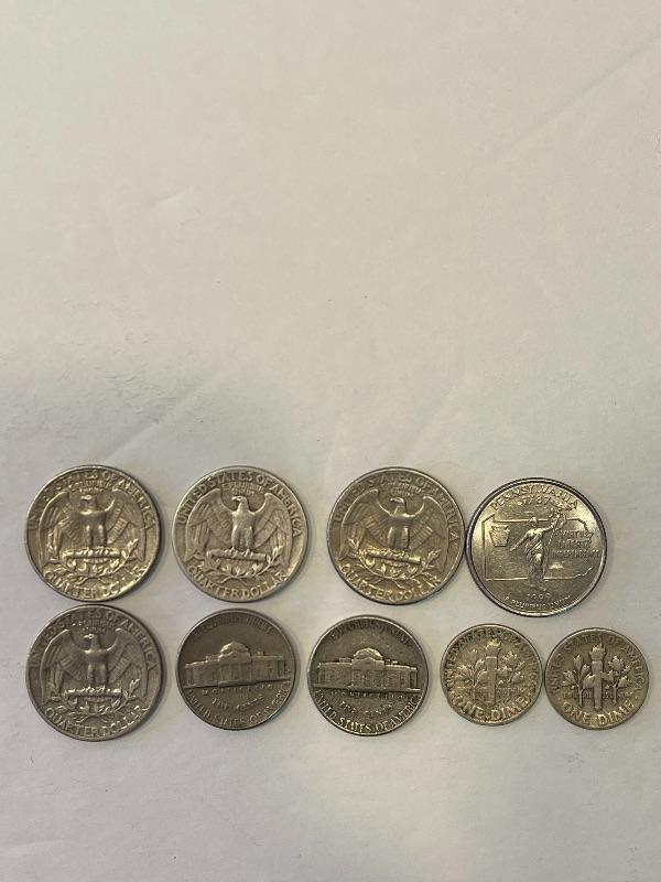 lot of (5) Washington quarters, (2) Jefferson nickels, (2) Roosevelt dimes.