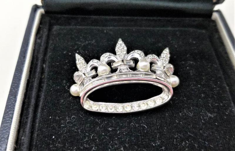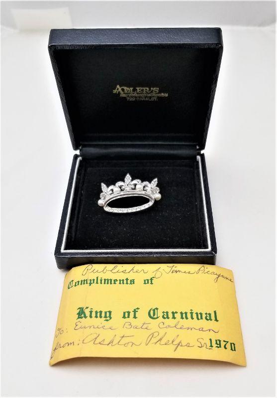 The card reads "Publisher of Times Picayune - to Eunice Bate Coleman from Ashton Phelps, Sr. - Complments of King of Carnival 1970. Original Adlers box. Brooch marked "Boucher." Lovely crown design - all stones present. Brooch measures 1.5 inches across.