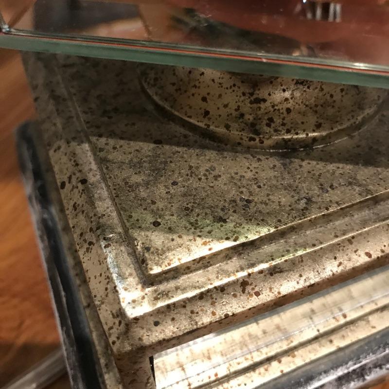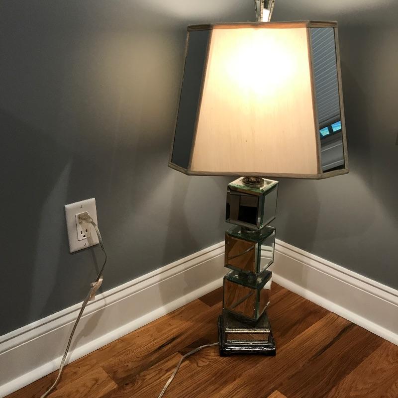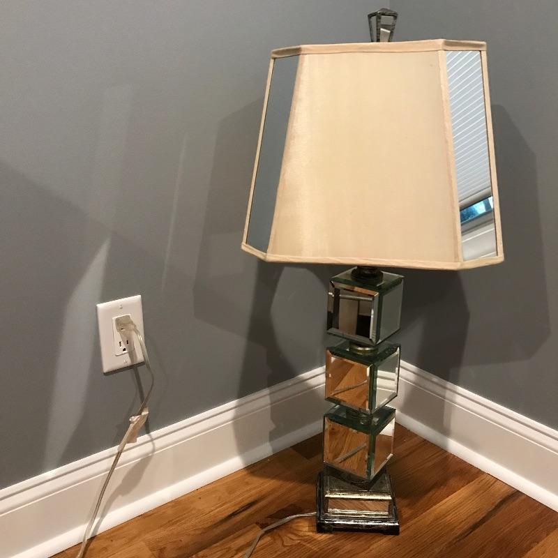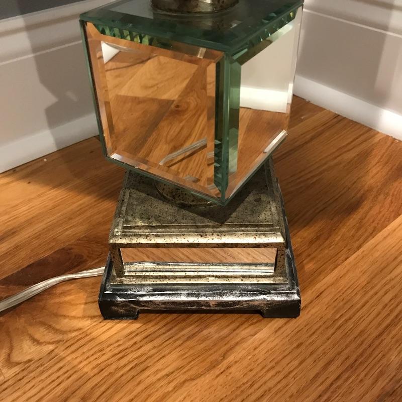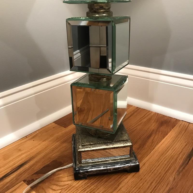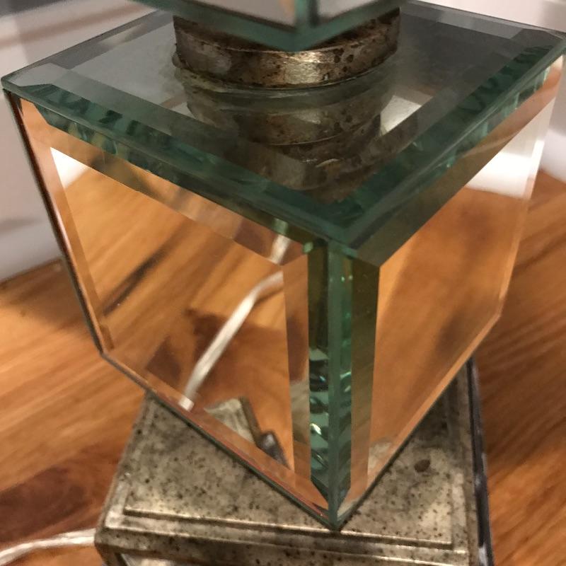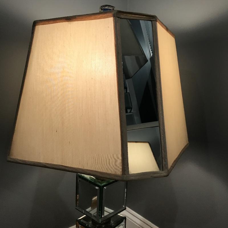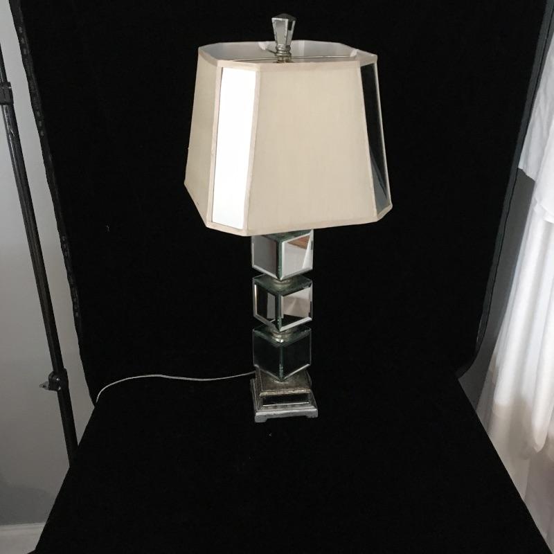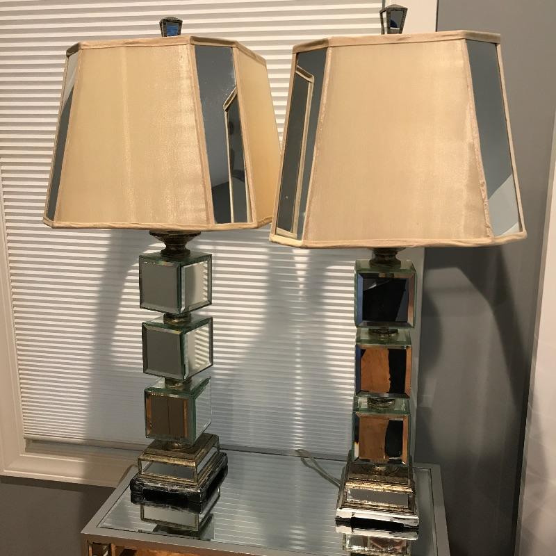 Pair of table lamps with mirrored squares and mirrors on corners of shades. Lamps have three way bulbs so you can get just the amount of light you need. Shades are an off-white color and also have some mirrors on each corner to finish the lamps look!. Base has a speckled bronze look to accent the mirrors. Lamps measure 33” tall with a 5.75” x 5.75” base.