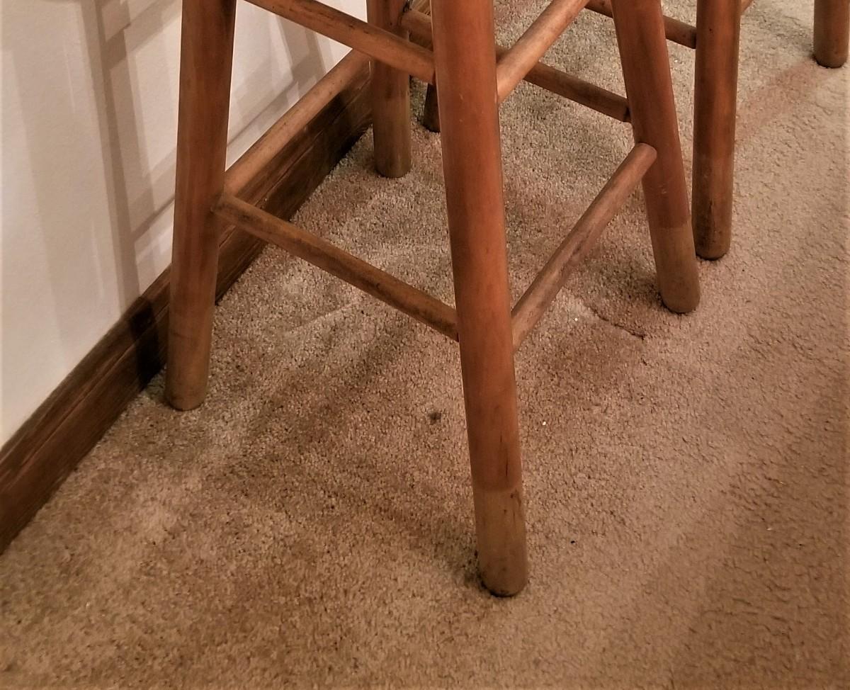 Pair of vintage bar stools in the traditional style. Sturdy, 29.5" tall, seat 12" across - seats in very good condition. Note: There is some fading on legs at bottom. Could have been in some standing water at one time, though this house has never flooded. Lightly faded and stools could be painted, but wanted to mention.