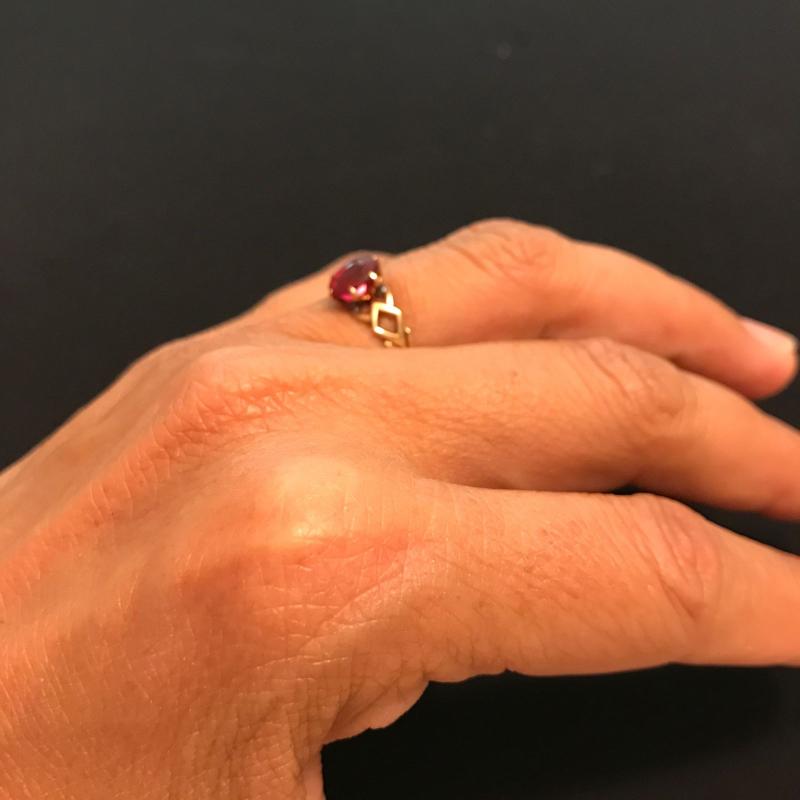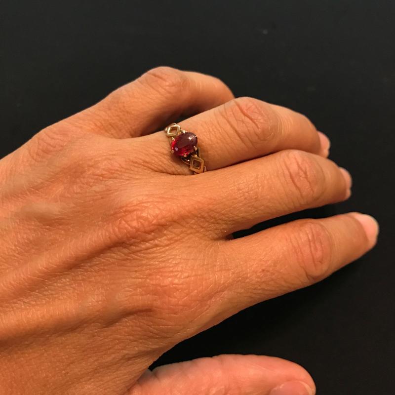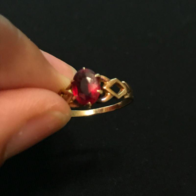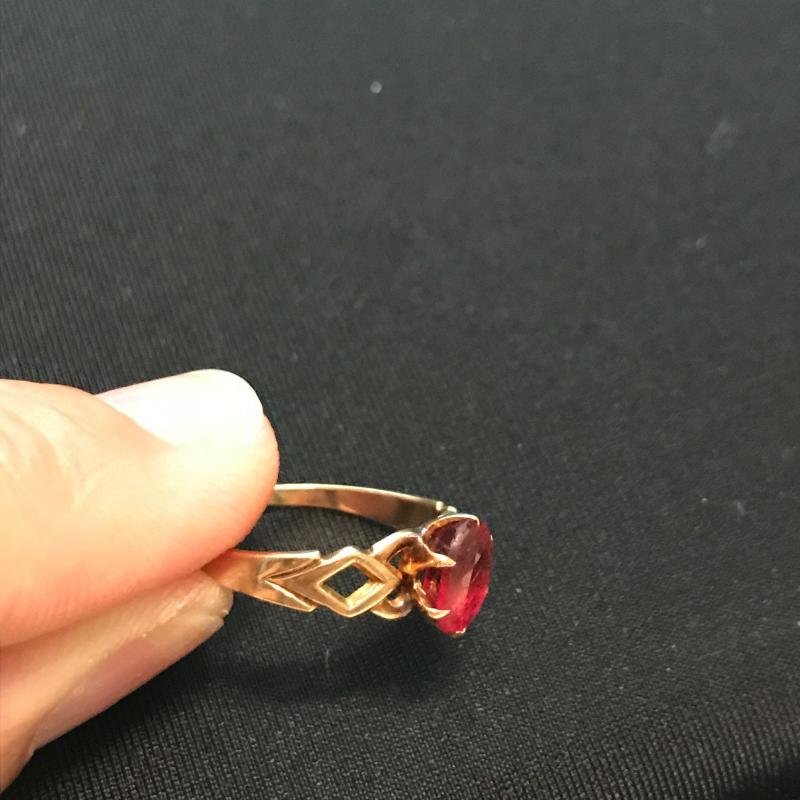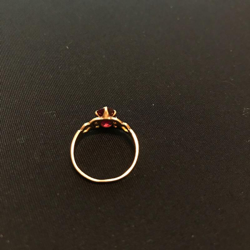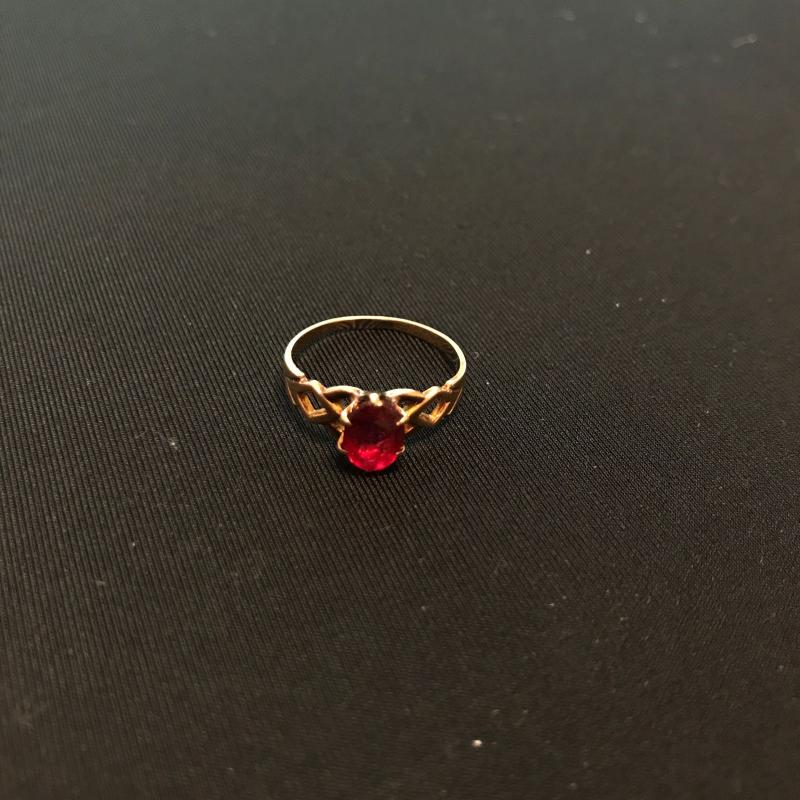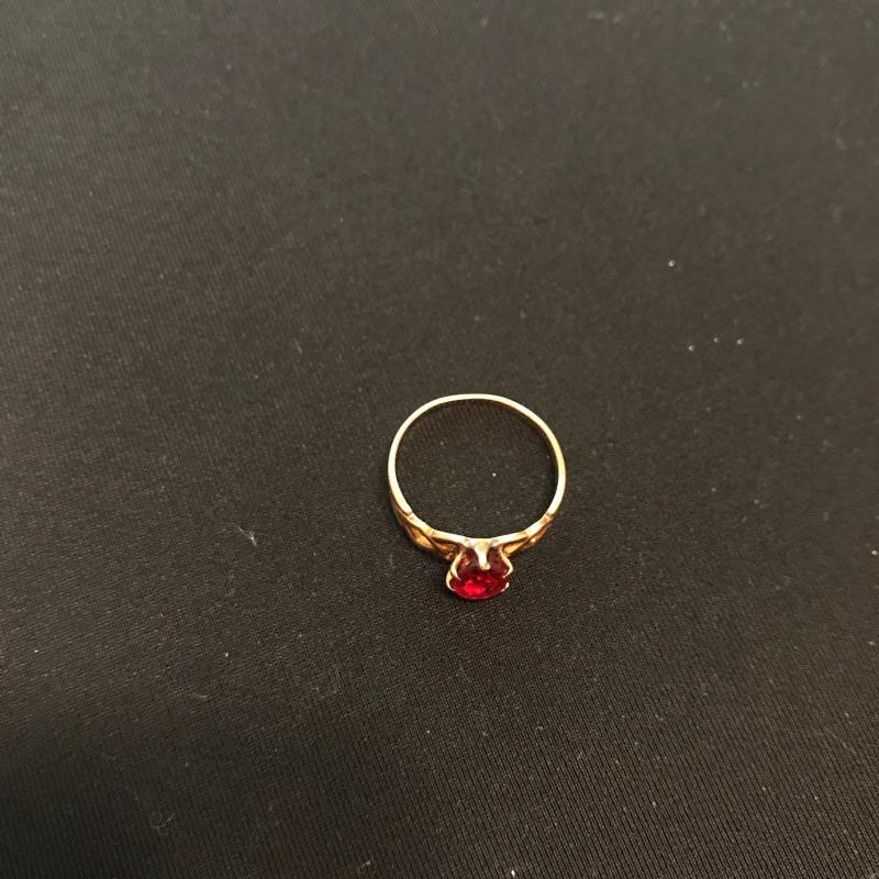 Red stone in gold setting. No marks on band. See photos for details. Shipping available.