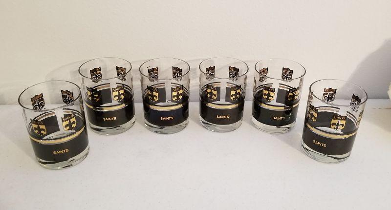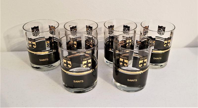 I could find no other examples of this design ANYWHERE - six vintage New Orleans Saints bar glasses - nice condition - each measures 4.5" tall. 1960's.