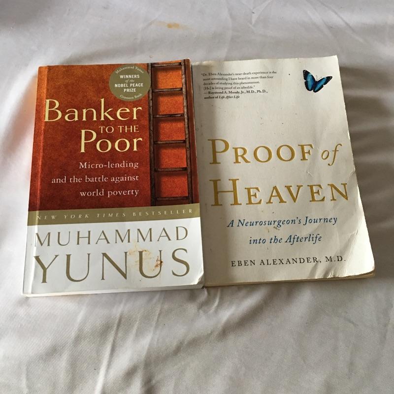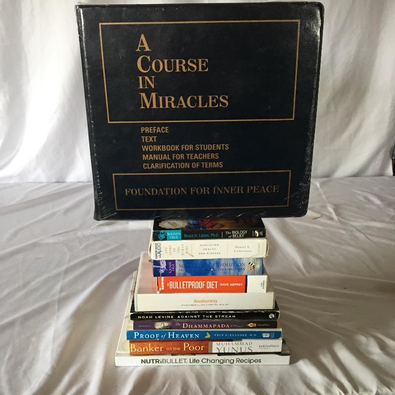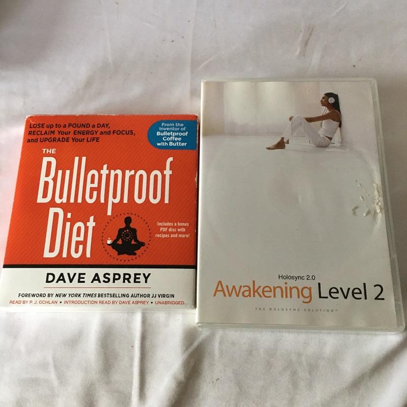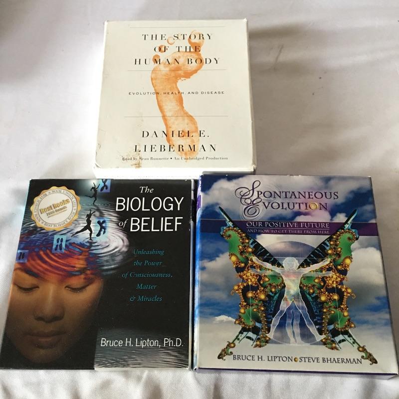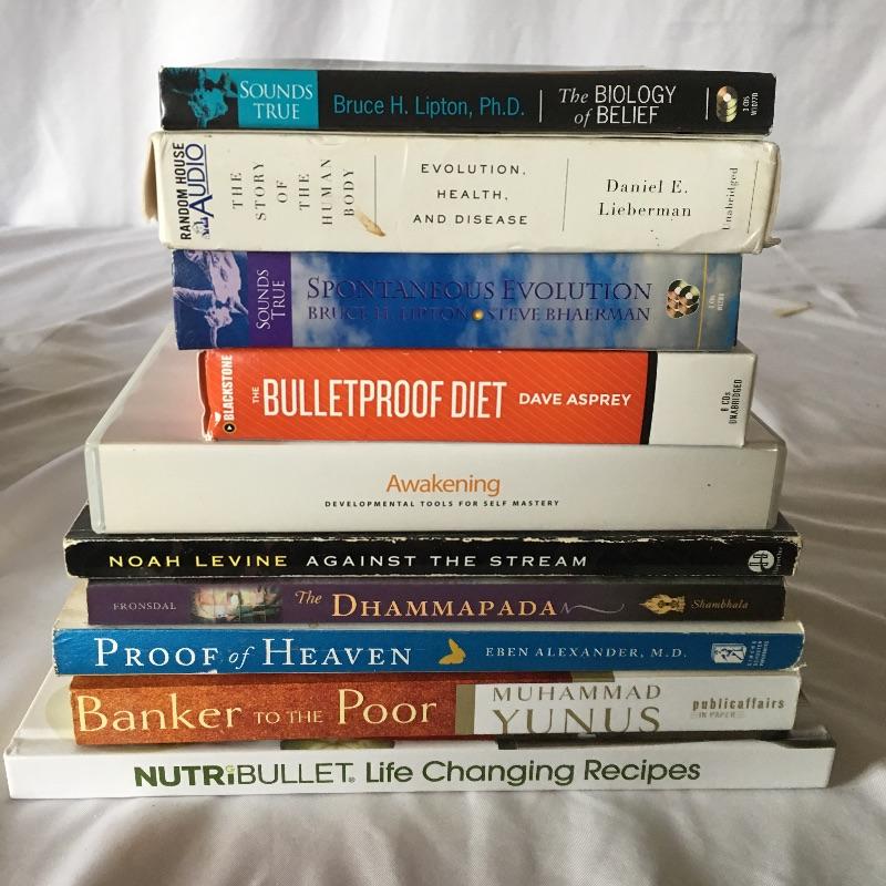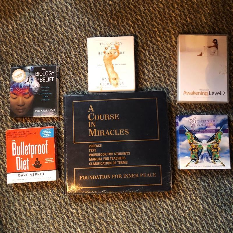 This collection of self help books and CDs includes Awakening Level 2, NutriBullet Recipes, The Story of the Human Body, The Bulletproof Diet, Banker to the Poor, Proof of Heaven, Spontaneous Evolution and more. All CDs are captured in the last photo (bulletproof diet, biology of belief, story of the human body, spontaneous evolution, awakening level 2 and a course in miracles).