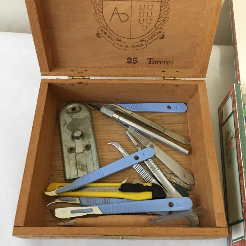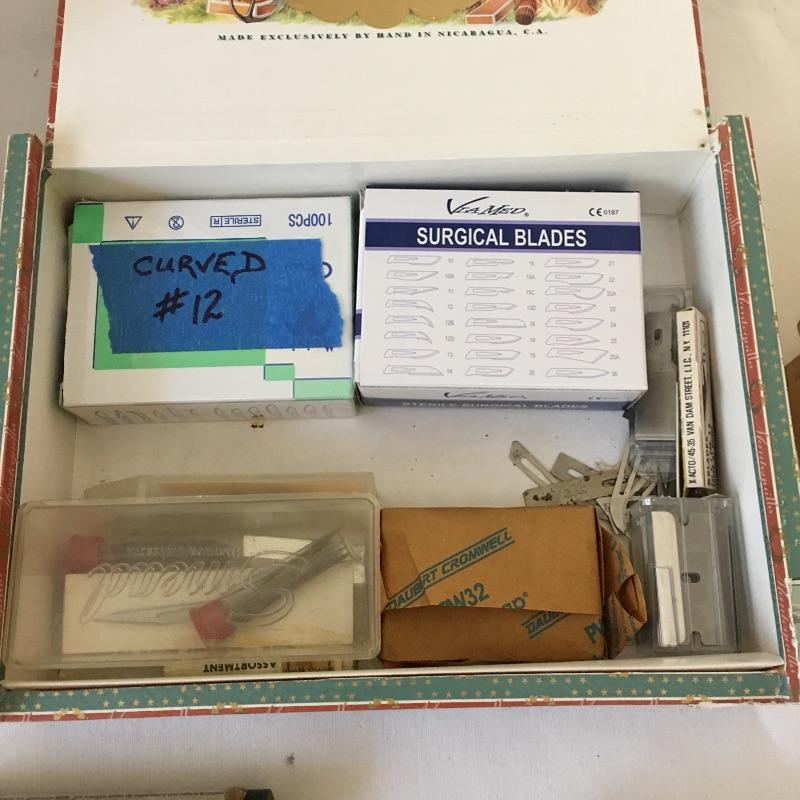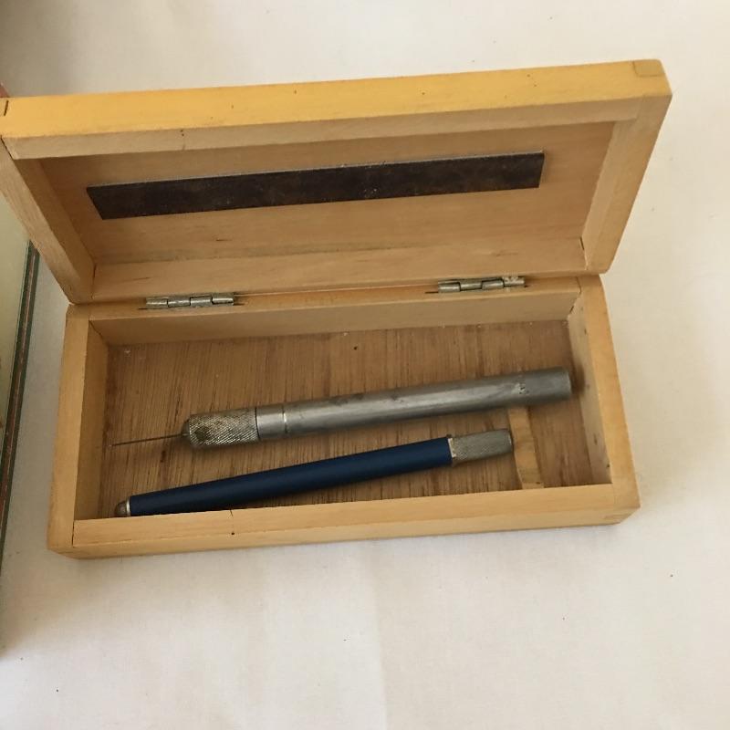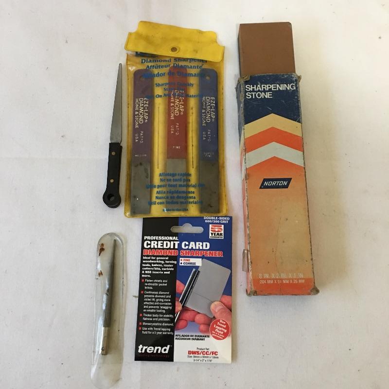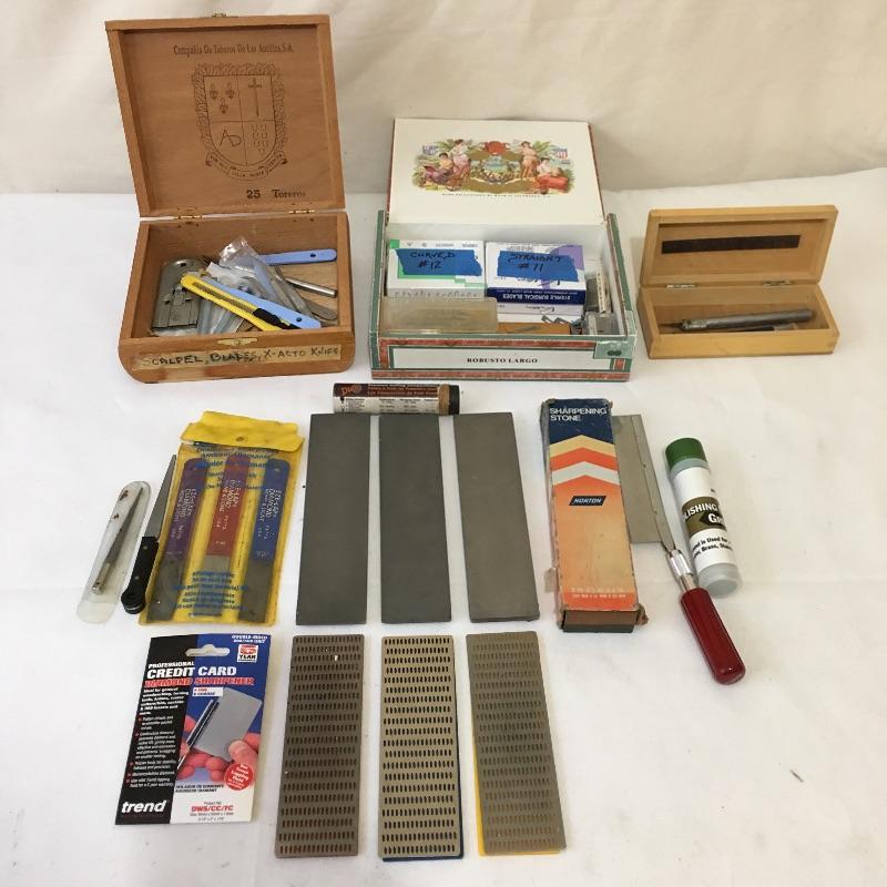 Assortment of sharpening tools including sharpening stone, sharpening files, credit card sharpener with X-Acto type knife and scalpel type knives with extra blades. Keep yourself sharp with this lot.
