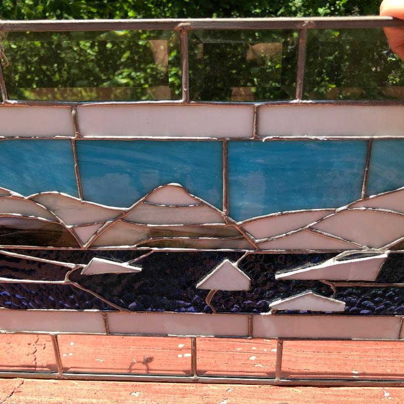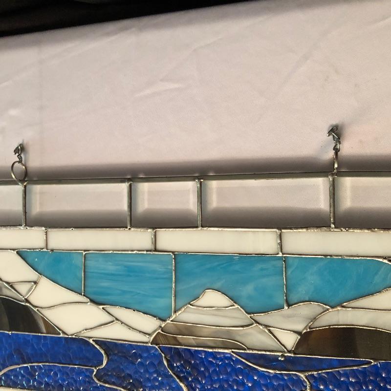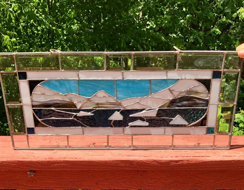 Fresh and attractive, this stained glass panel has snow capped mountains, a lake and sky in pretty shades of blue.