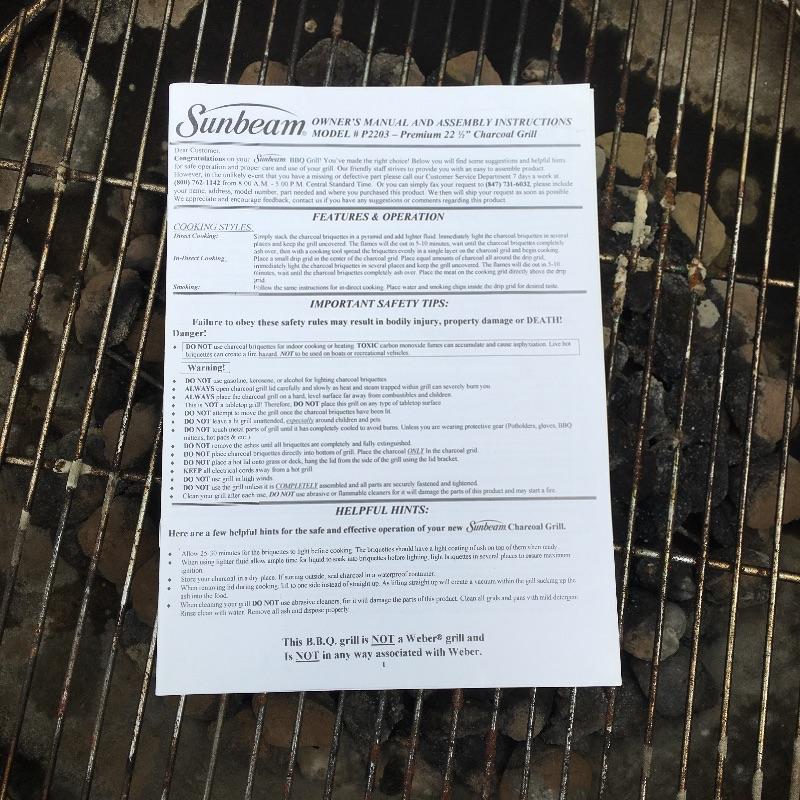 Sunbeam charcoal grill model # P2203. Grill is 22”D. Get ready for summer with a classic charcoal grill on wheels with 20lbs. of Kingsford charcoal.