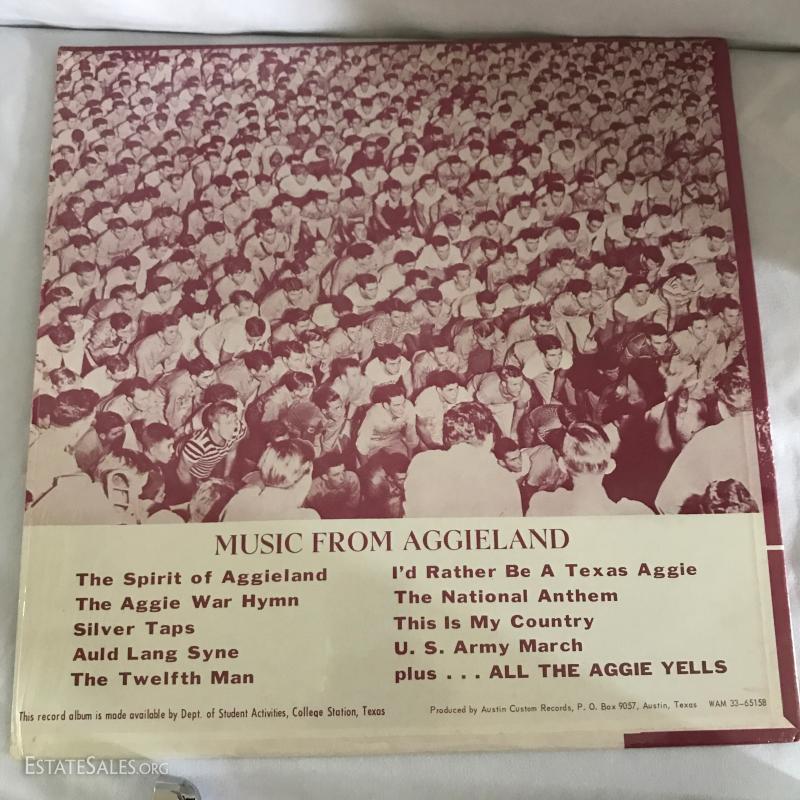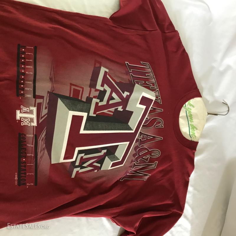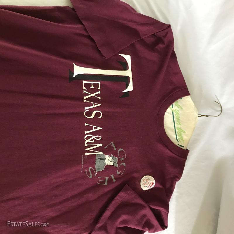 Lot of Texas A&M gear including a mug, car tag holder, LP from Aggieland, lighter, two t-shirts (XL an XXL) and a long-sleeved shirt (XL).